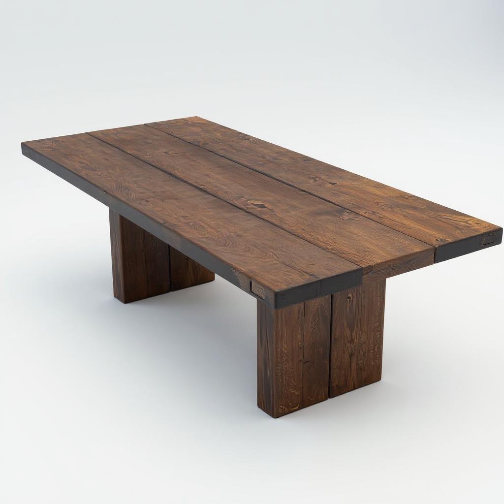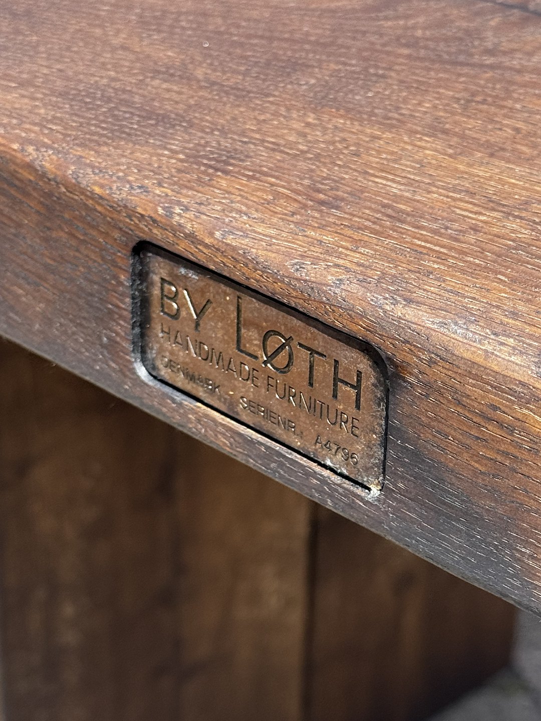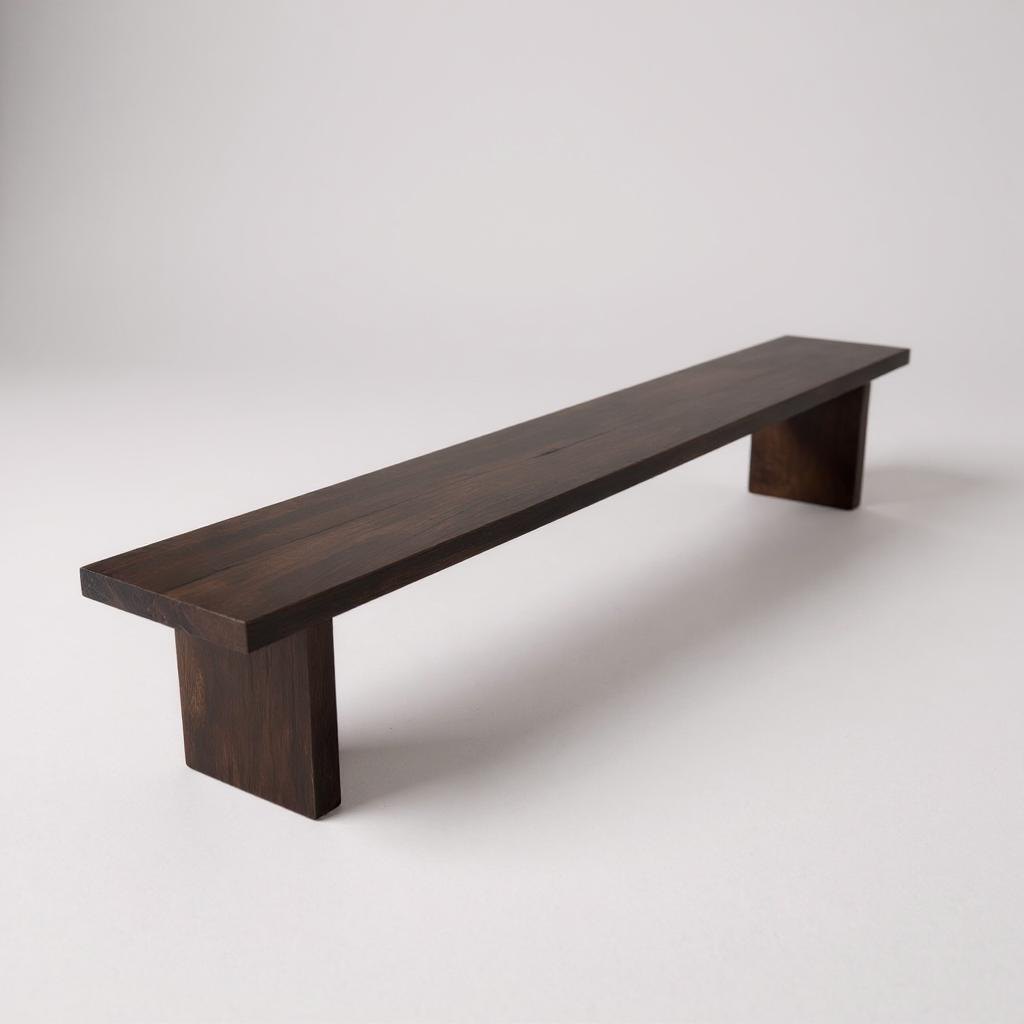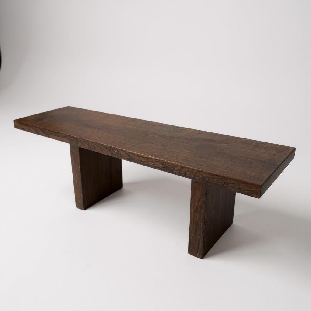 Handmade plank table with matching benches, made of black oiled oak. The set is designed and produced by Danish By Løth, known for their quality and raw aesthetics. Table and benches have solid oak planks with visible grain and a strong base in matching wood.