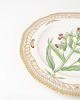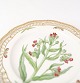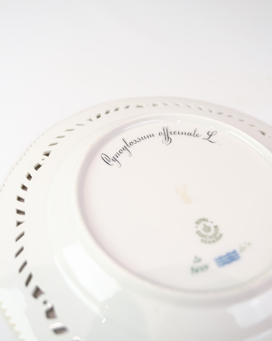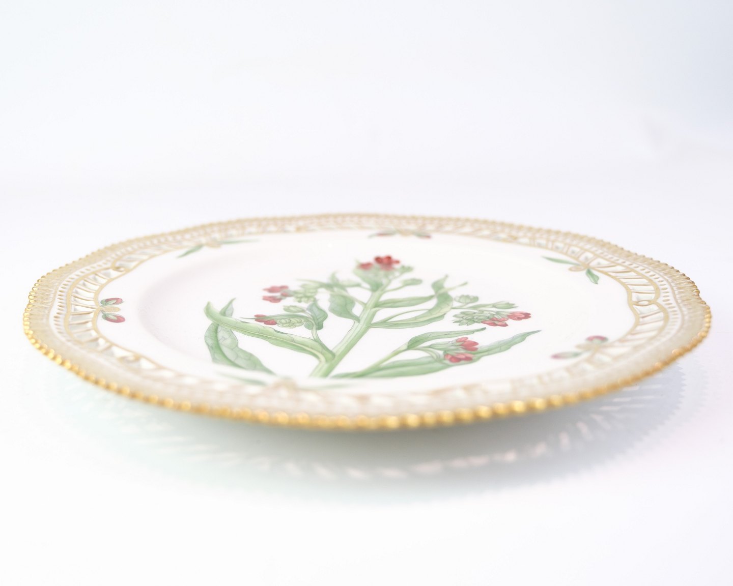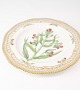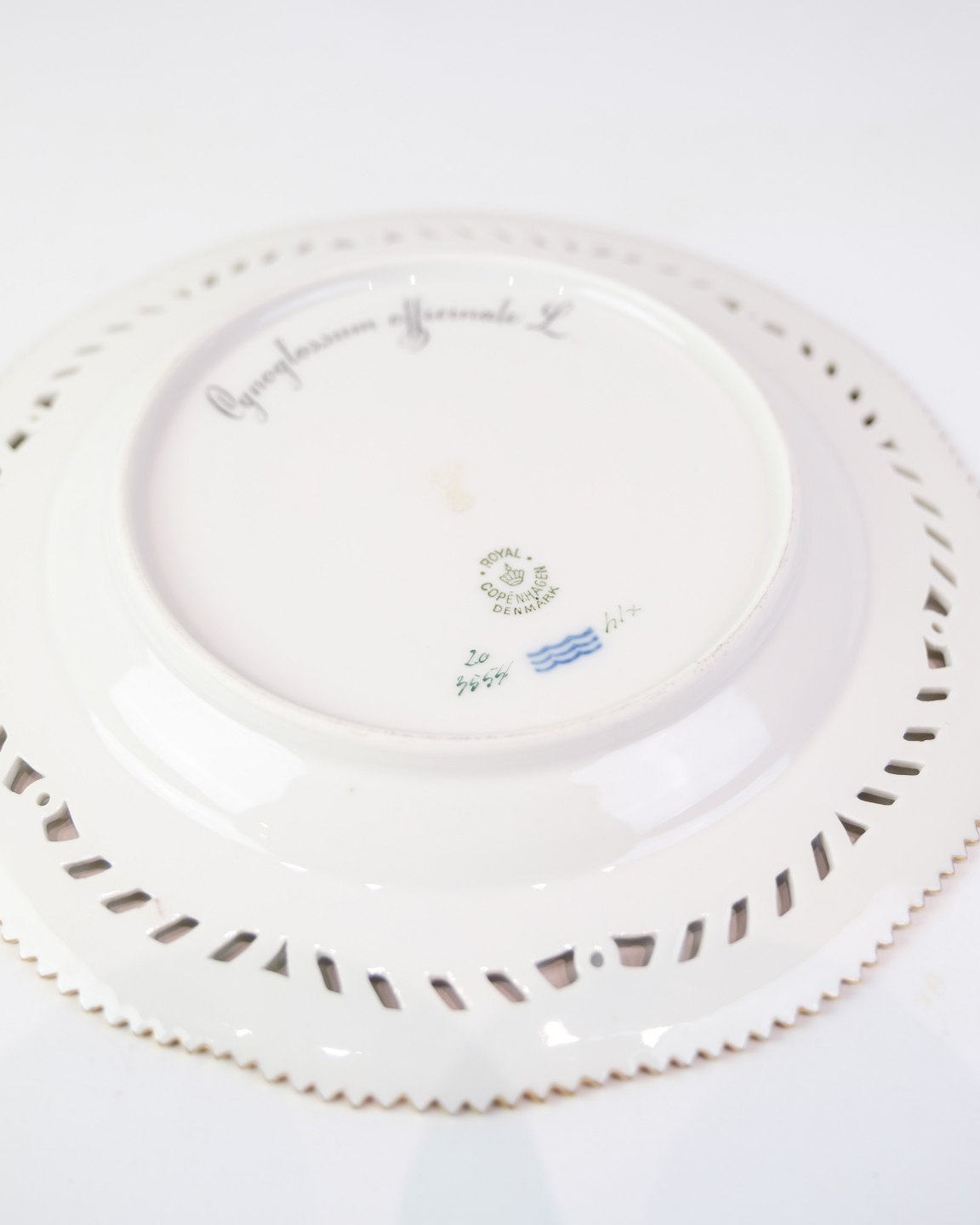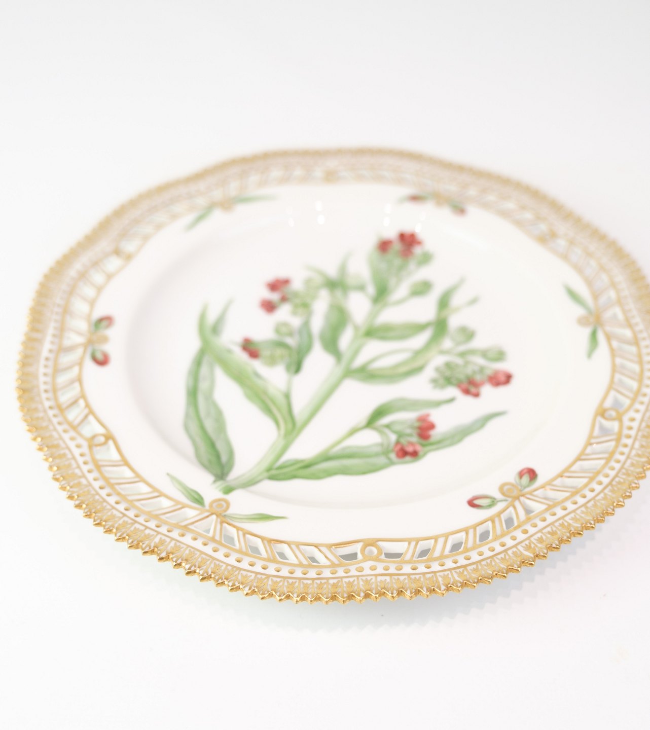 Håndmalet frokosttallerken fra Royal Copenhagens Flora Danica-serie, udført i porcelæn og dekoreret med motiv nr. 20/3554. Tallerkenen har gennembrudt blondekant og guldfinish.