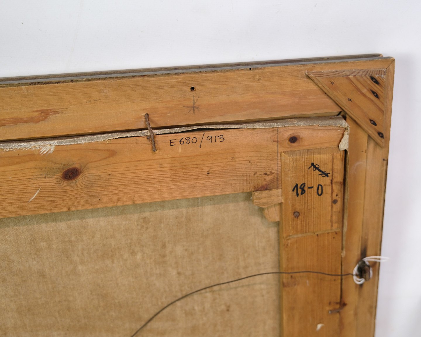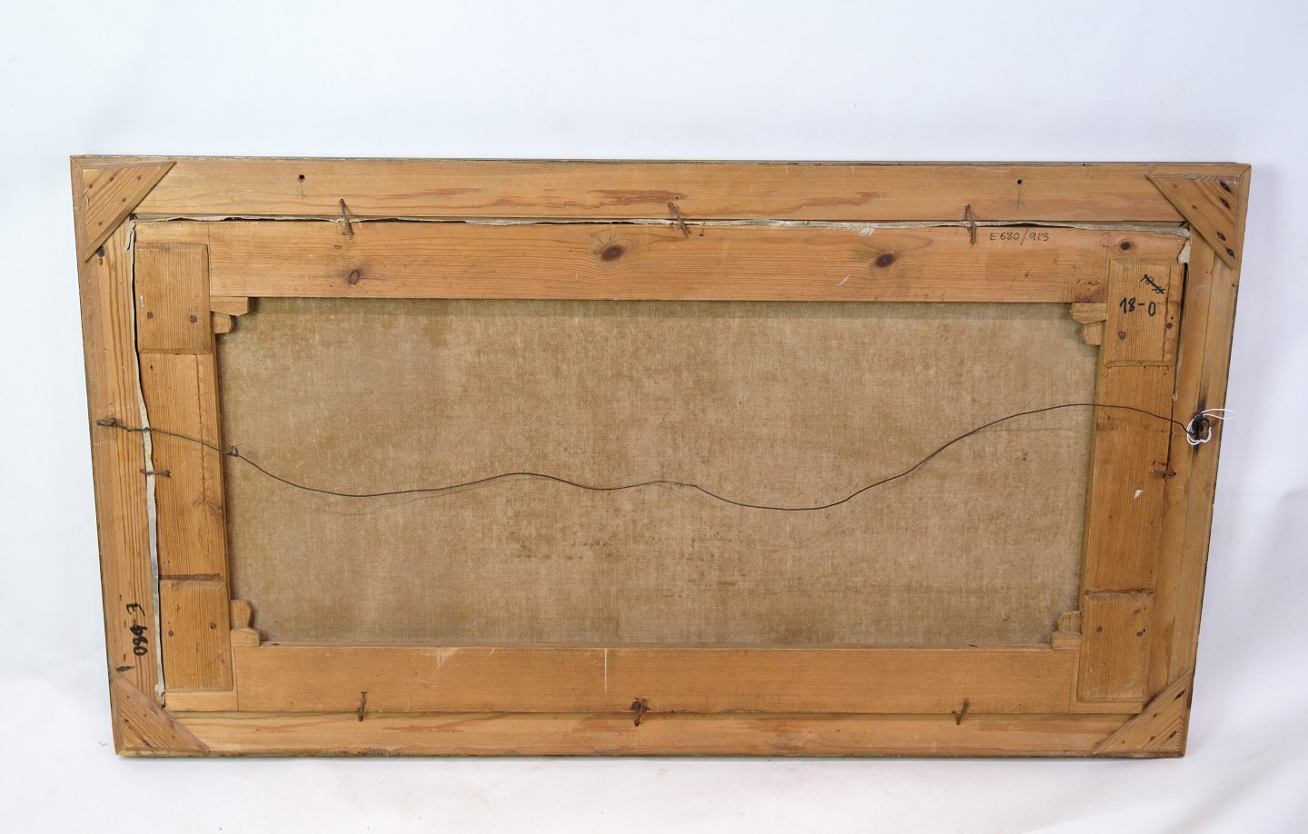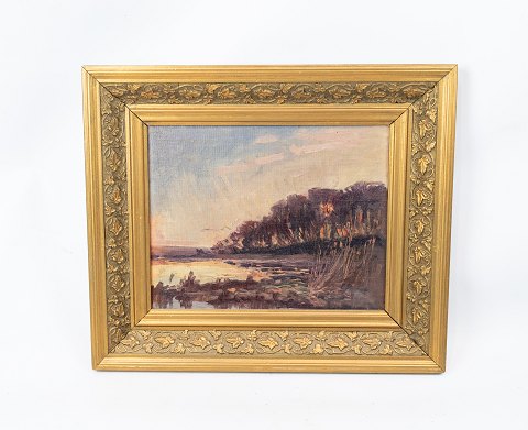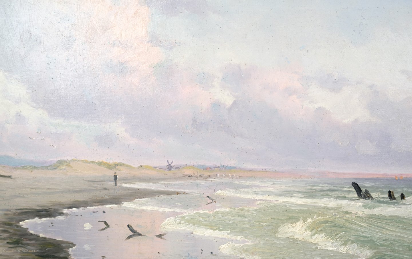 Oliemaleri udført af Alfred Theodor Olsen (1854–1932), kendt dansk marinemaler. Maleriet viser et roligt kystlandskab med strand, hav, drivtømmer og en svagt synlig vindmølle i horisonten. Signeret nederst til højre.