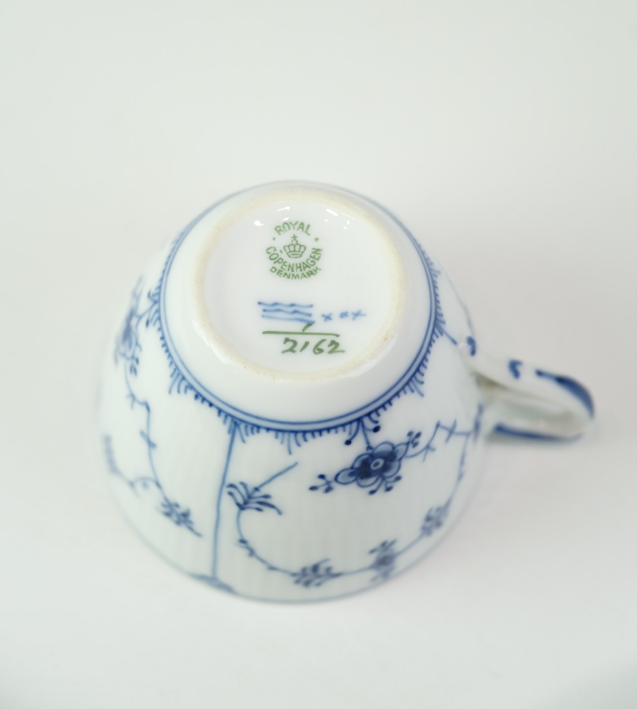 Hand-painted coffee cup from Royal Copenhagen's classic blue fluting series. The model is No. 2162 and is made of porcelain with the iconic cobalt blue decoration and the characteristic fluted surface.