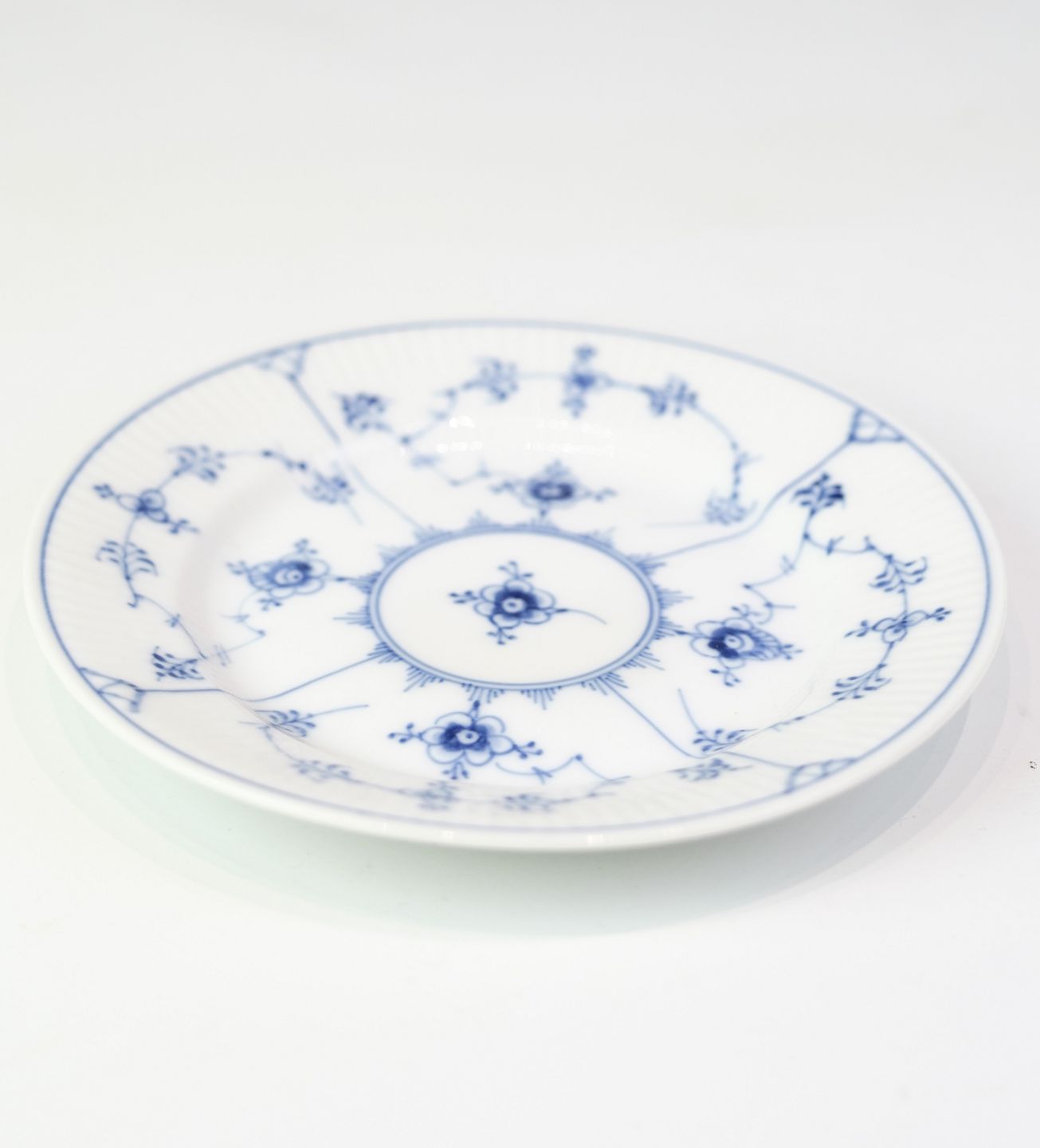 Kagetallerken fra Royal Copenhagen i musselmalede riflet mønster. Model No. 1/181 og er håndmalet i koboltblå på hvidt porcelæn med de berømte riflede detaljer. En fin størrelse til servering af kage, dessert eller småretter