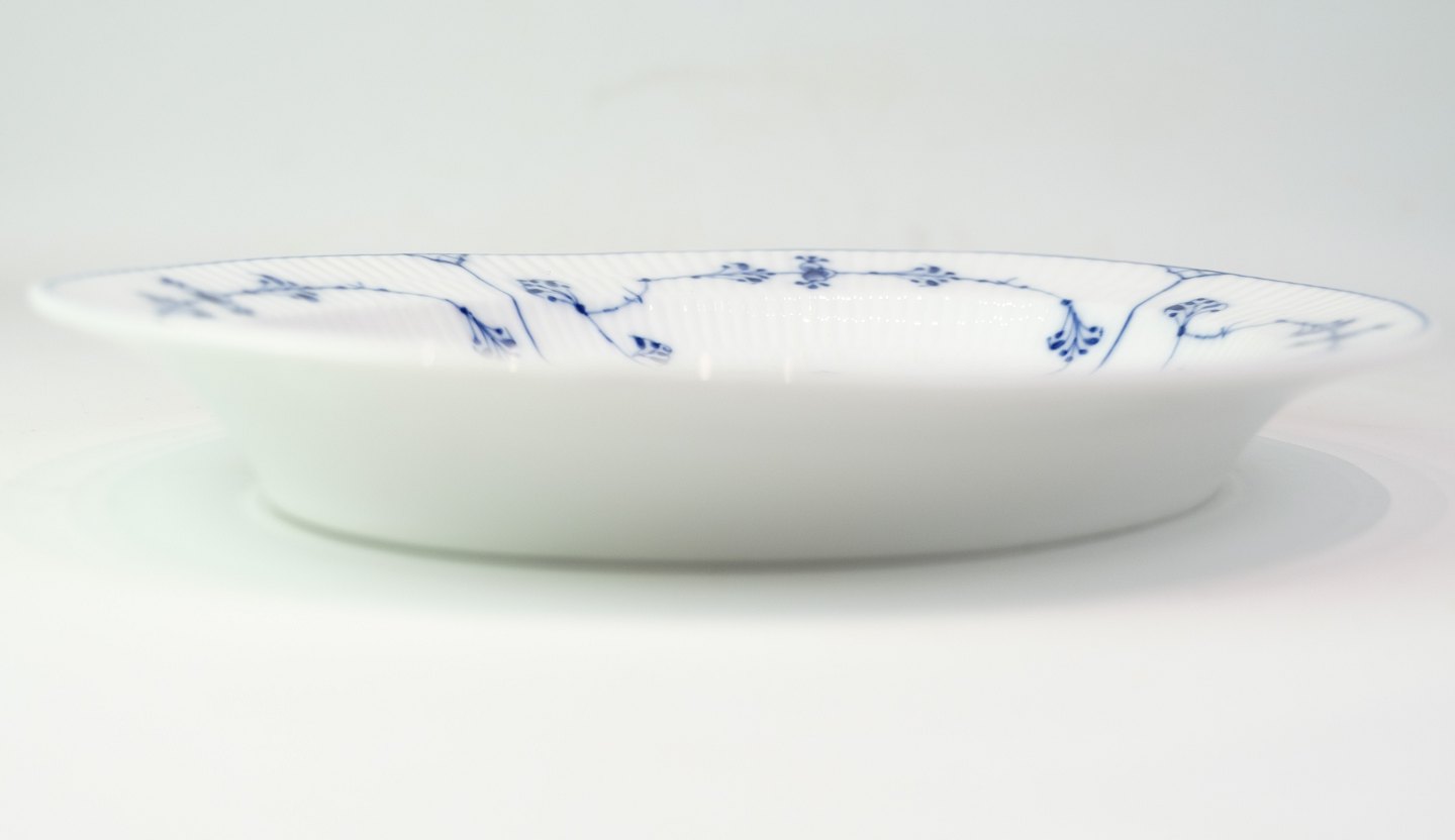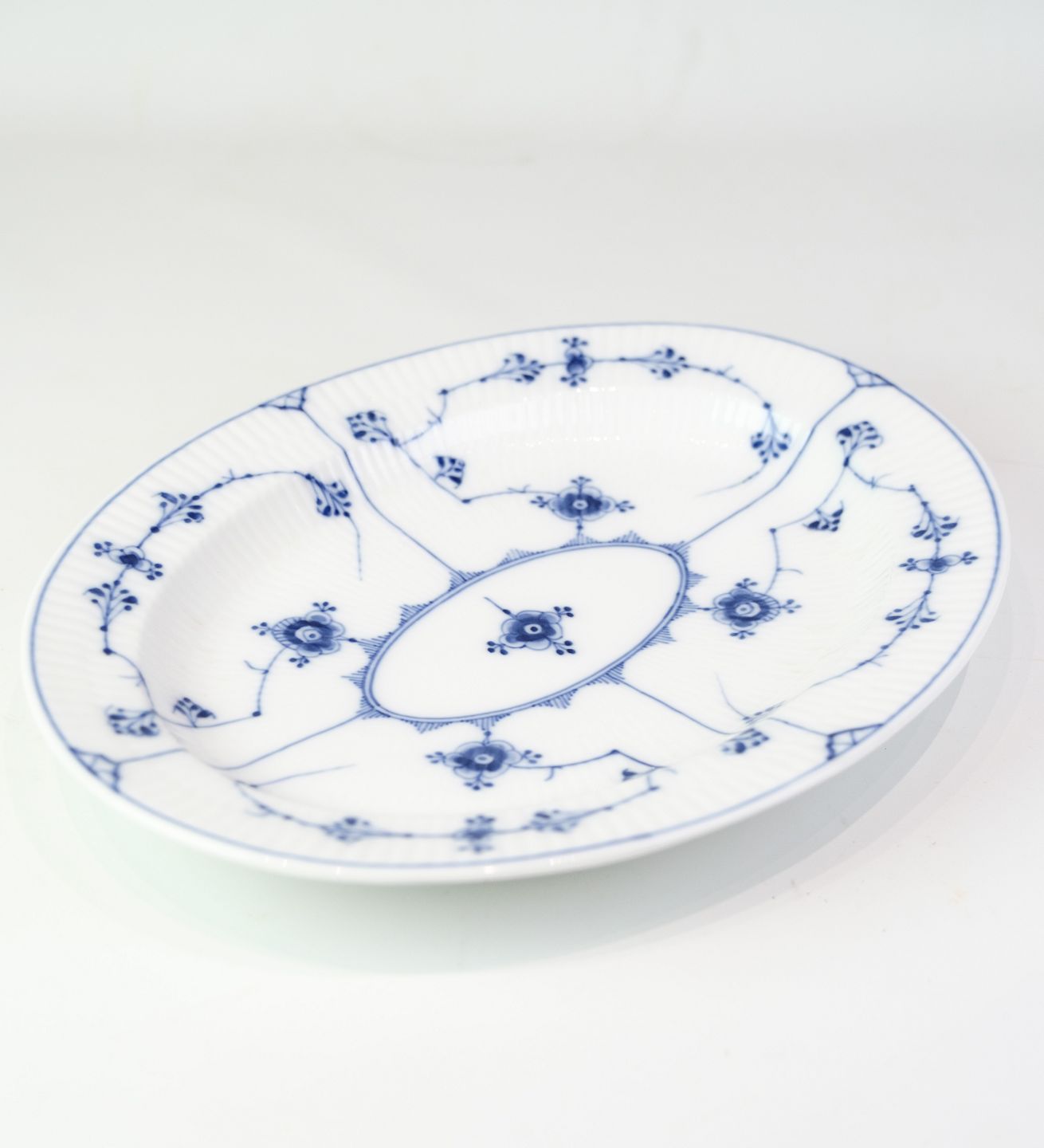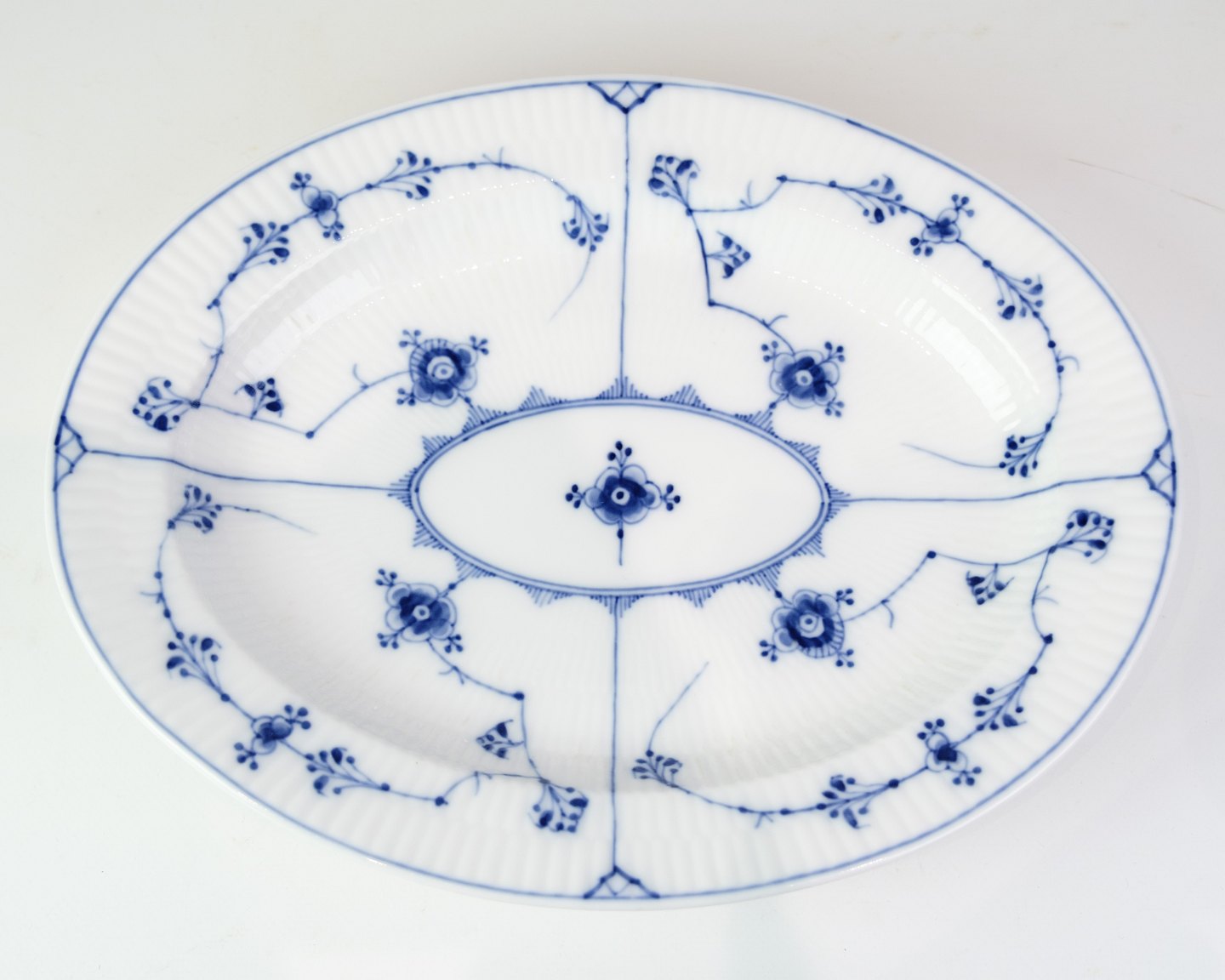 Oval dish from Royal Copenhagen in the blue-fluted design. Hand-painted with a fluted pattern and designed by Arnold Krog (1856–1931), who as artistic director at the Royal Danish Porcelain Factory introduced the iconic blue-and-white set in 1885.