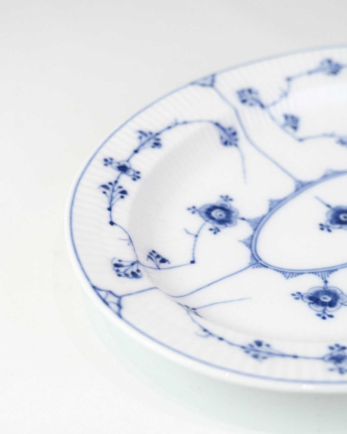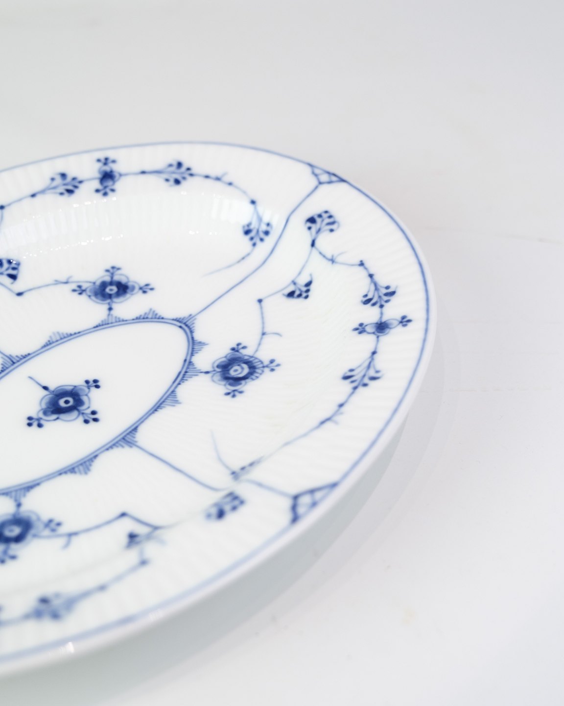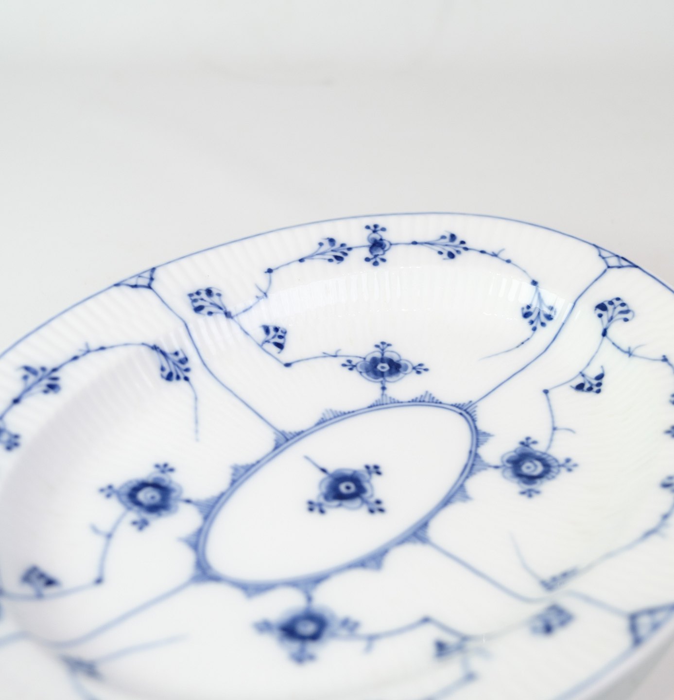 Oval dish from Royal Copenhagen in the blue-fluted design. Hand-painted with a fluted pattern and designed by Arnold Krog (1856–1931), who as artistic director at the Royal Danish Porcelain Factory introduced the iconic blue-and-white set in 1885.