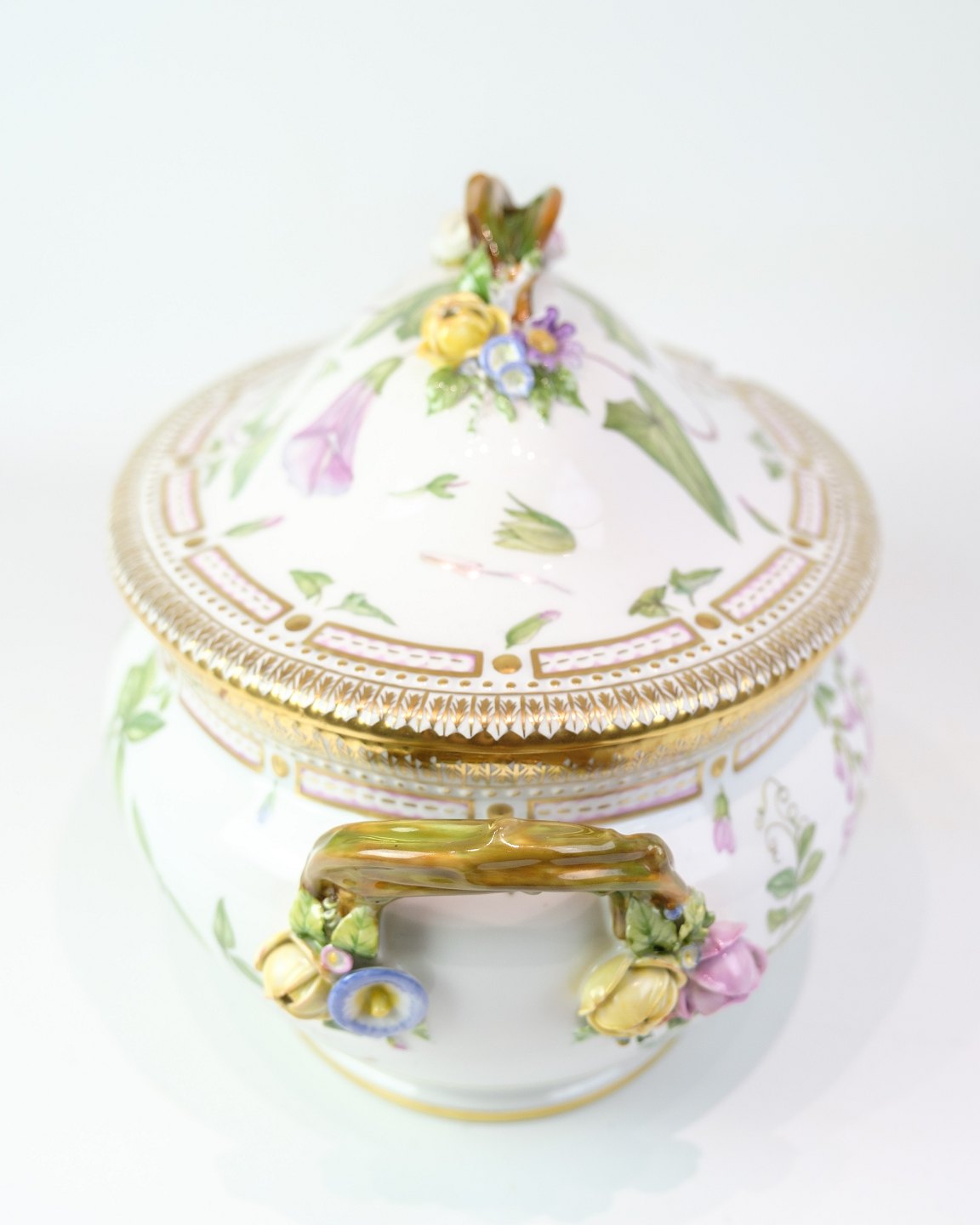Kontakt os vedrørende prisTerrin fra Royal Copenhagens Flora Danica-serie, udført i porcelæn og håndmalet med dekoration nr. 20/3559. Terrinen er rigt dekoreret med naturtro blomster og forsynet med låghank og to sidehanke udformet som grenmotiver med blomster og blade i farver.