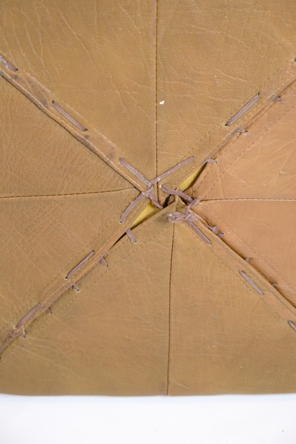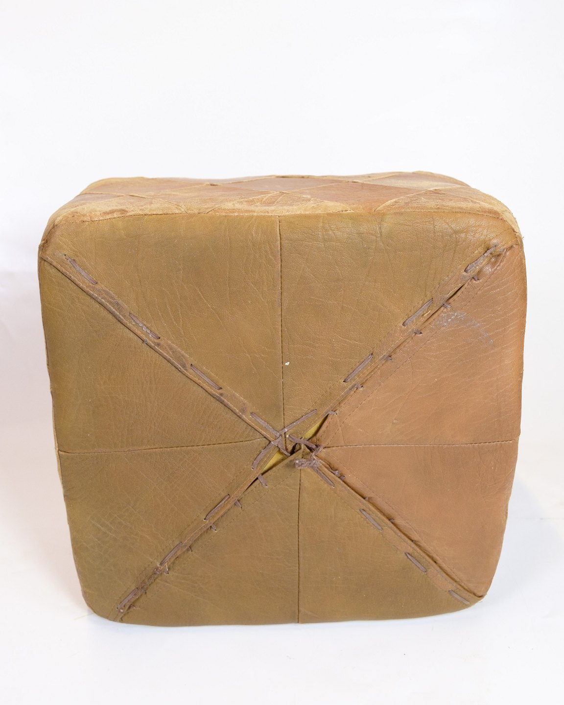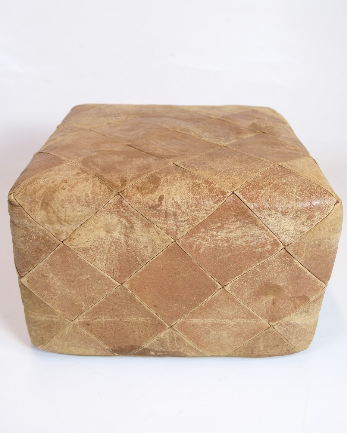 Vintage kvadratisk læderpuf fra 1970’erne i naturlæder med smuk patina. Håndsyet overflade i geometrisk mønster.