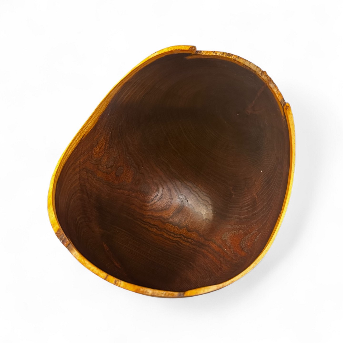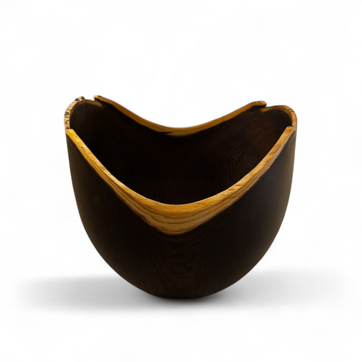 Hånddrejet skål i guldregn, udført af den bornholmske trædrejer Hans Henning Pedersen, signeret i bunden. Skålen har en organisk form med flot åretegning og naturligt afbarket kant.