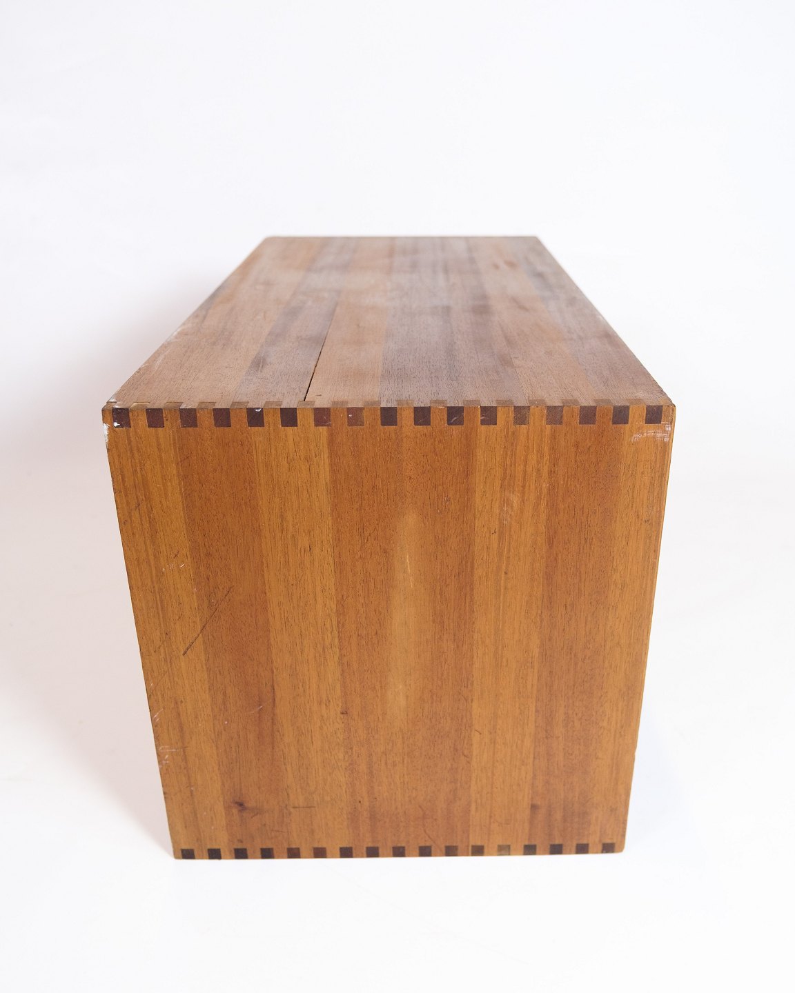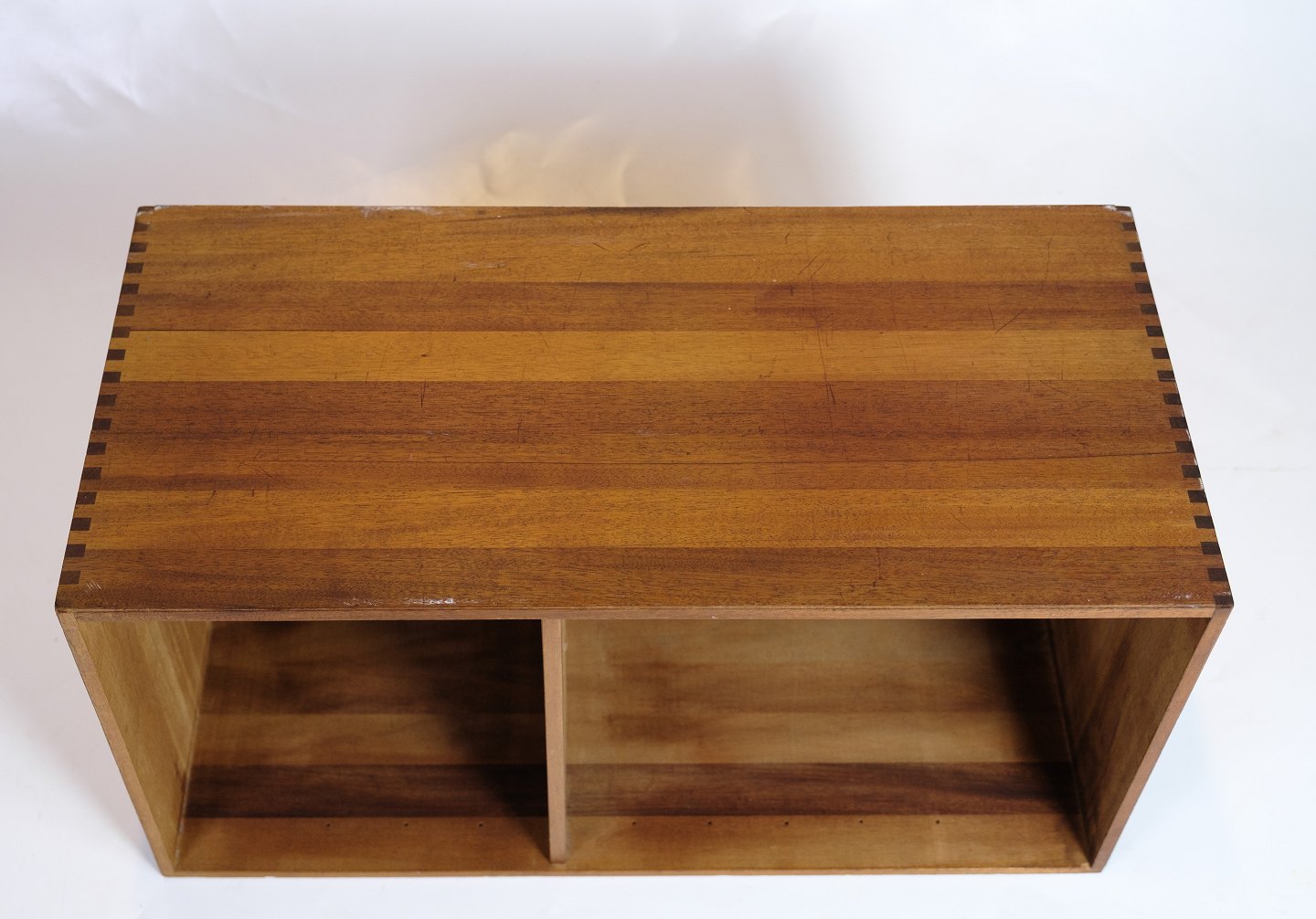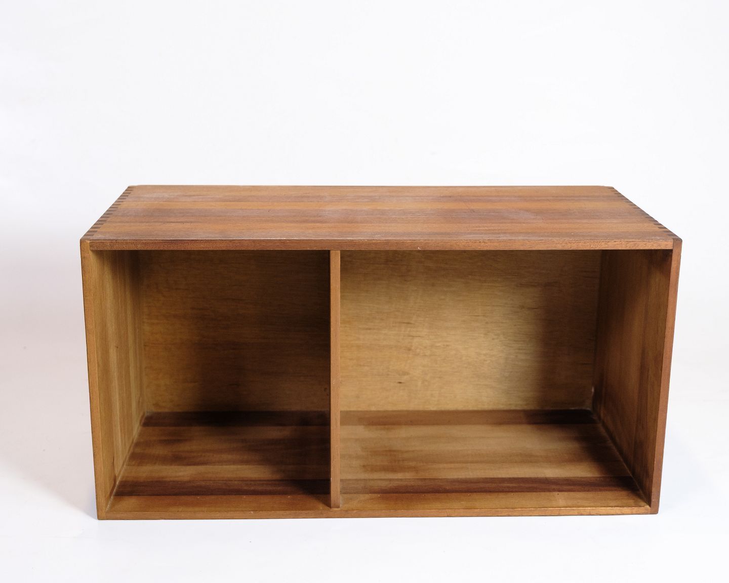 SolgtBogreol i teak med tappede samlinger, dansk design fra 1960’erne. Reolen er inddelt i to rum og egner sig godt som både vægmonteret enhed eller stående modul i en reolsammensætning.
