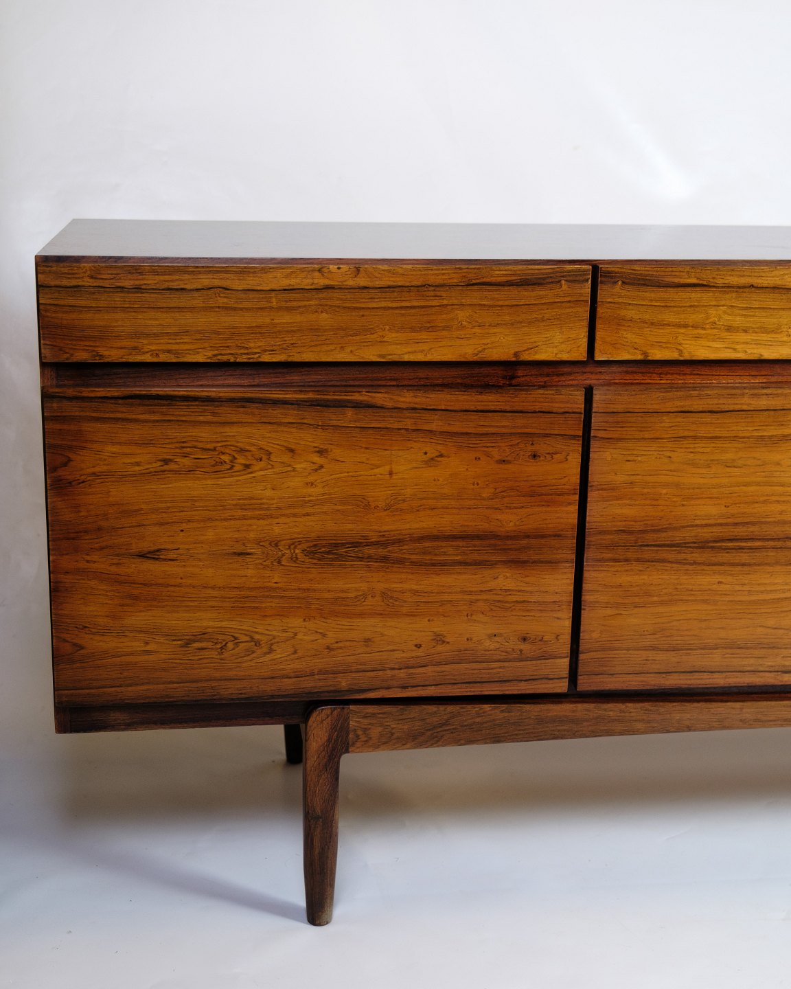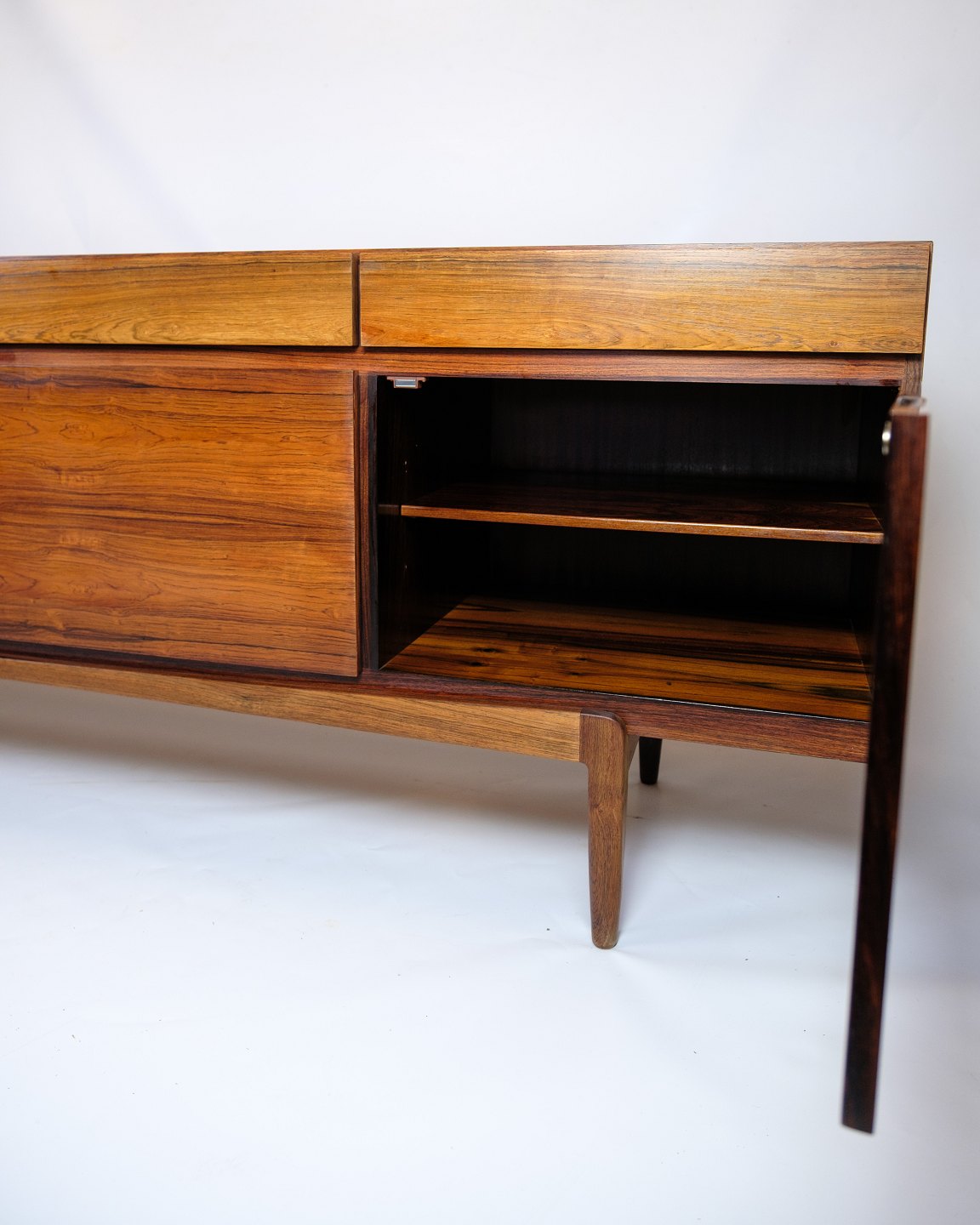 Kontakt os vedrørende prisSkænk designet af Ib Kofod-Larsen, model FA66, produceret af Faarup Møbelfabrik i 1960’erne. Skænken er udført i palisander med flot åretegning og front med fire skydelåger og skuffesektion bag den ene låge.
