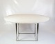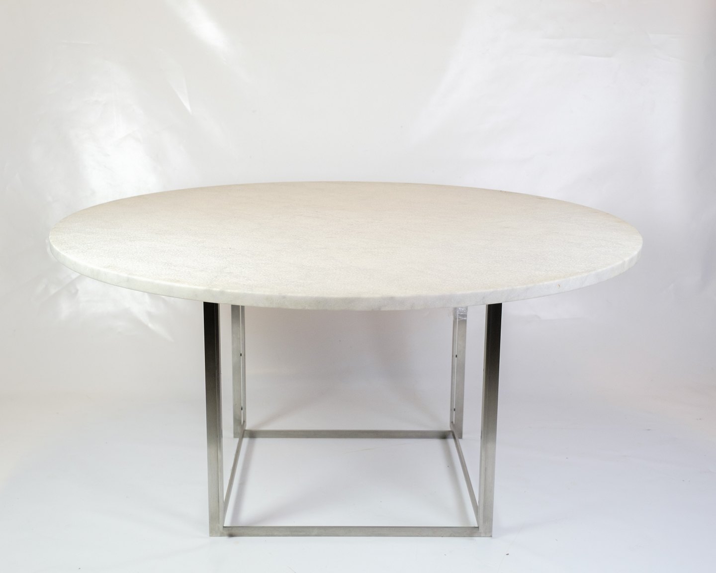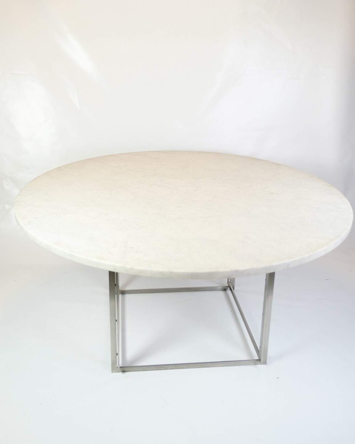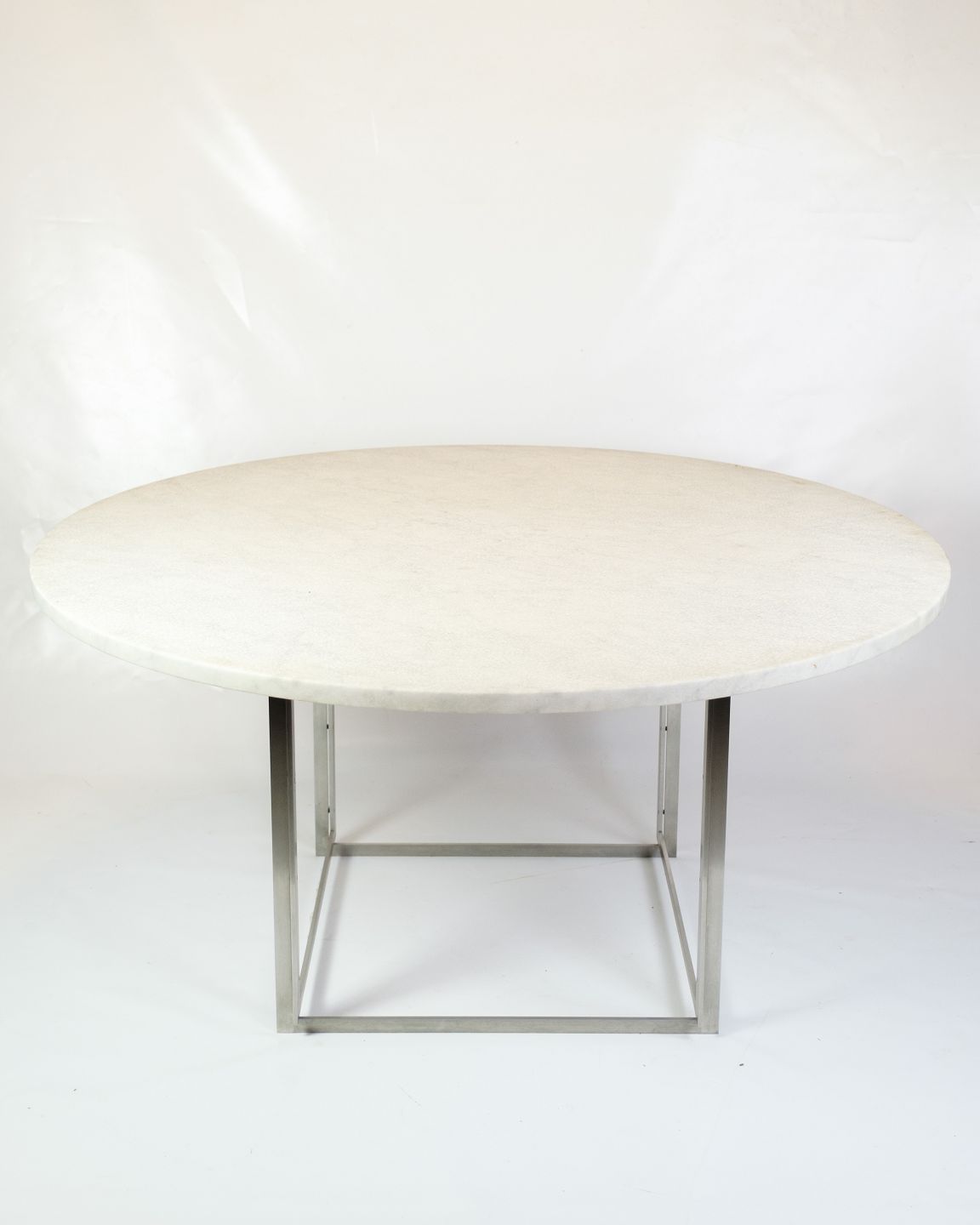 Rundt spisebord, model PK54, designet af Poul Kjærholm i 1963 og produceret af Fritz Hansen. Bordet er udført med en smuk plade i valset hvid marmor, som hviler på et understel i børstet rustfrit stål.