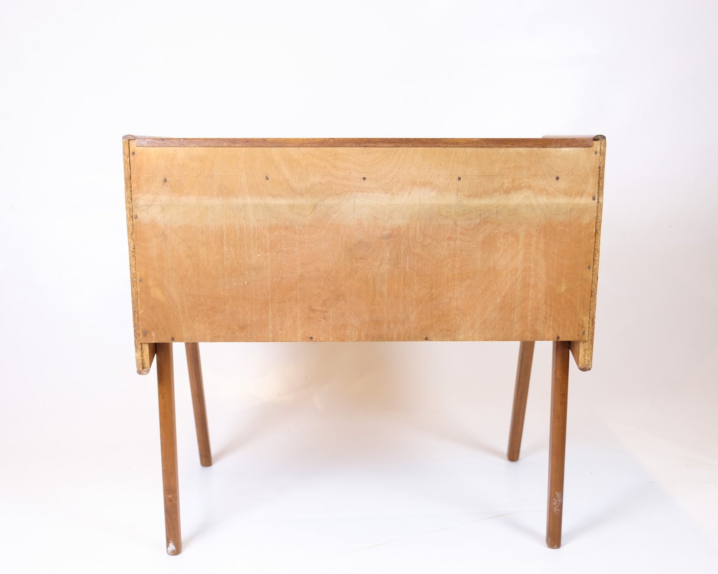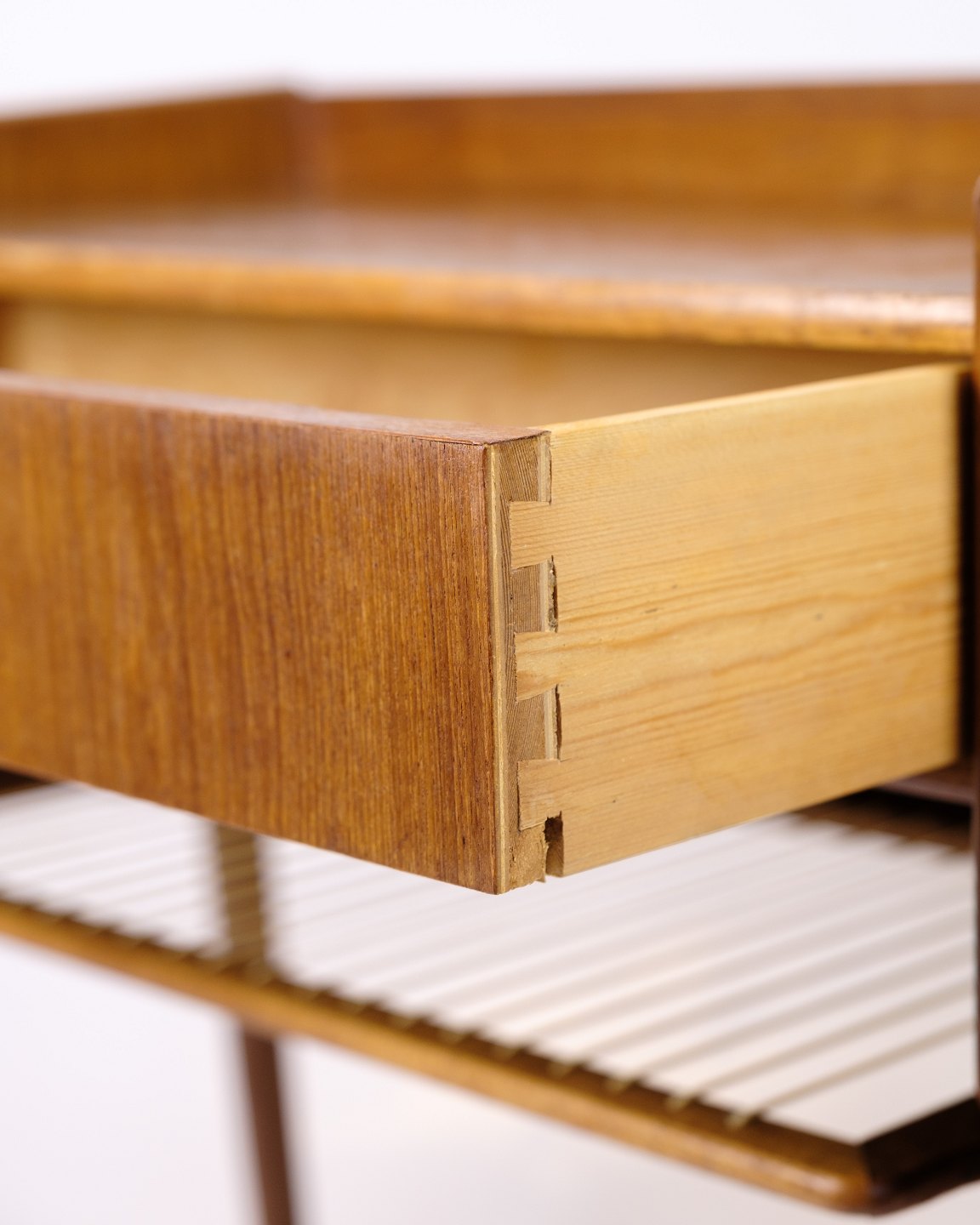 Side table/nightstand in teak with drawer and wicker shelf. Danish design from the 1960s. Elegant and functional furniture in great condition.