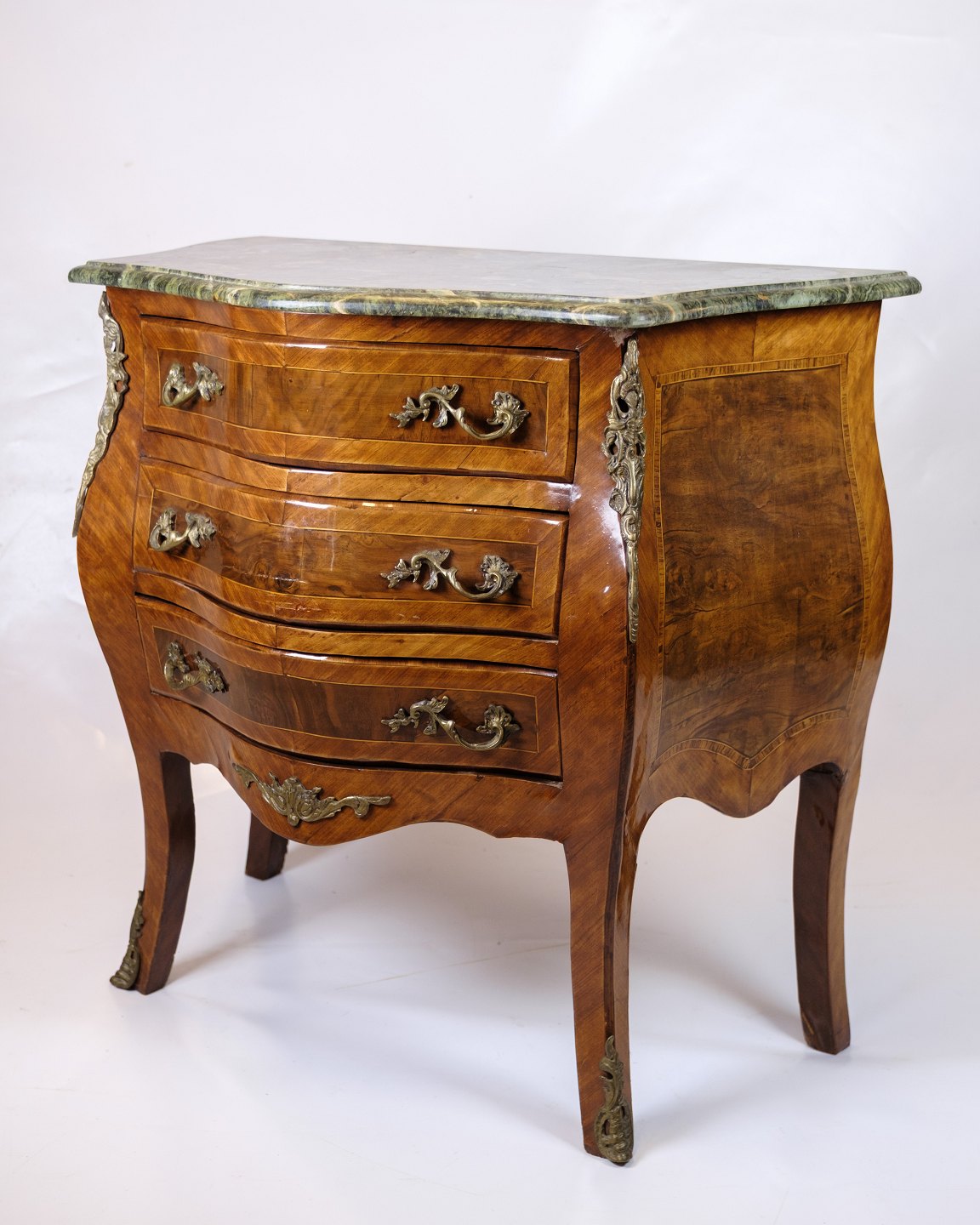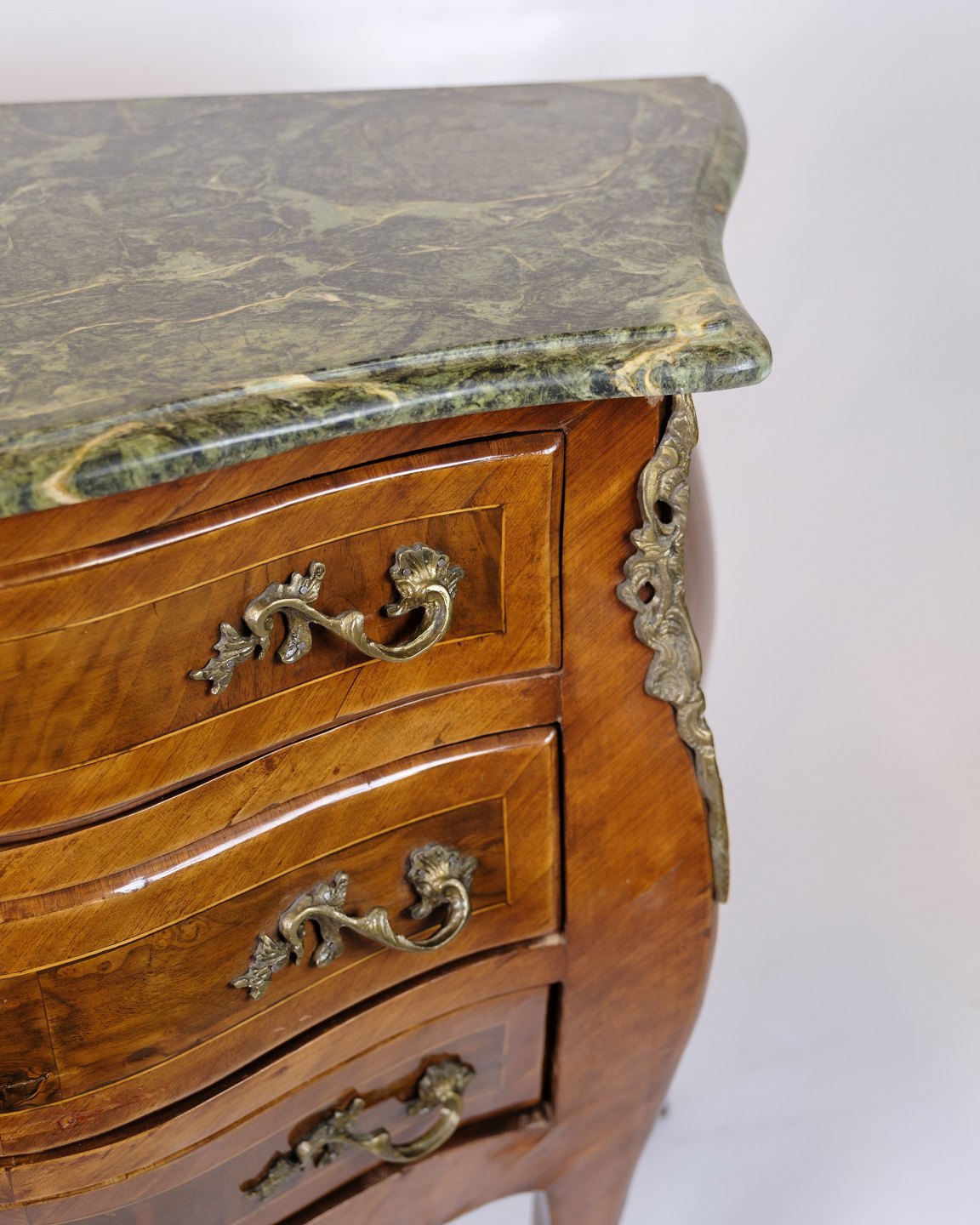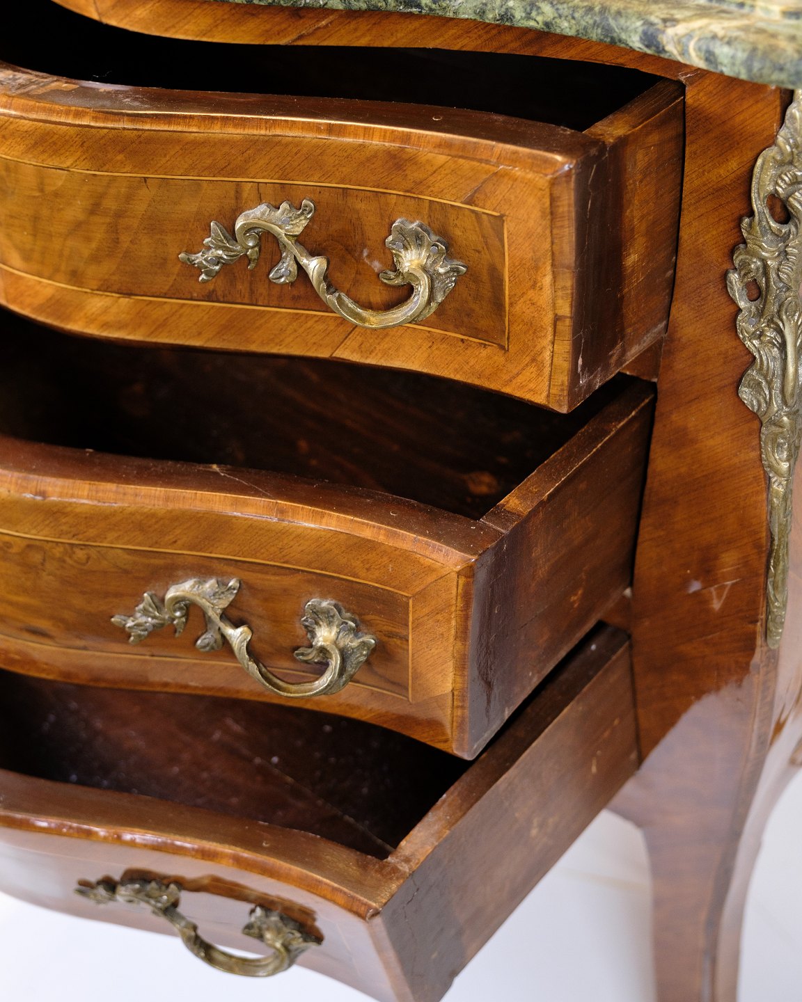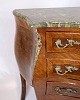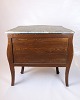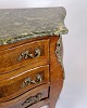 SoldRococo style chest of drawers with marble top and brass handles. Made of walnut. Classic furniture with a decorative expression.