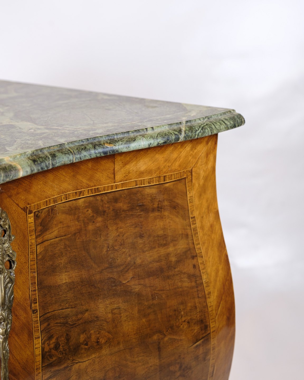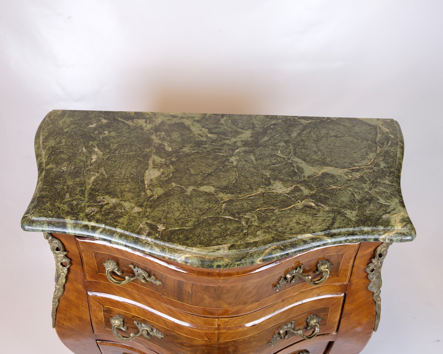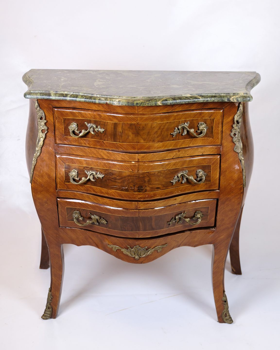 SoldRococo style chest of drawers with marble top and brass handles. Made of walnut. Classic furniture with a decorative expression.