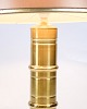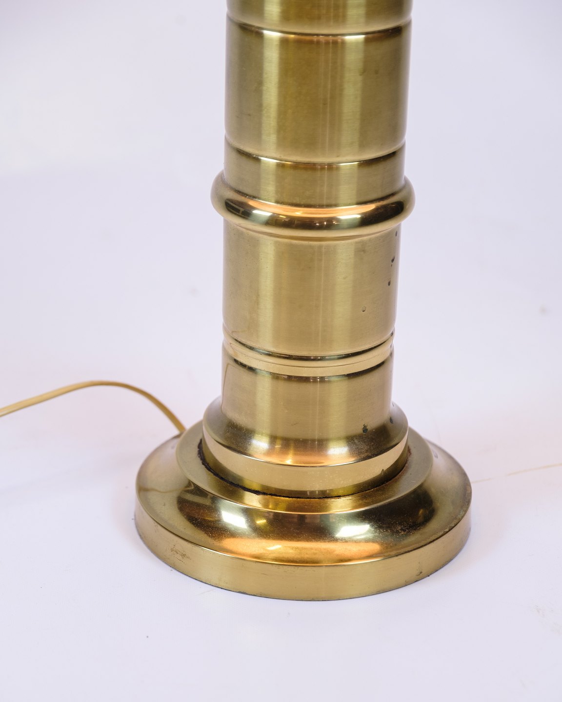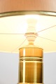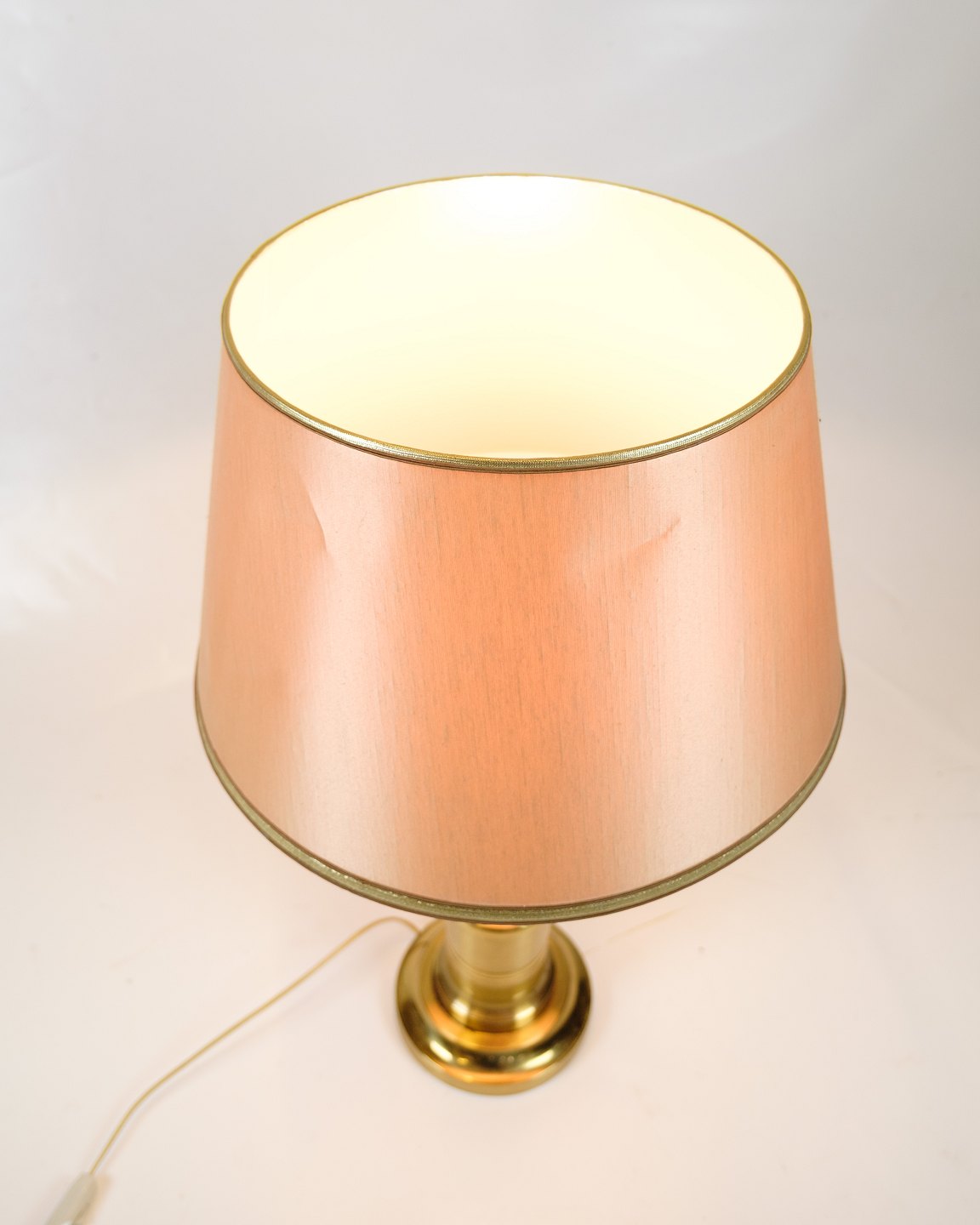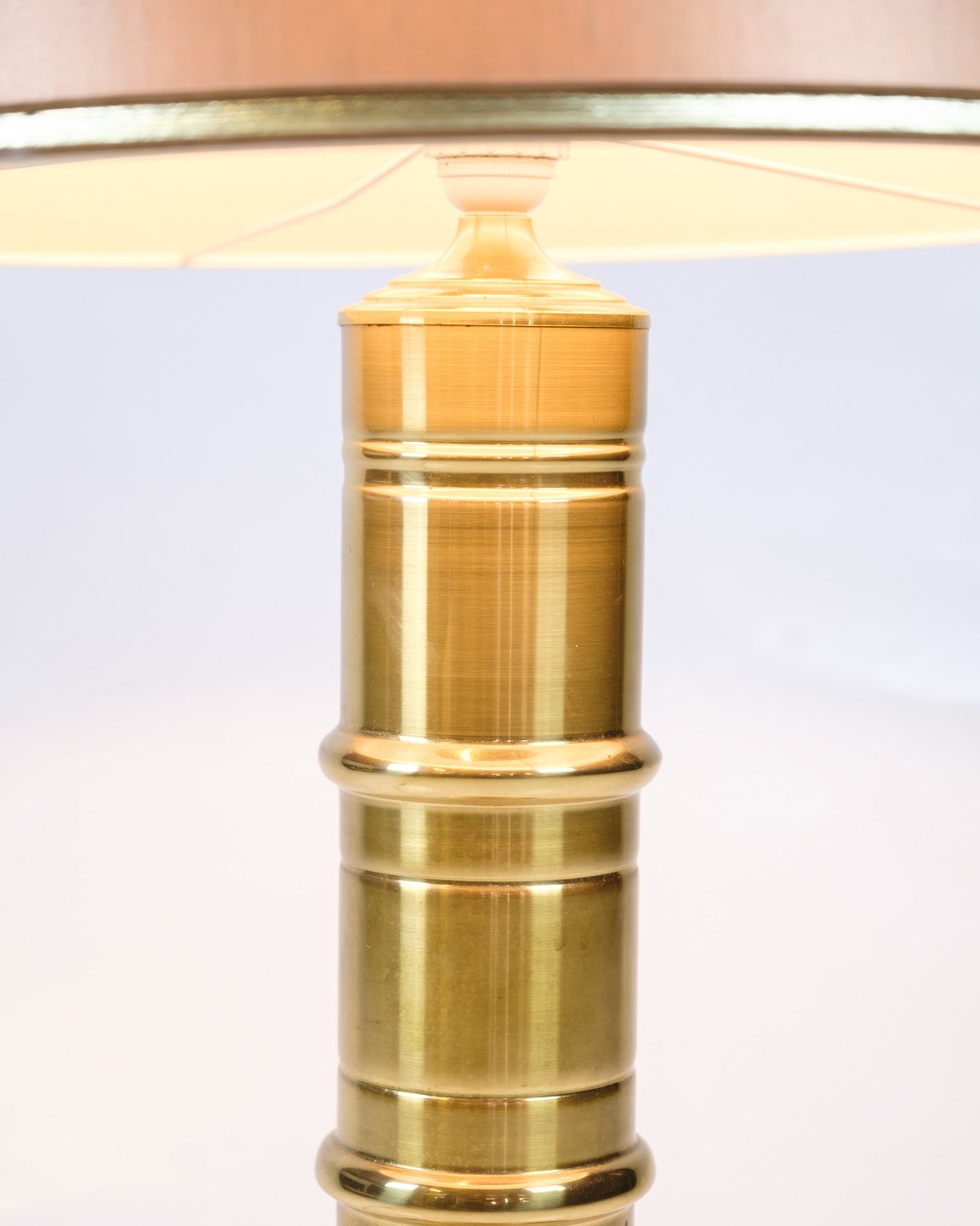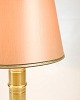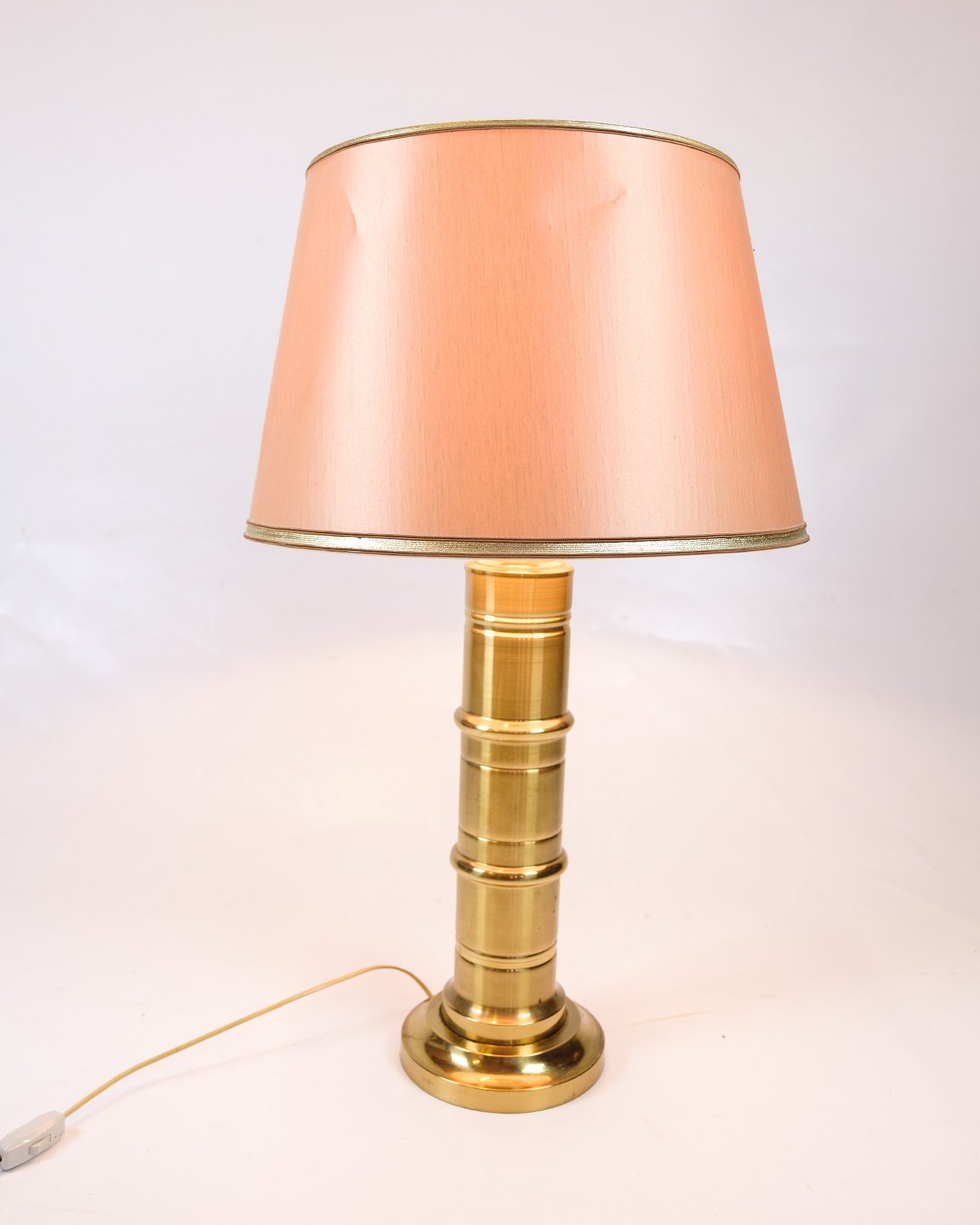 Set of 2 vintage table lamps from the 1970s with brass feet and pink lampshades. Classic retro design.