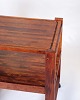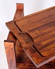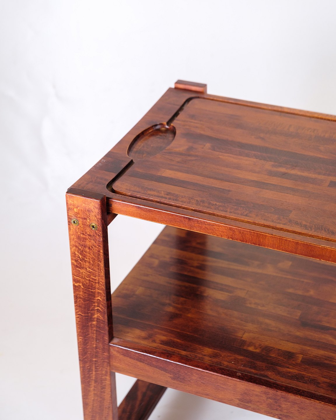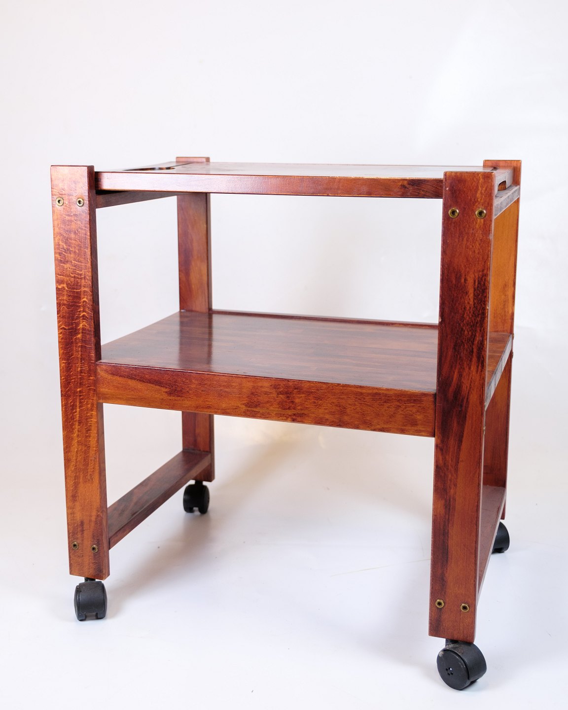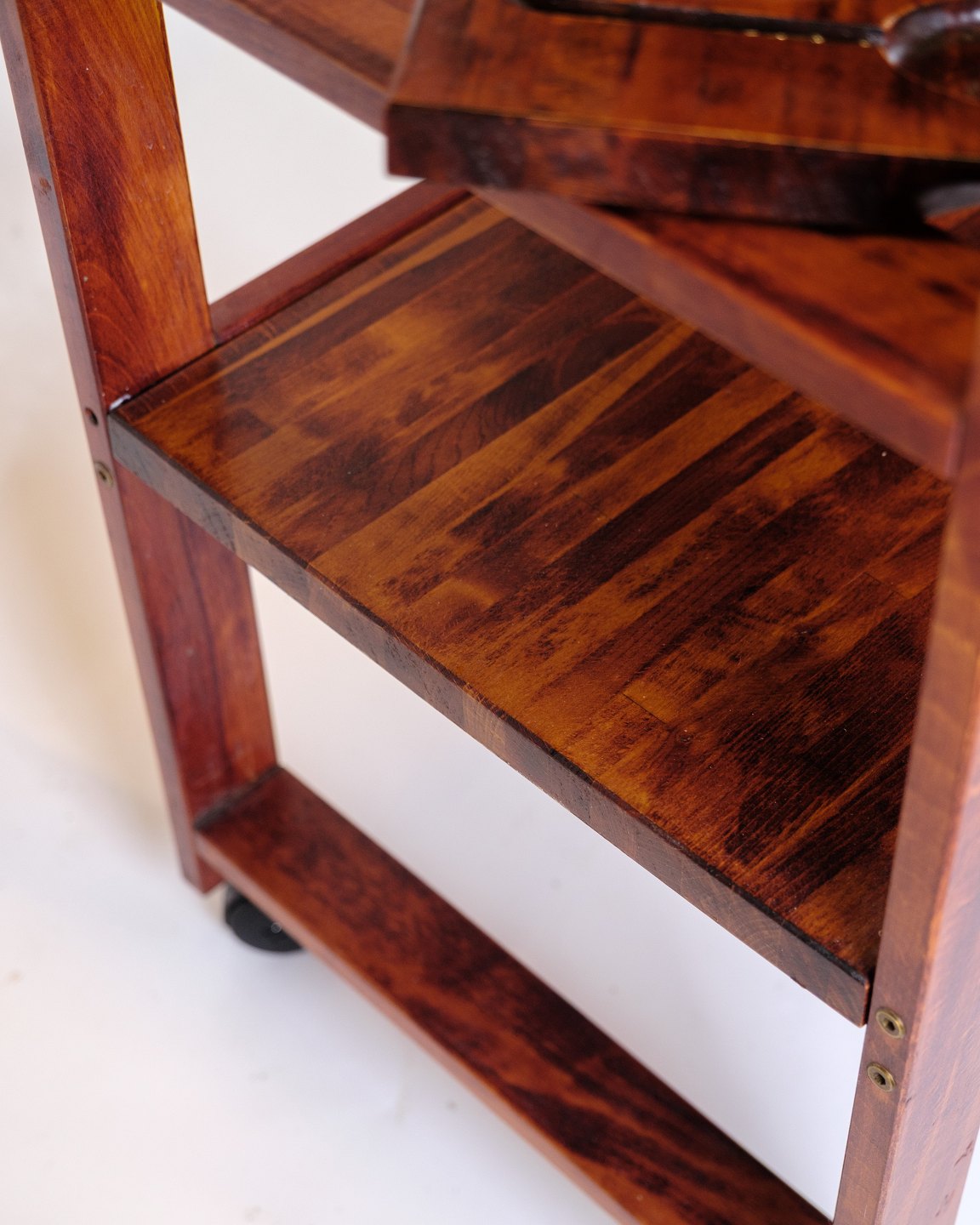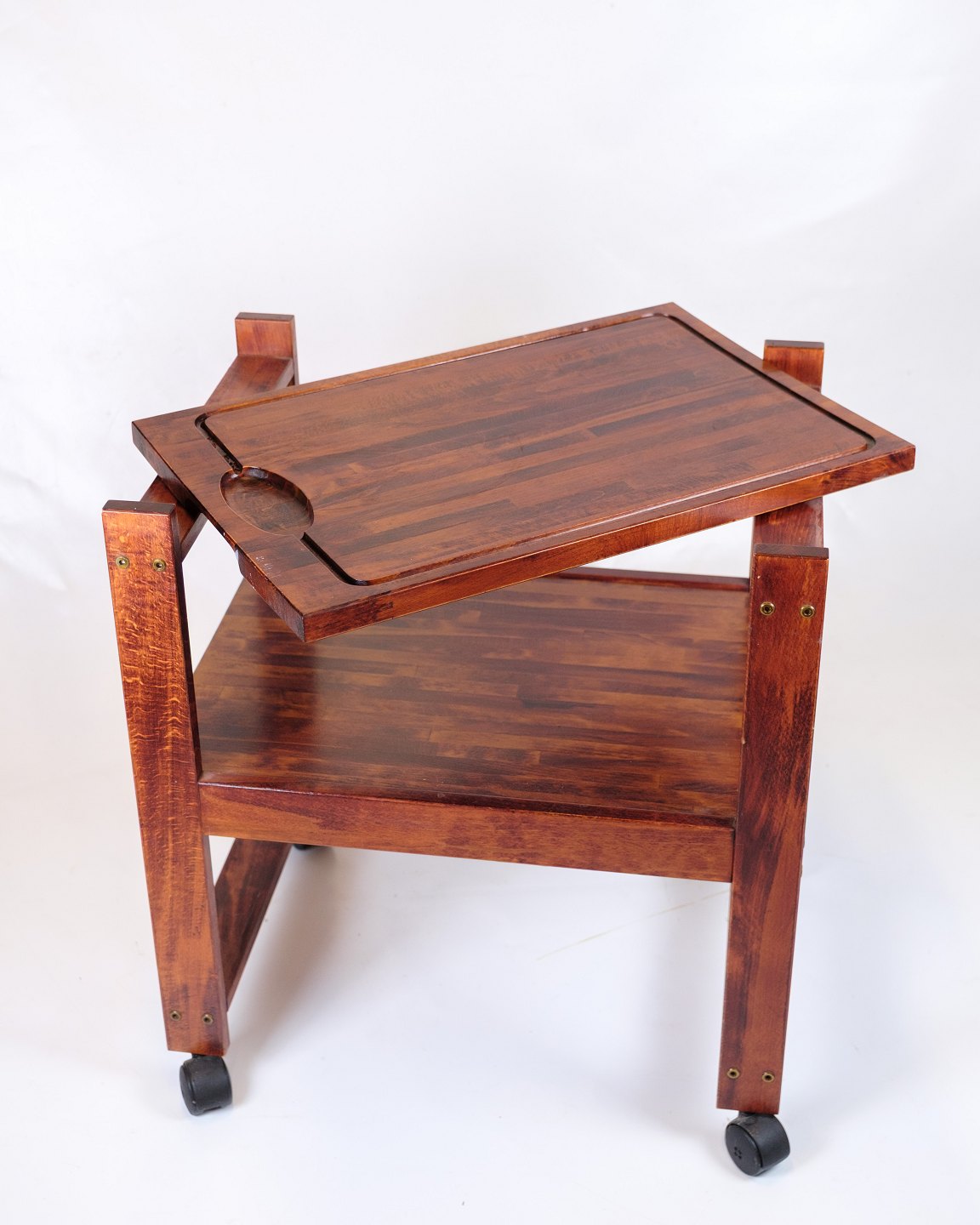 Vintage serving trolley on wheels, made of dark wood. The trolley has a practical removable cutting board on top, which makes it functional both in the kitchen and when serving.