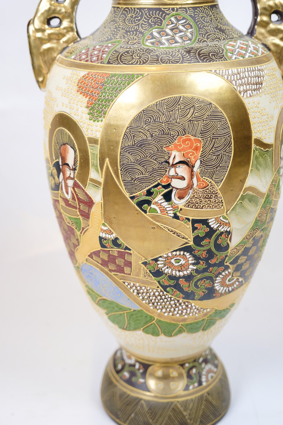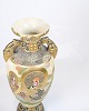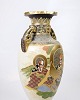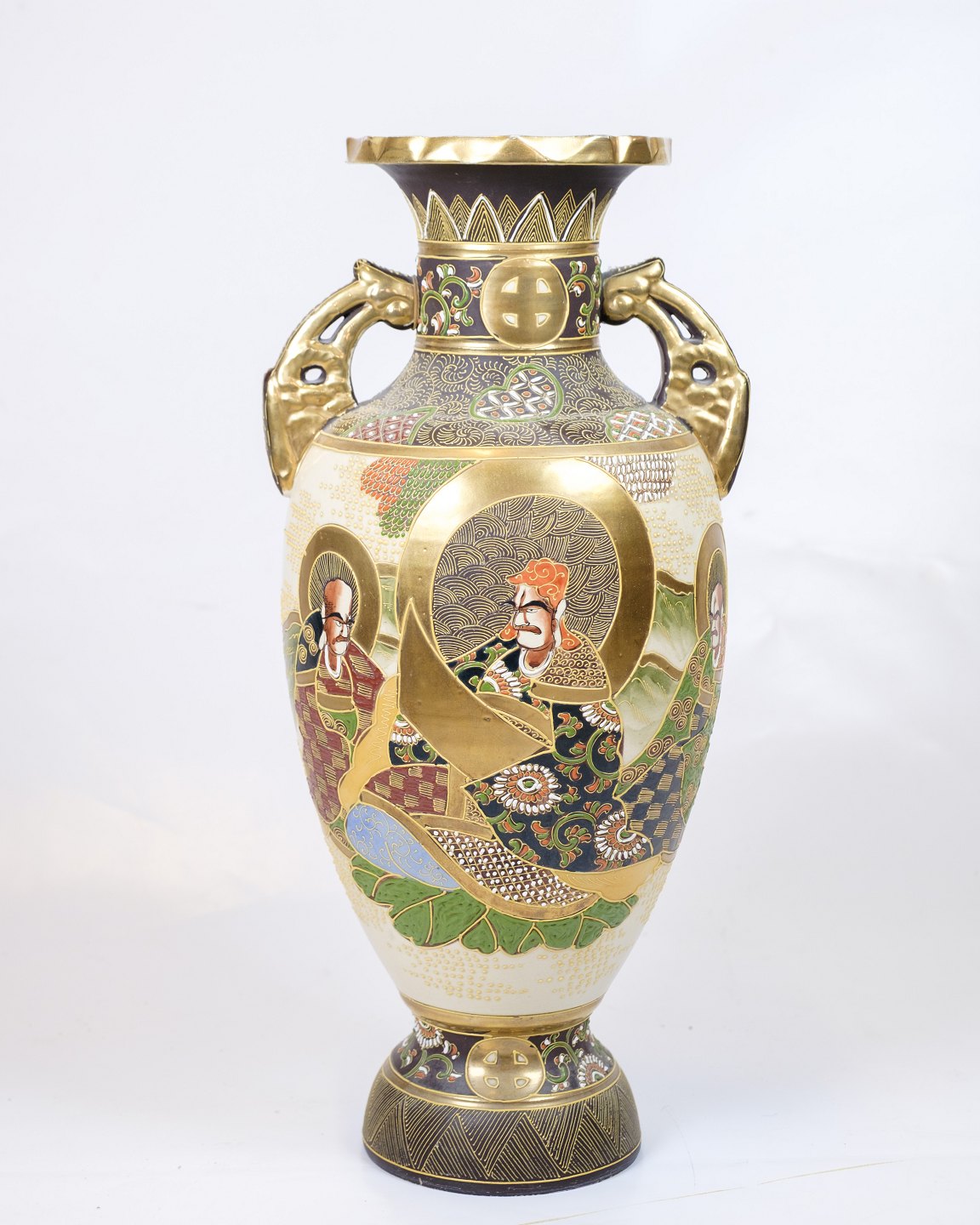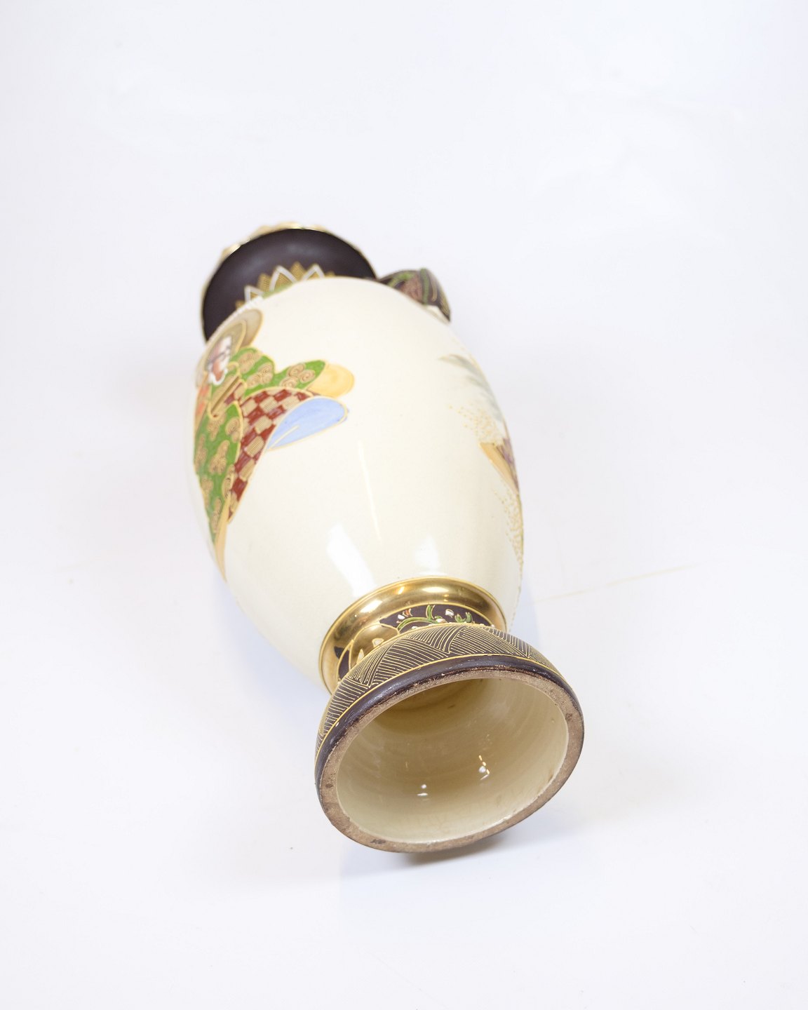 Stor japansk Satsuma-vase udført i stil af Meiji-perioden. Vasen er dekoreret med elfenbensfarvet glasur med karakteristisk krakeleret finish og håndmalede figurscener samt ornamentale mønstre i varme nuancer.