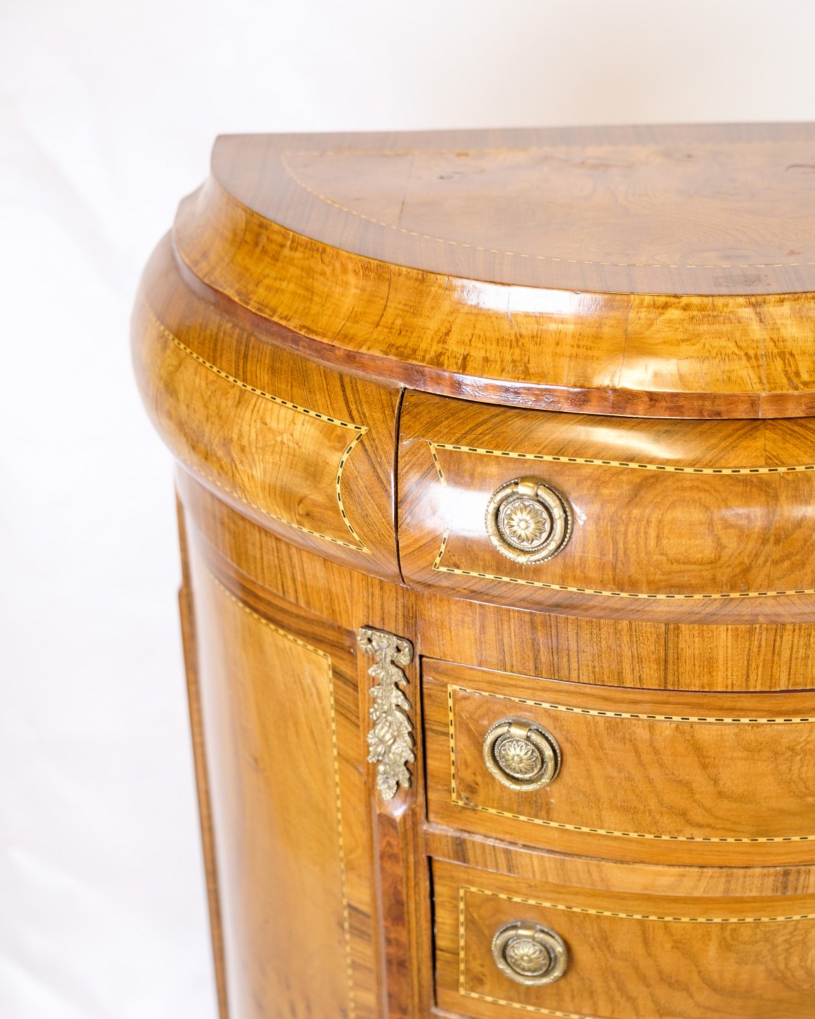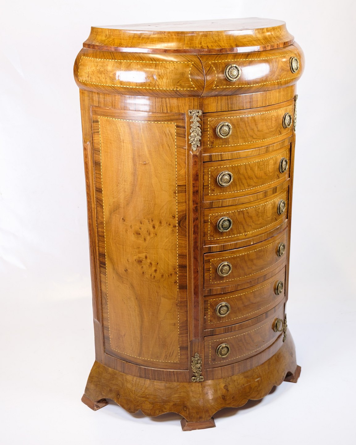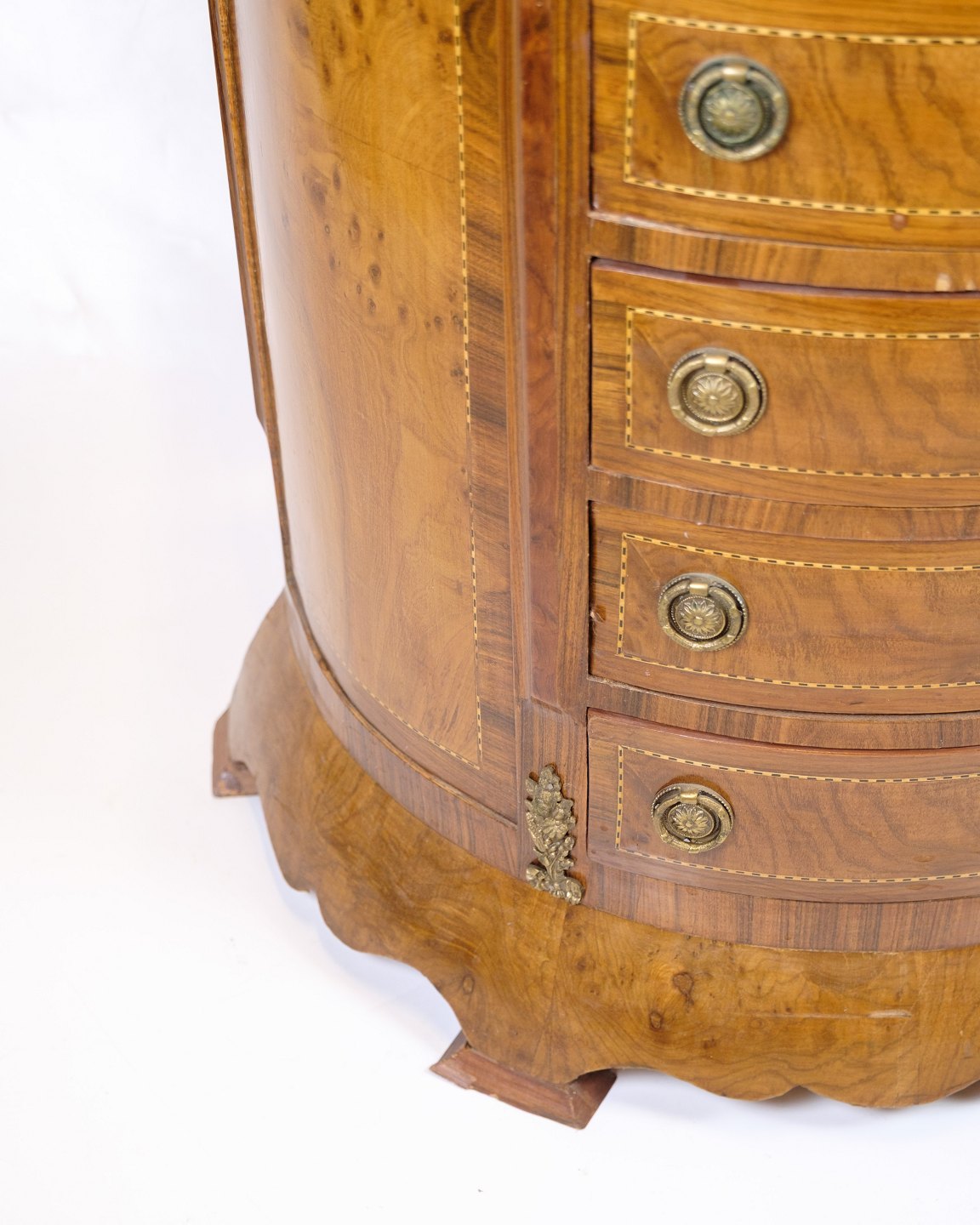 Antik høj kommode fra 1890’erne udført i klunkestil. Kommoden er fremstillet i rosentræ med smuk buet front og originale messinggreb.