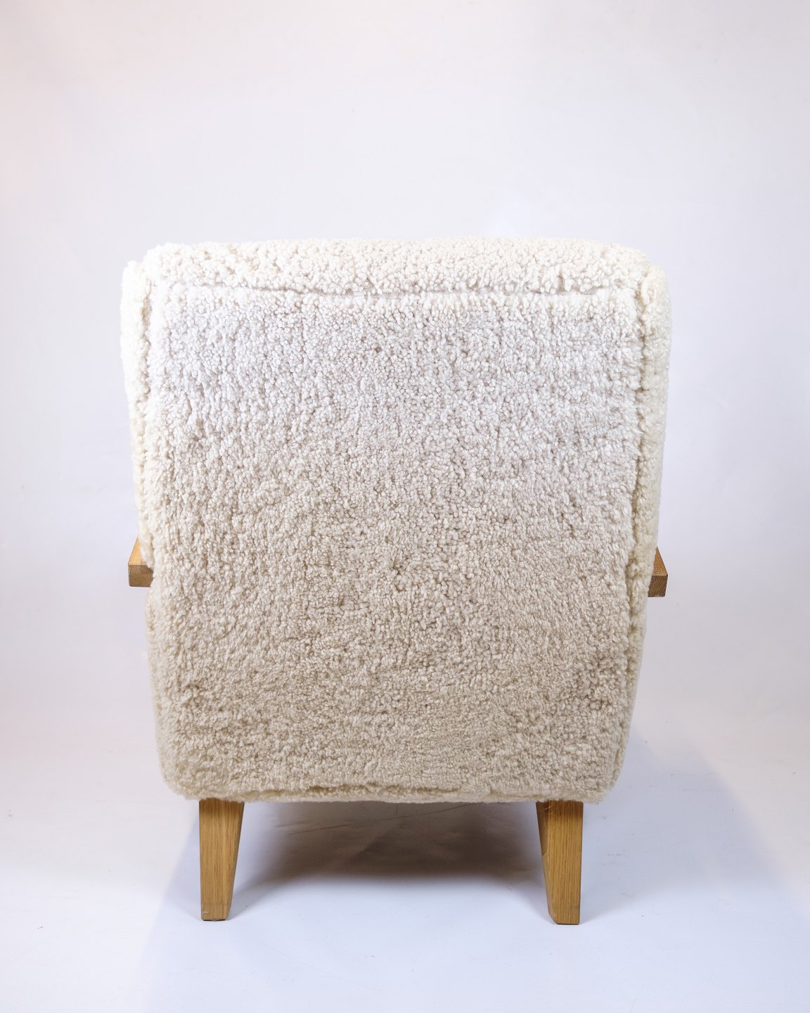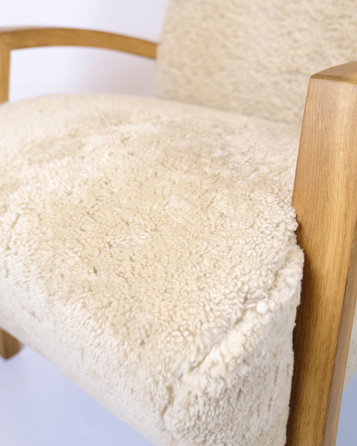 Lænestol i fåruld og egetræ. Komfortabel og dekorativ stol med tidløst design og varme materialer.