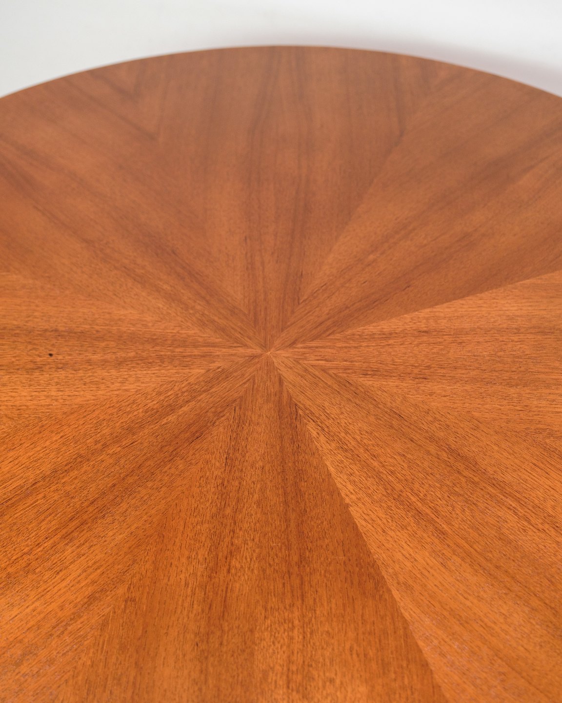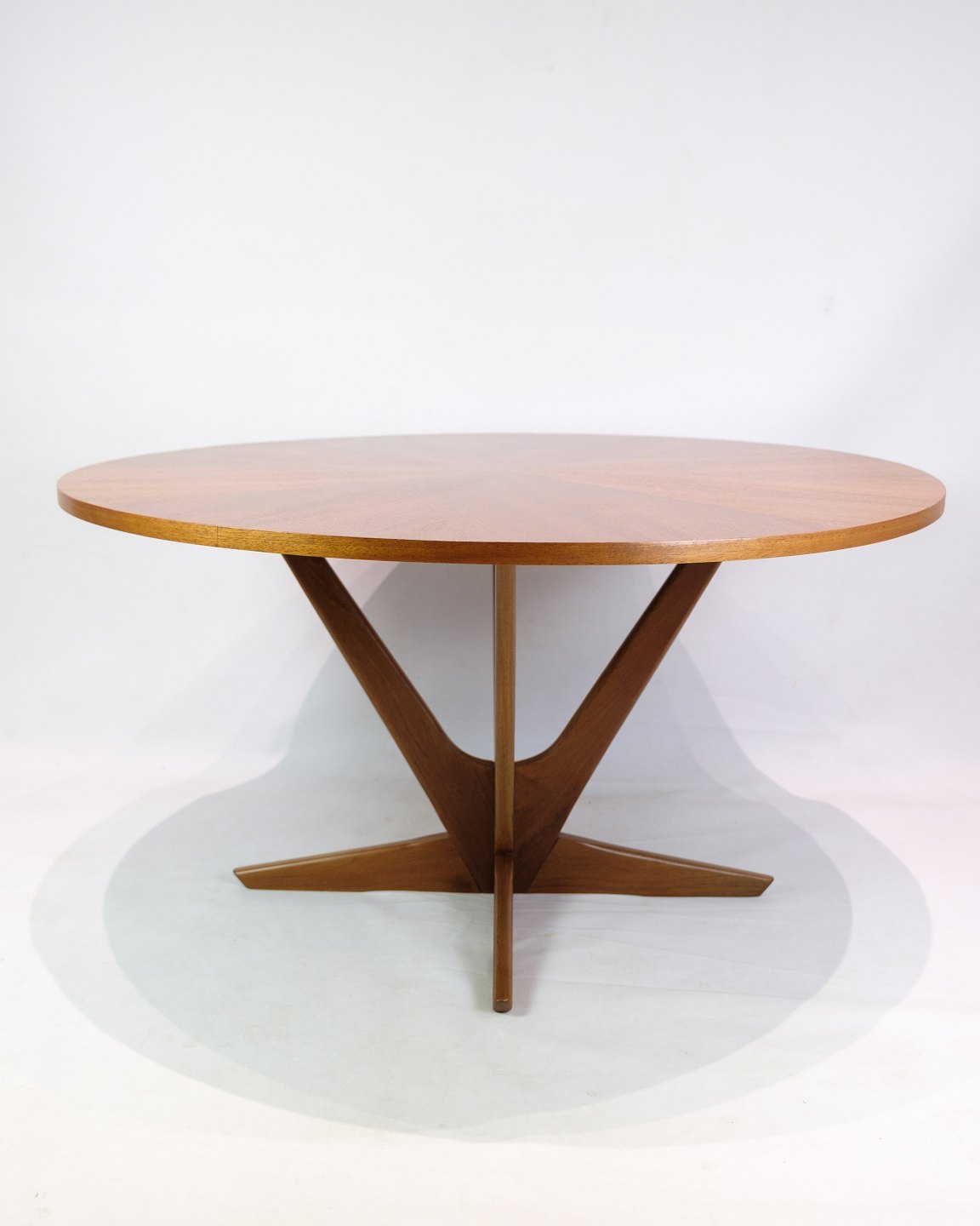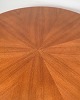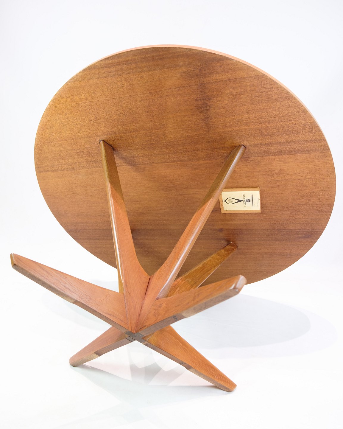 Round teak coffee table, designed by Holger Georg Jensen and produced by Kubus in the 1960s. The tabletop is made of teak veneer with a beautiful star-patterned grain, which gives the table an exclusive and vibrant expression. The base has a distinctive design that both emphasizes the sculptural character of the table and provides a solid construction.