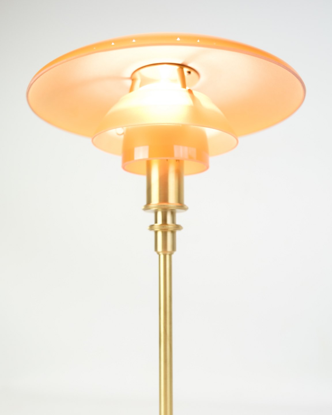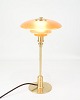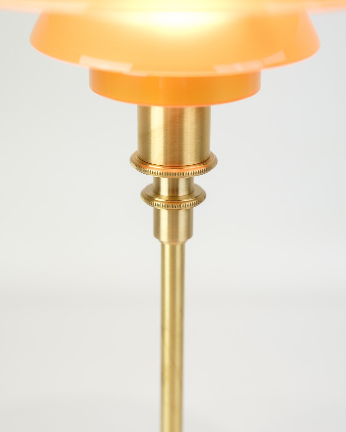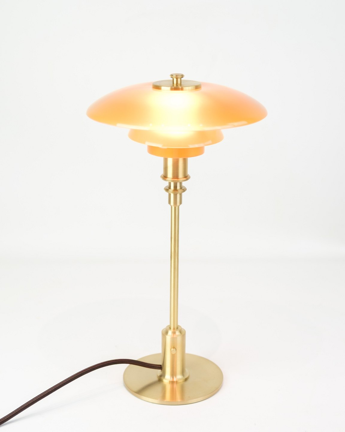 PH table lamp, model PH 2/1, designed by Poul Henningsen and produced by Louis Poulsen as a limited edition. The lamp is made of brass with mouth-blown amber glass shades that provide a warm and pleasant light.