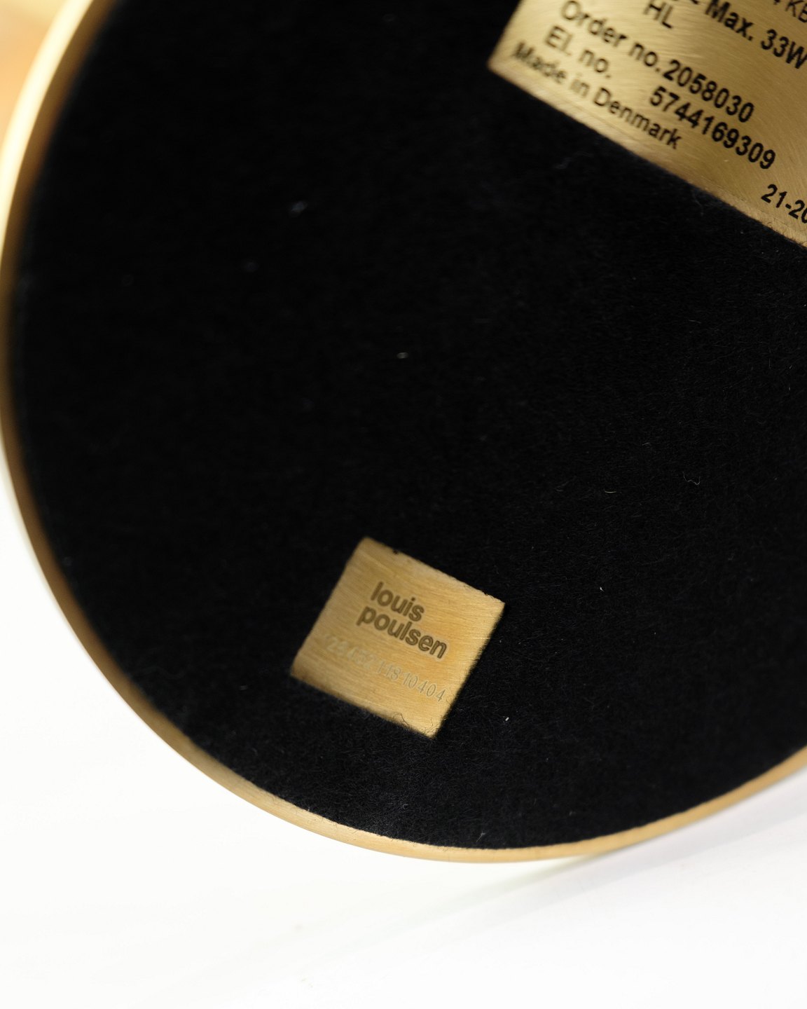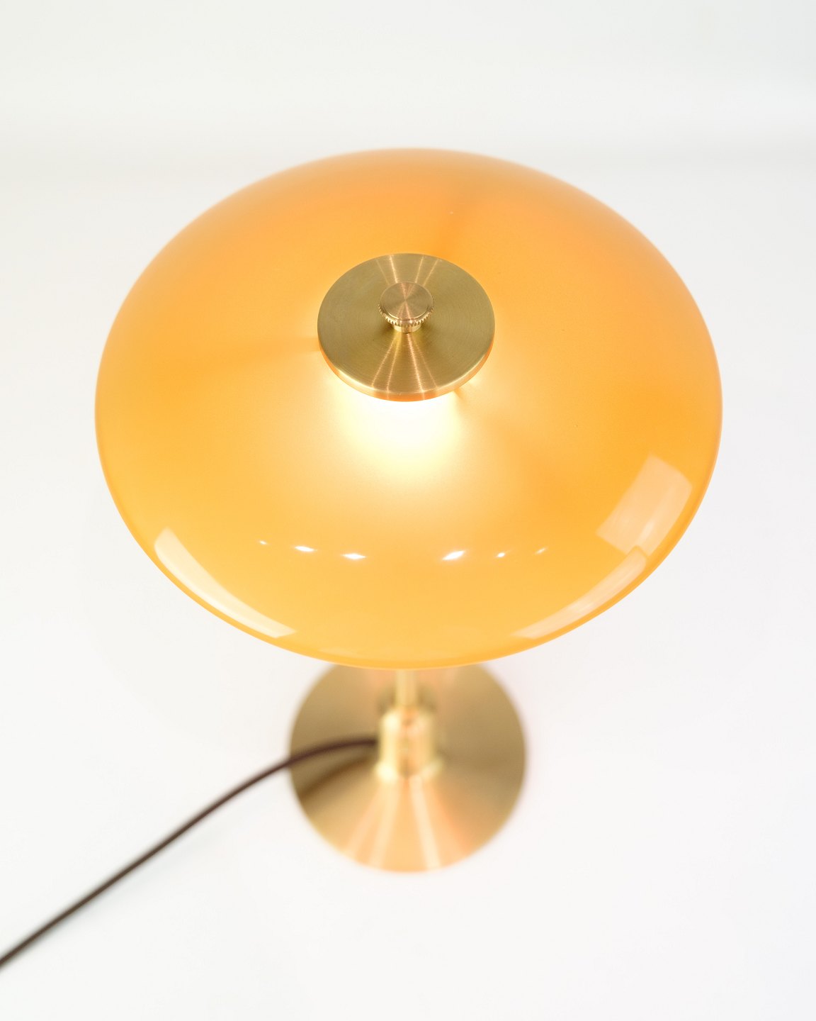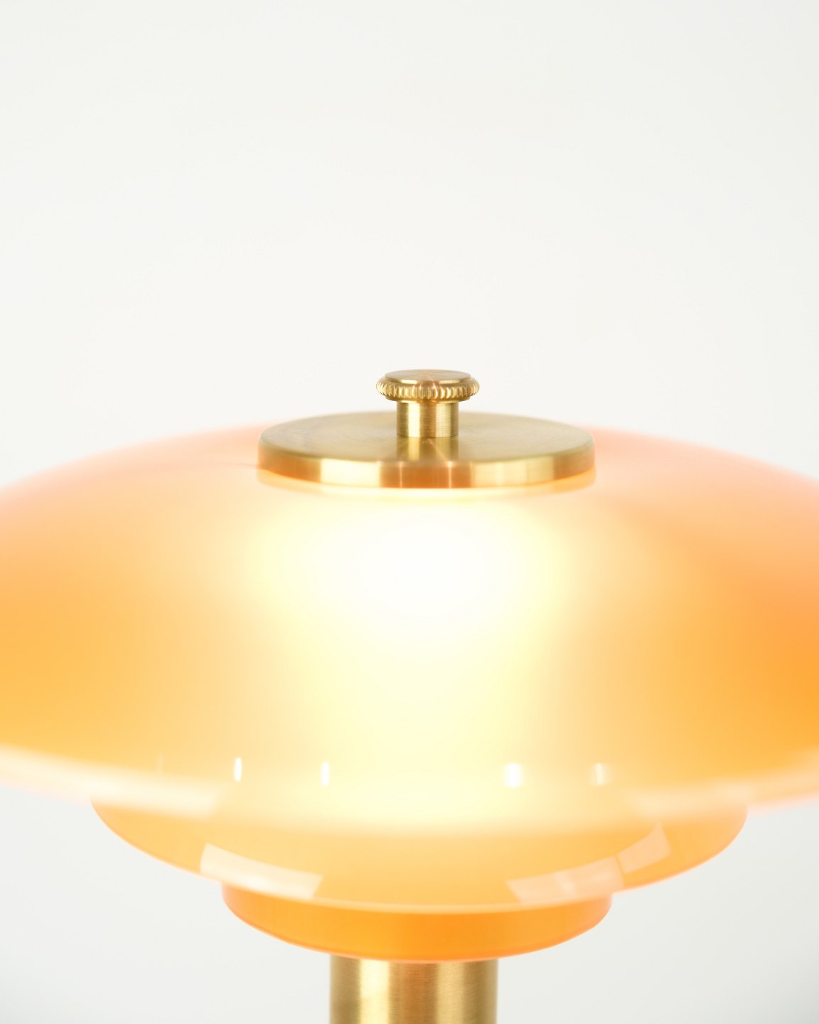 PH table lamp, model PH 2/1, designed by Poul Henningsen and produced by Louis Poulsen as a limited edition. The lamp is made of brass with mouth-blown amber glass shades that provide a warm and pleasant light.
