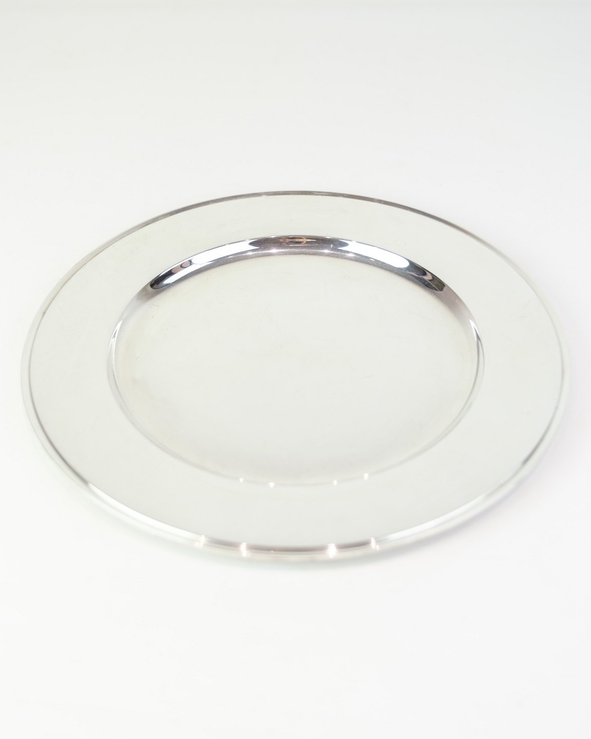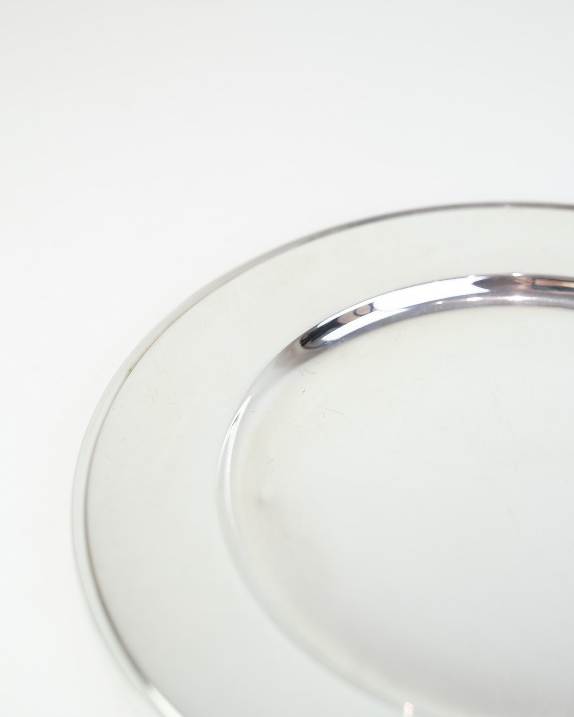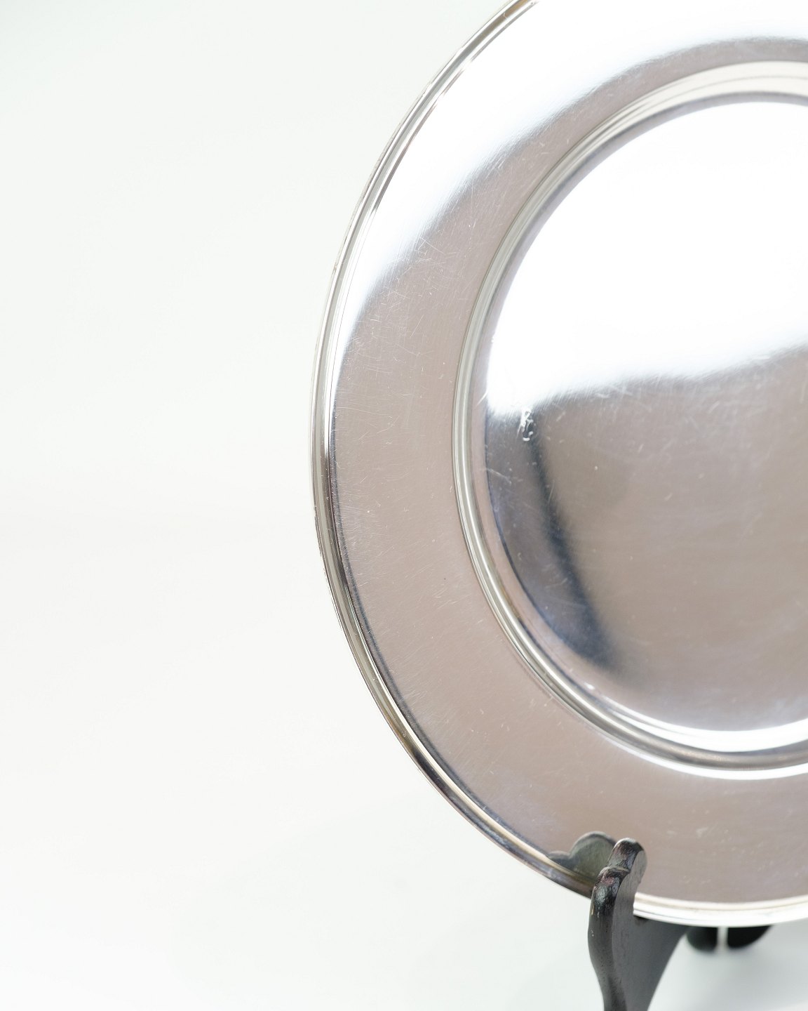 Georg Jensen sterling silver place setting plate, Pyramid model No. 600E. Diameter 26 cm, weight 522 g. Elegant Danish design classic.