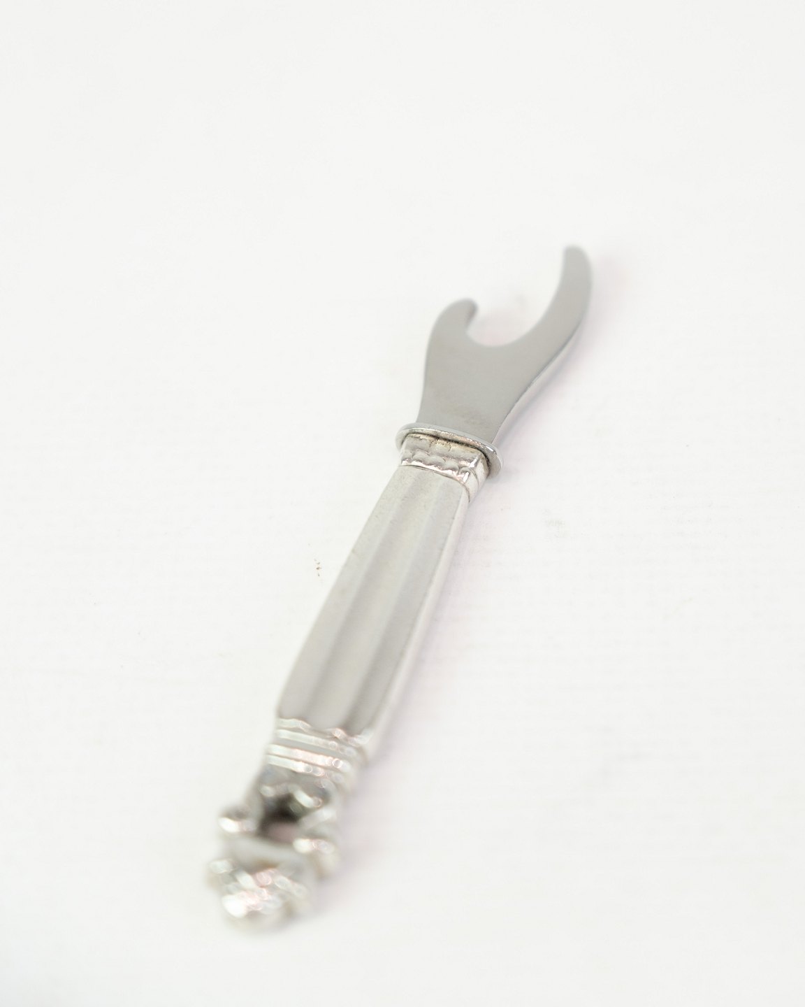 Georg Jensen lomme-flaskeåbner i Konge mønster. Sterling sølv, design af Johan Rohde 1915. Længde 8 cm.