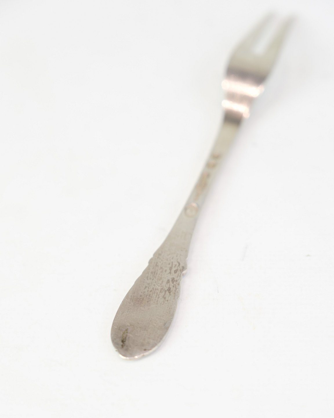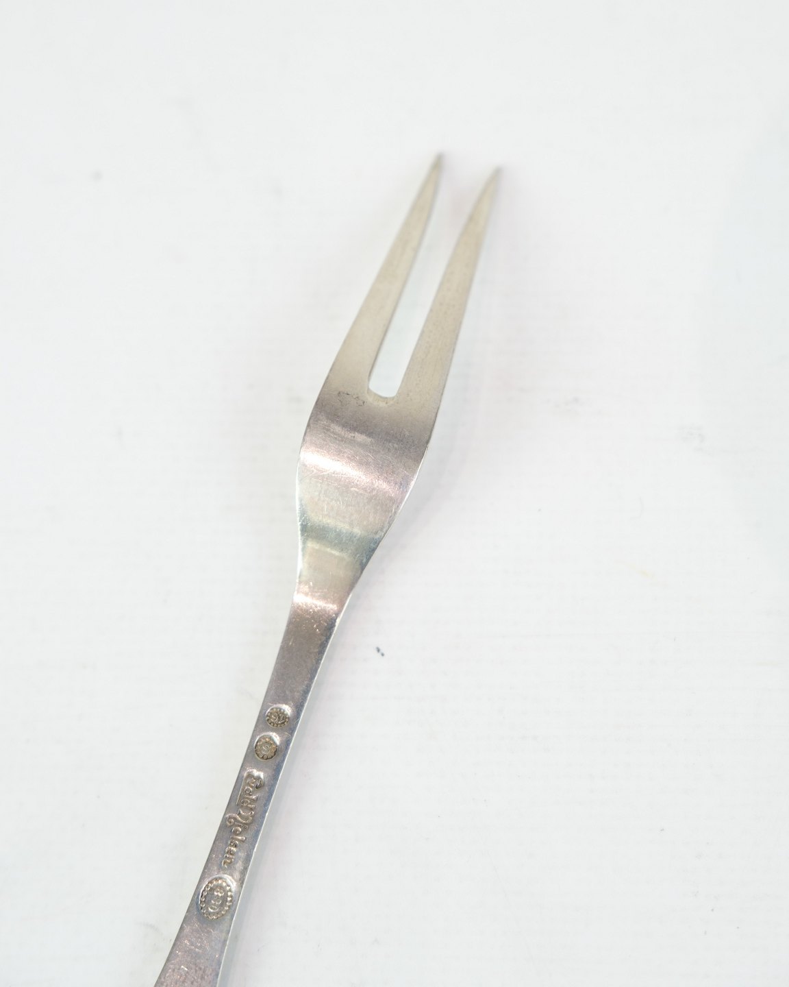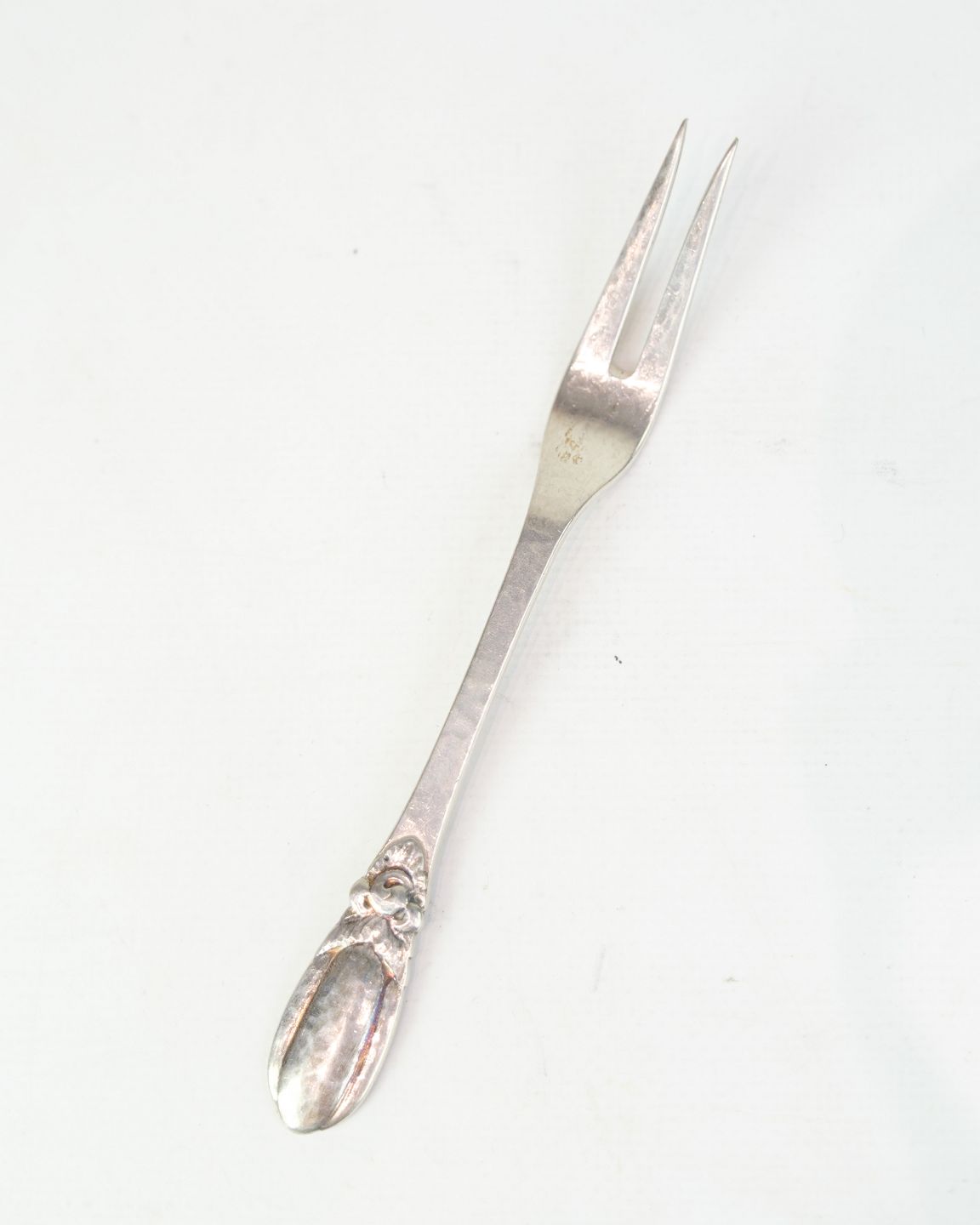 Evald Nielsen pålægsgaffel i ægte sølv. Hammerslået mønster, Model No. 16. Længde 15 cm. Klassisk dansk sølvarbejde.