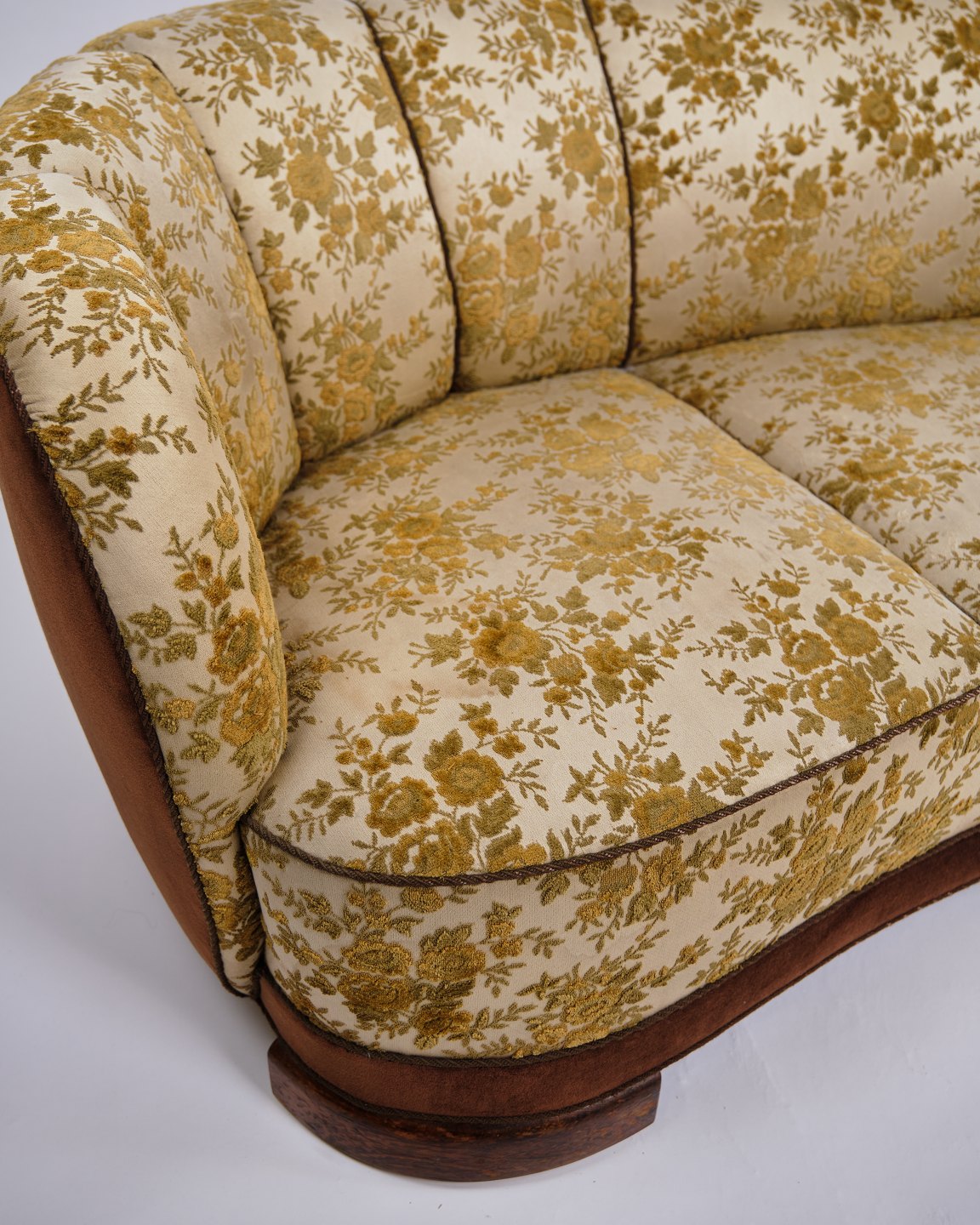 Dansk banan sofa fra 1930-40’erne. Blomstret betræk og ben i eg. H: 67 cm, B: 200 cm, D: 69 cm, SH: 36 cm. Klassisk dansk møbelhåndværk