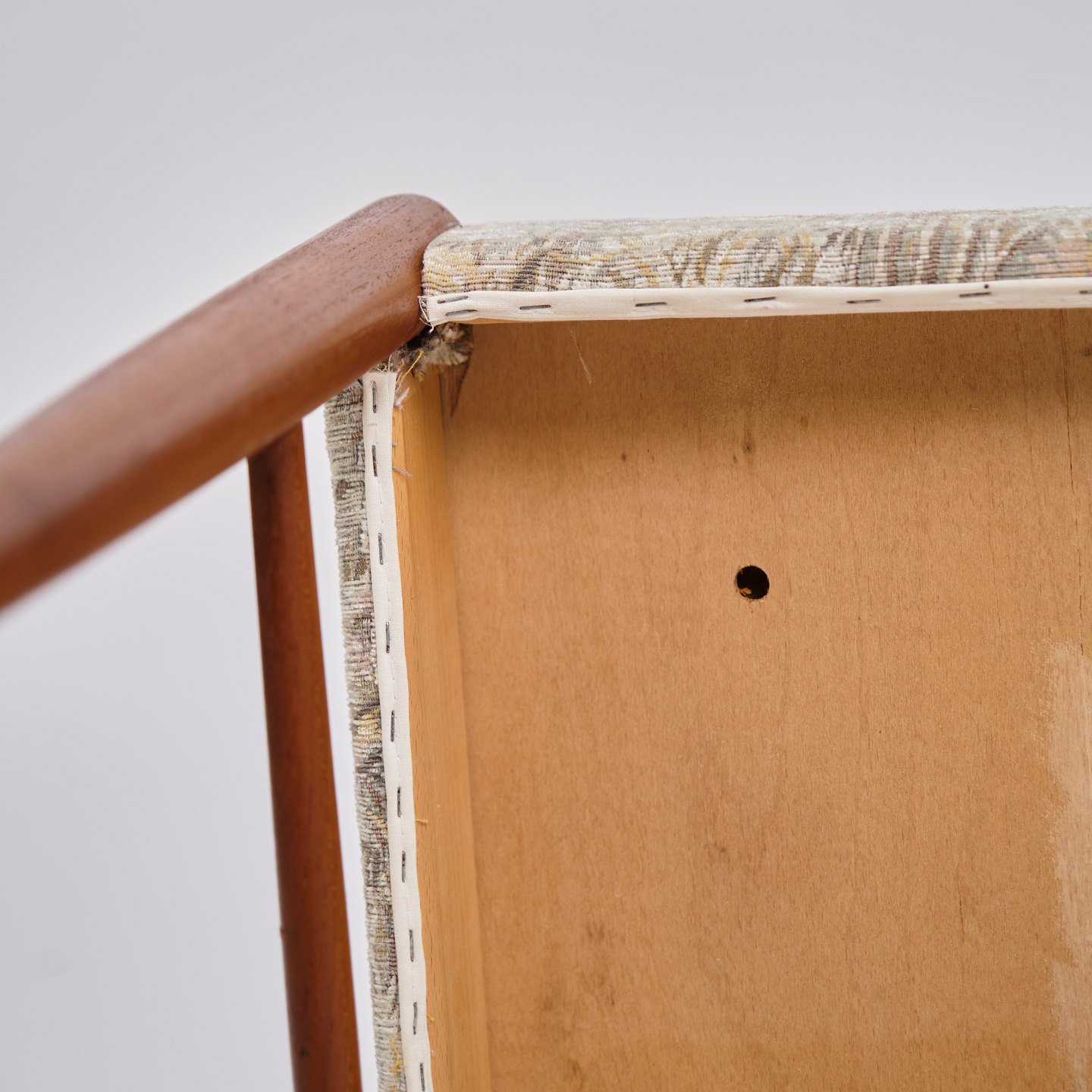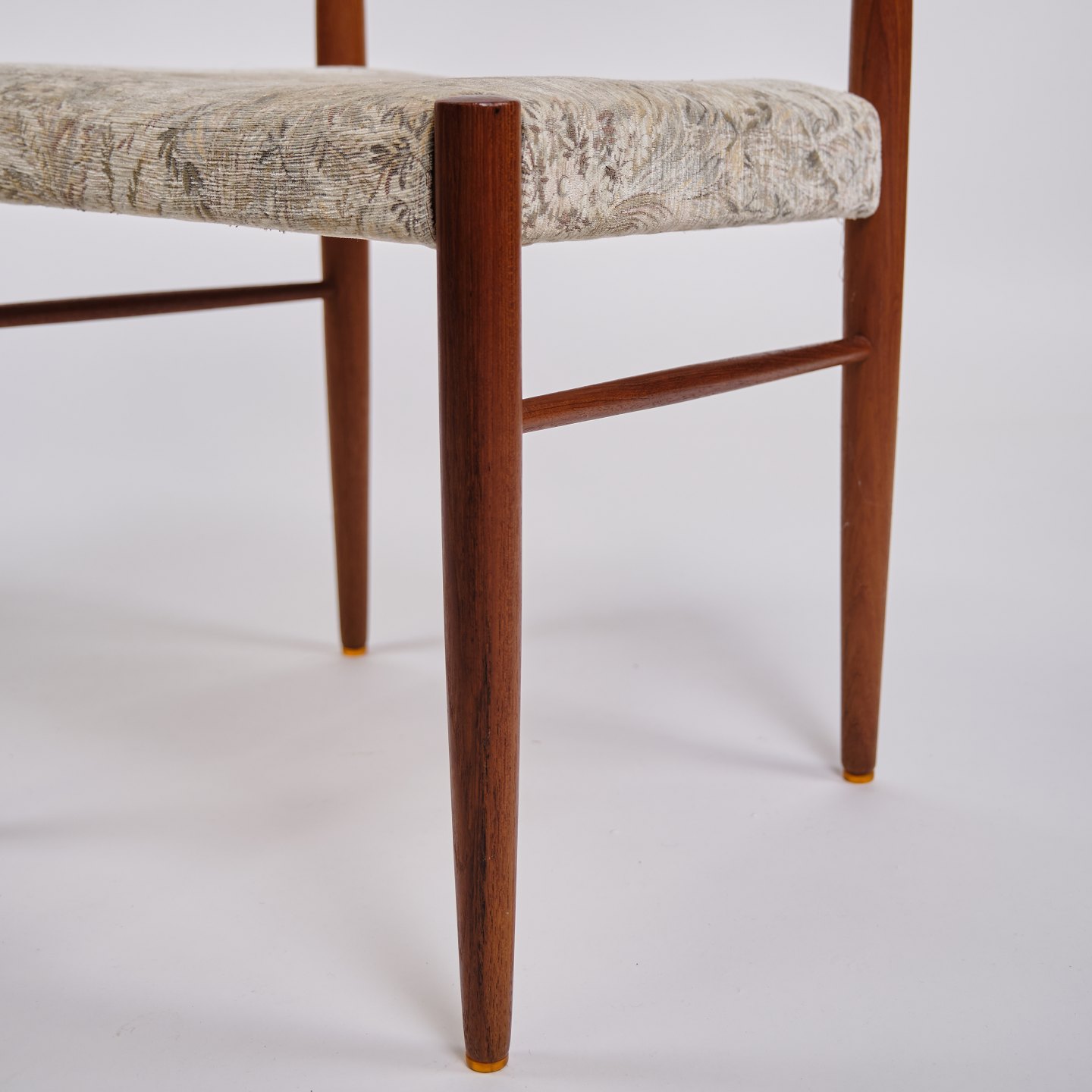 Sæt af seks spisebordsstole af Henry W. Klein for Bramin. Teaktræ og lys polstring. Danmark, 1960’erne. H: 75 cm, B: 48 cm, D: 43 cm, SH: 45 cm.