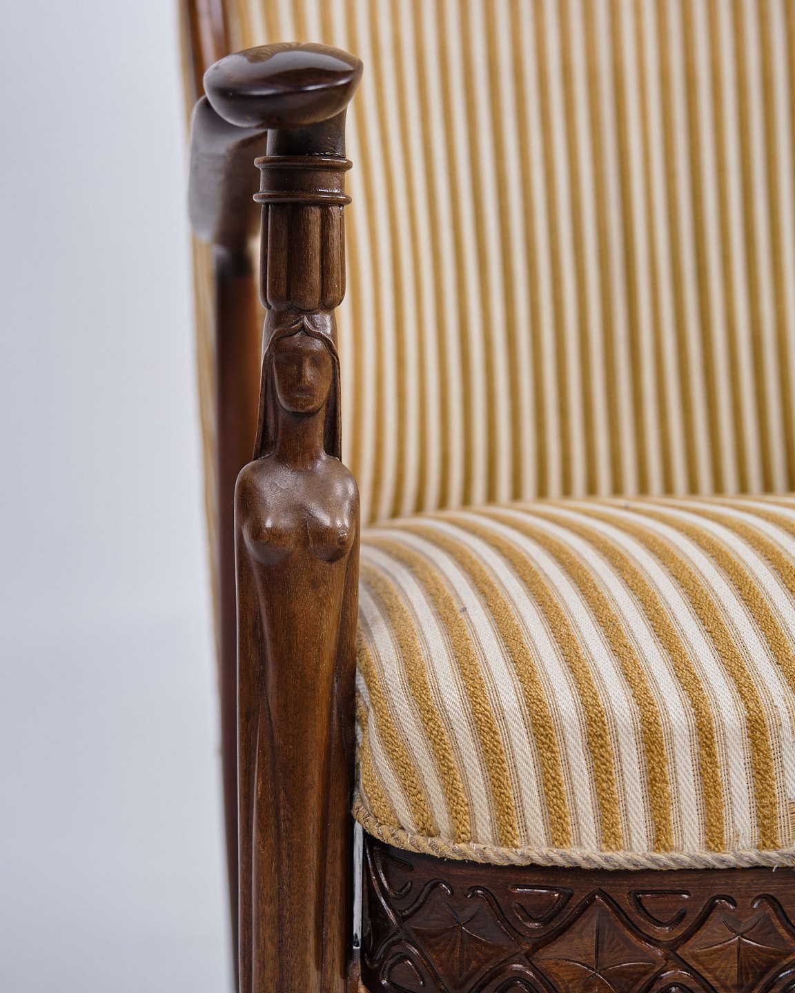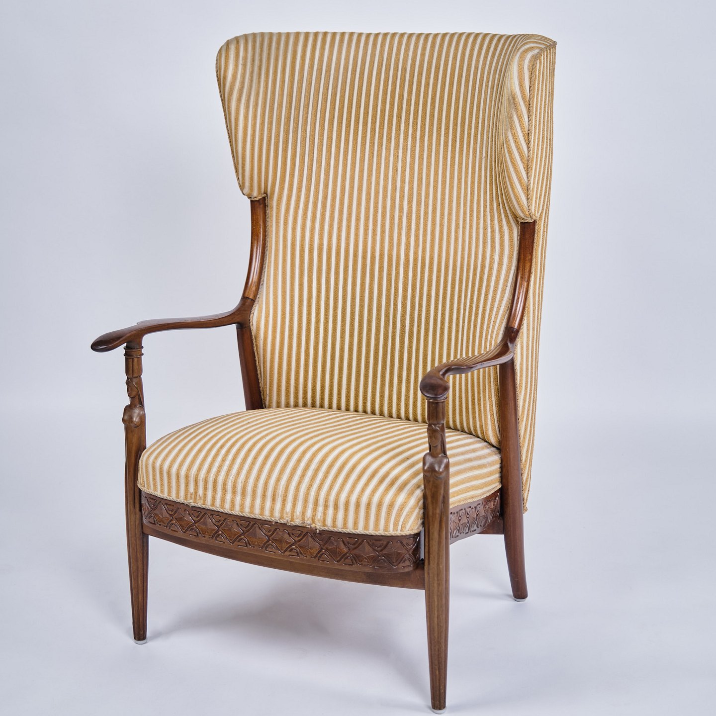 Please contact us for price informationWing chair from the 1930s. Rosewood with striped upholstery. Classic joinery.