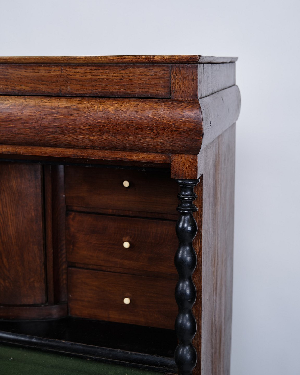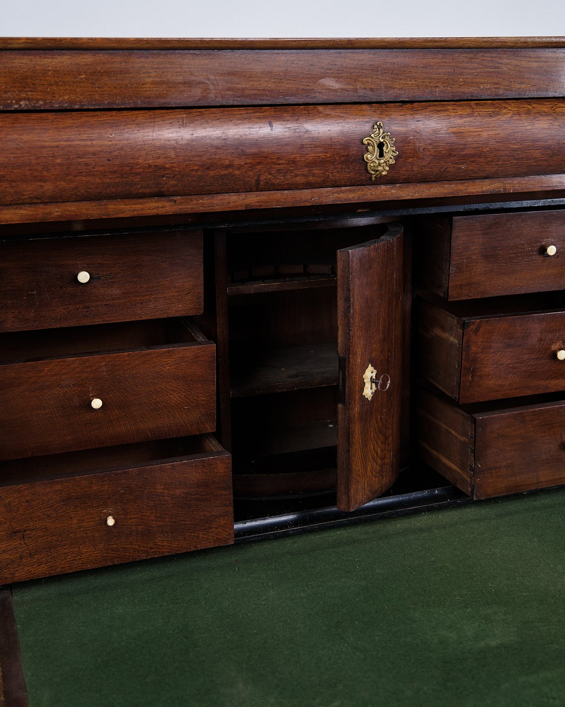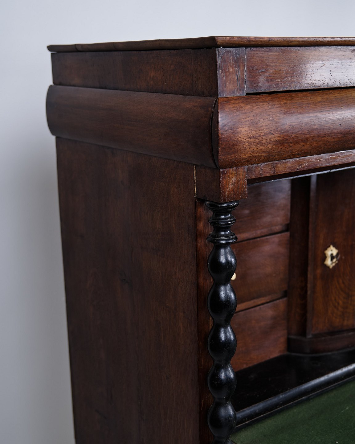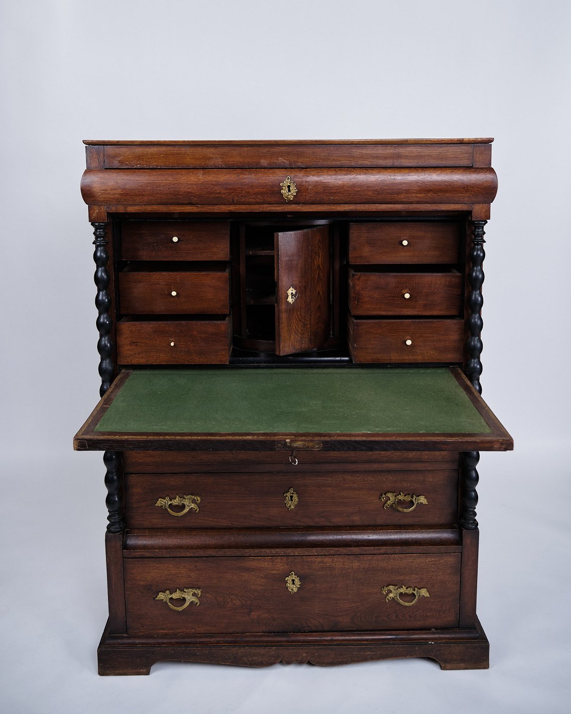 Antique secretary from the 1820s. Oak with green felt cloth and brass handles. 4 drawers.