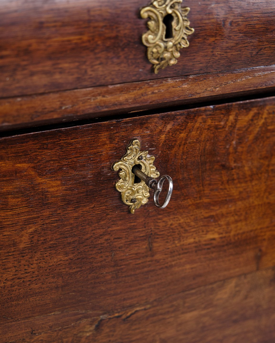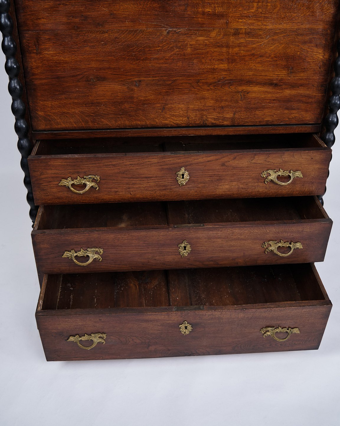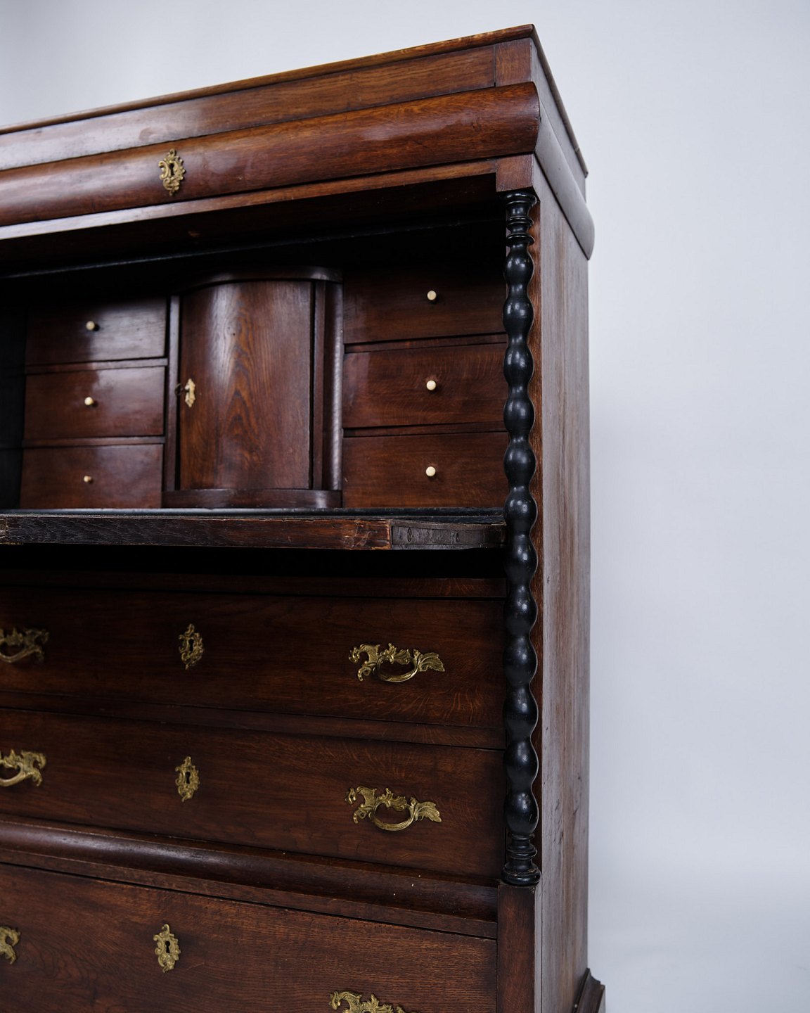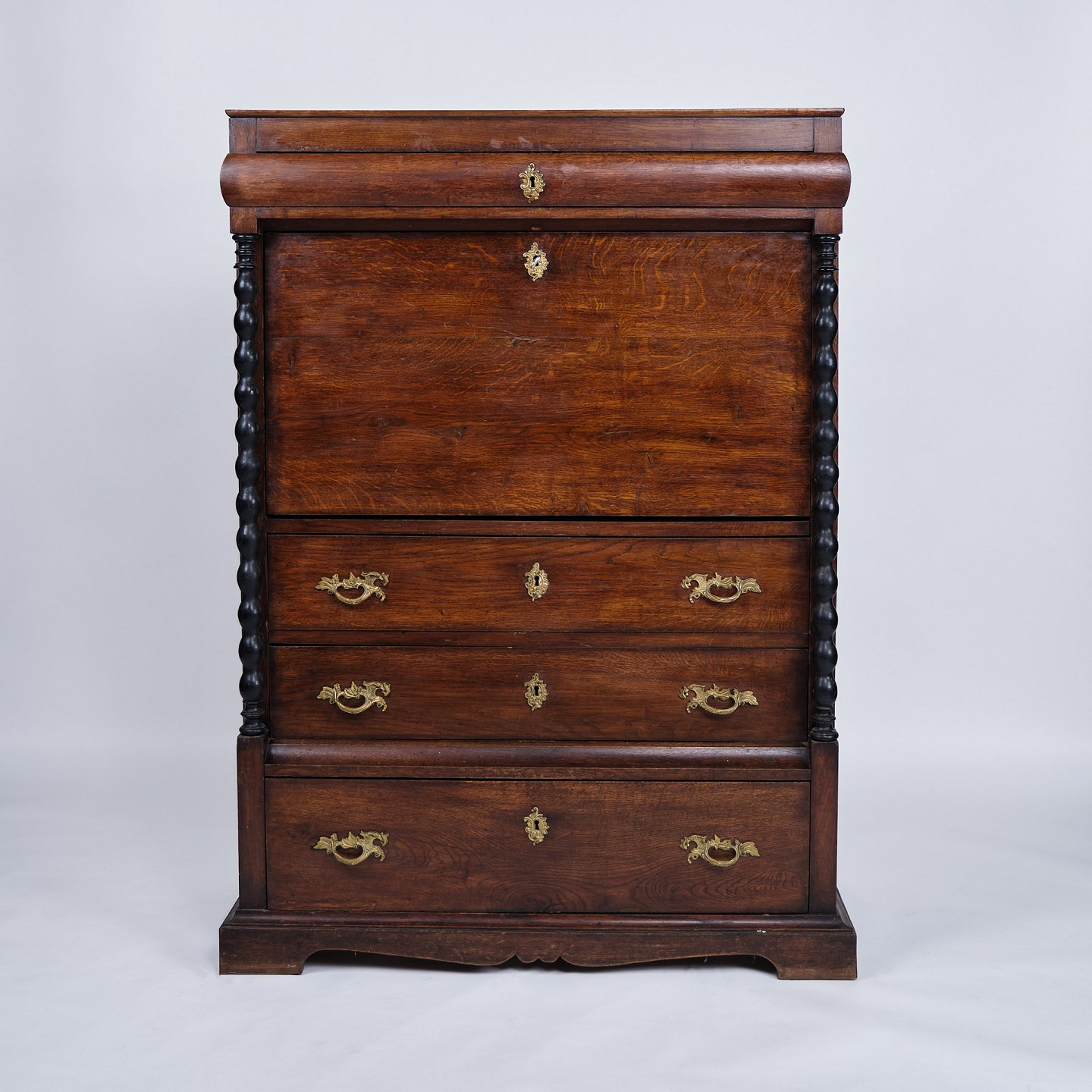 Antique secretary from the 1820s. Oak with green felt cloth and brass handles. 4 drawers.