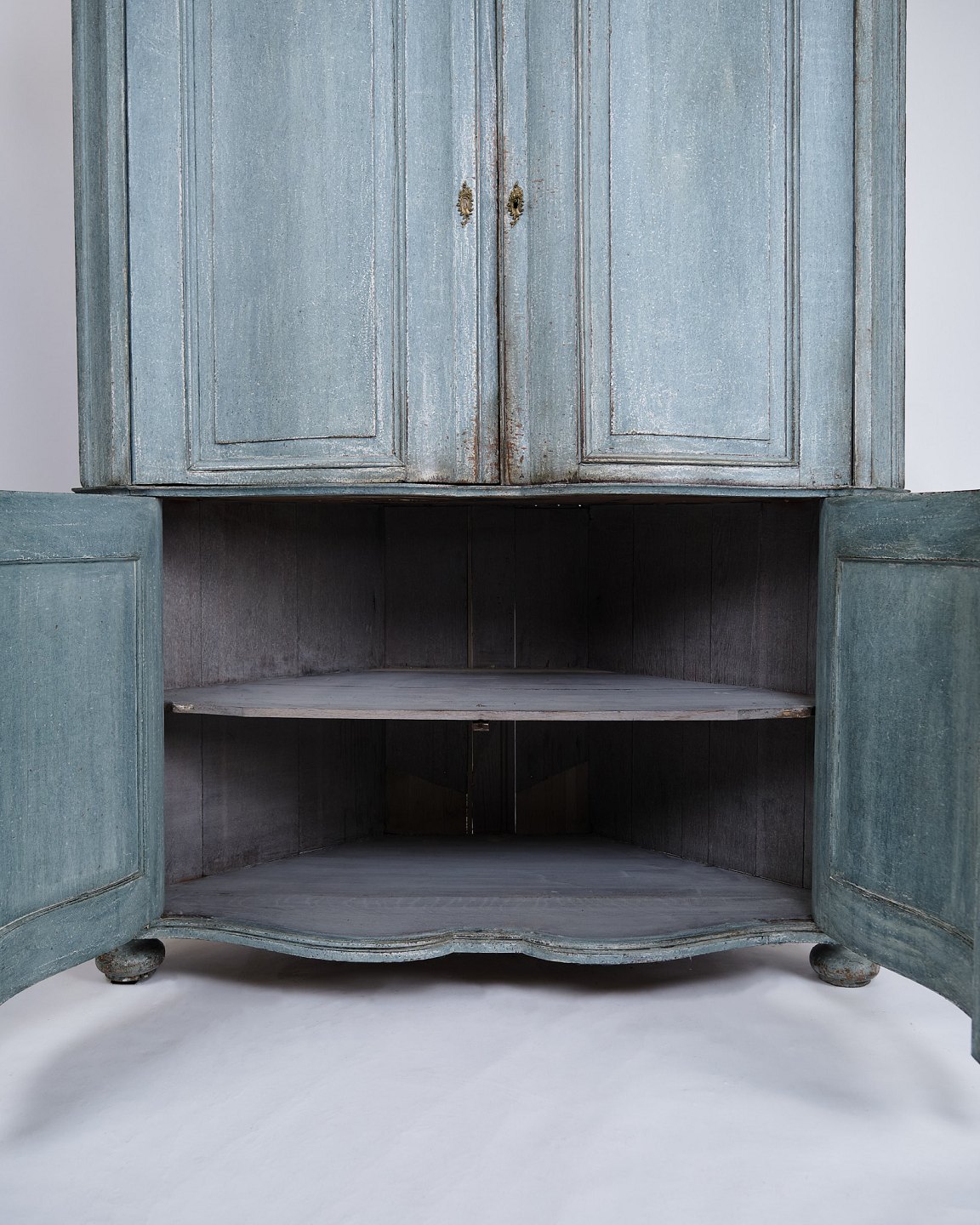 Kontakt os vedrørende prisStort barok hjørneskab fra 1780’erne. Original blå bemaling, buede låger og messingbeslag. Sjældent og autentisk antikt møbel.