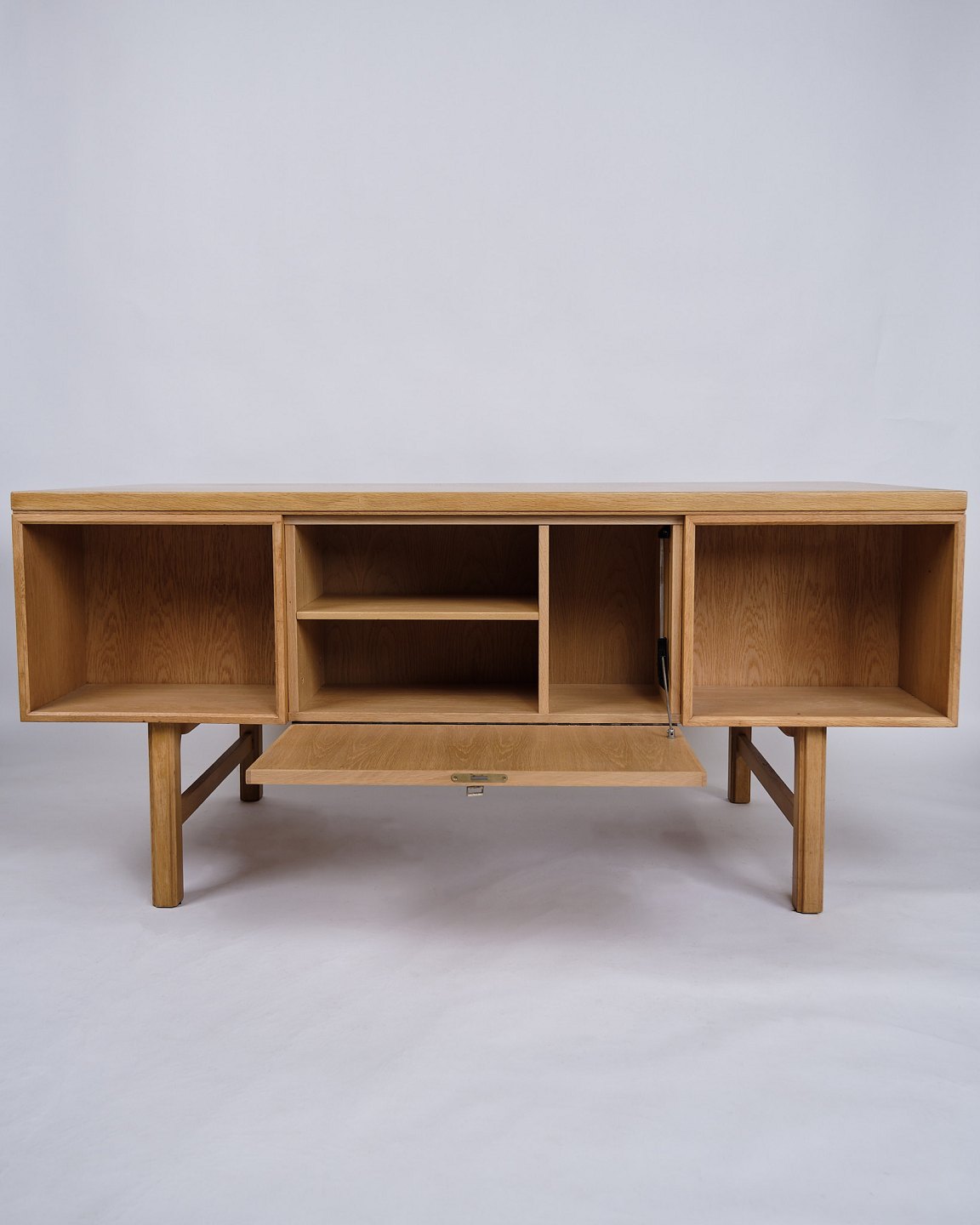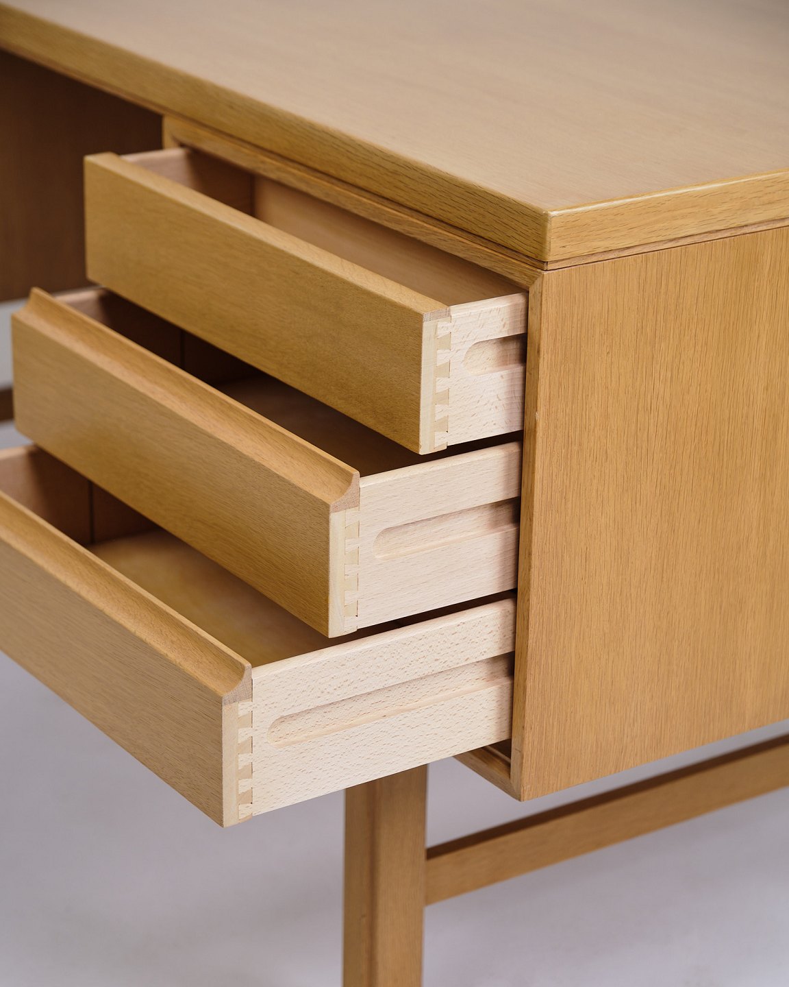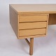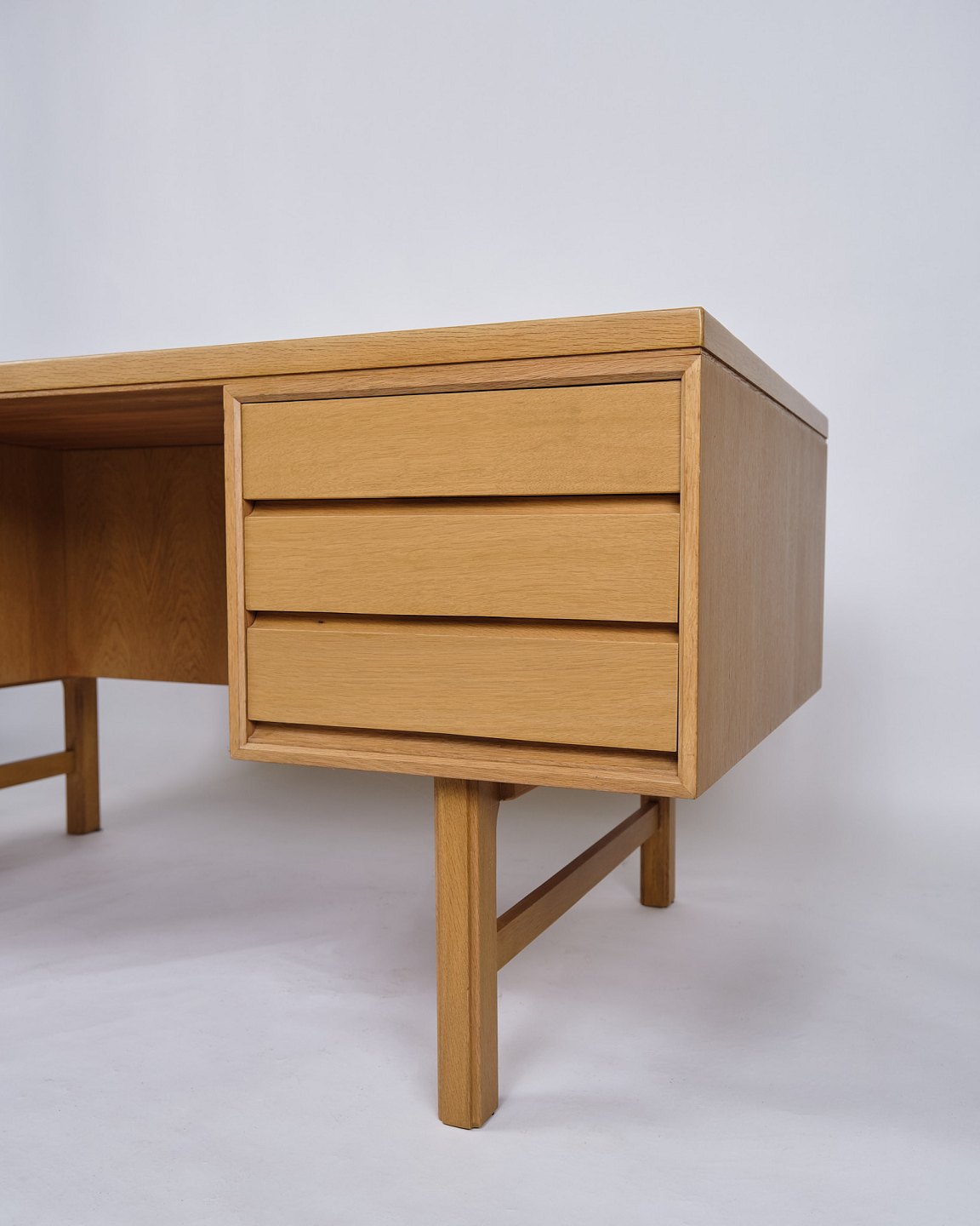 Freestanding oak desk by Omann Junior. Six drawers and classic Danish design from the 1960s.