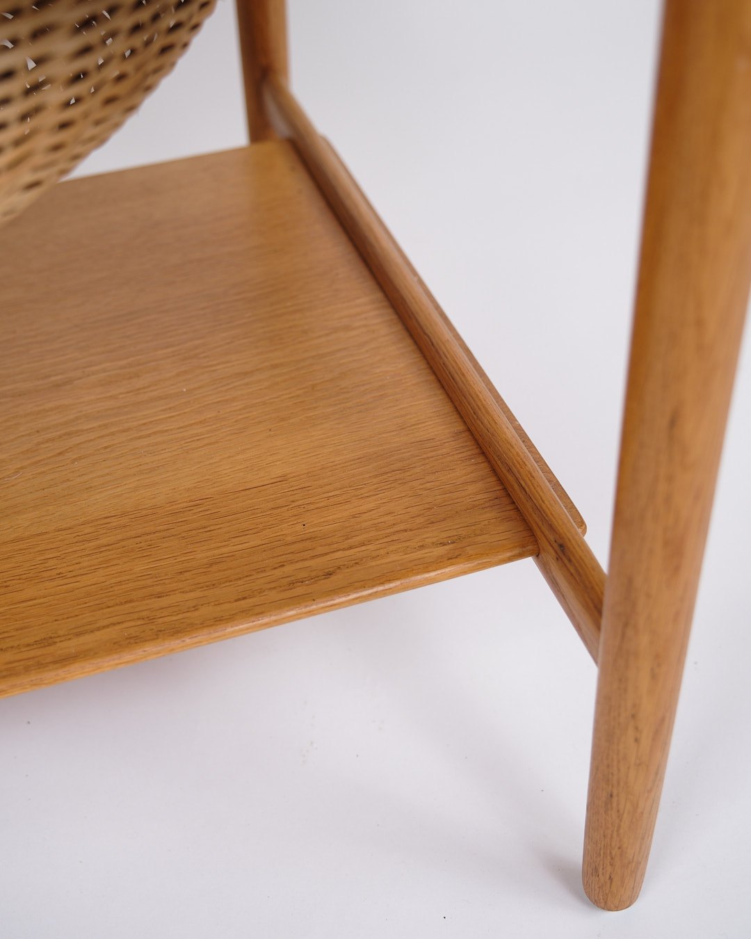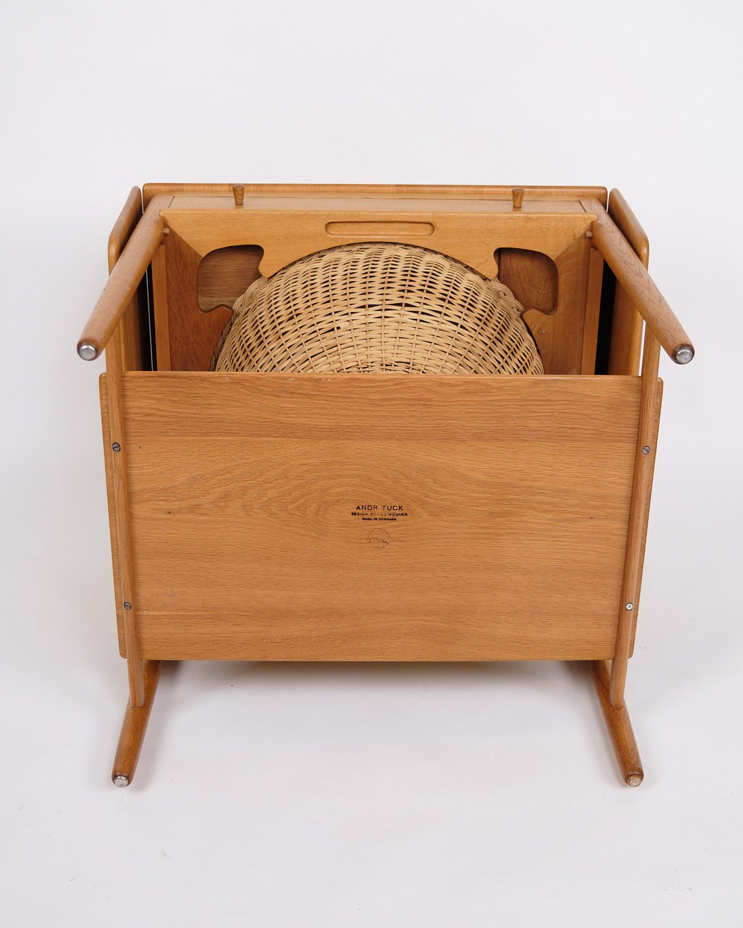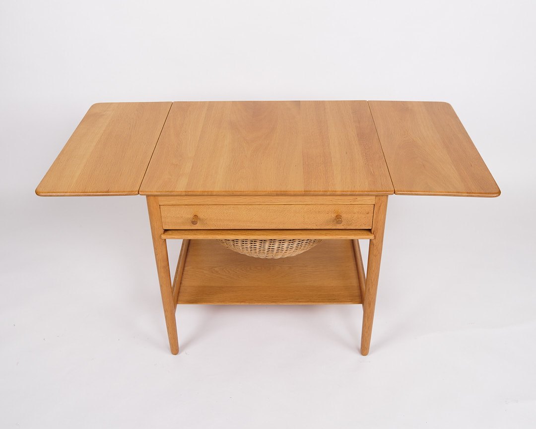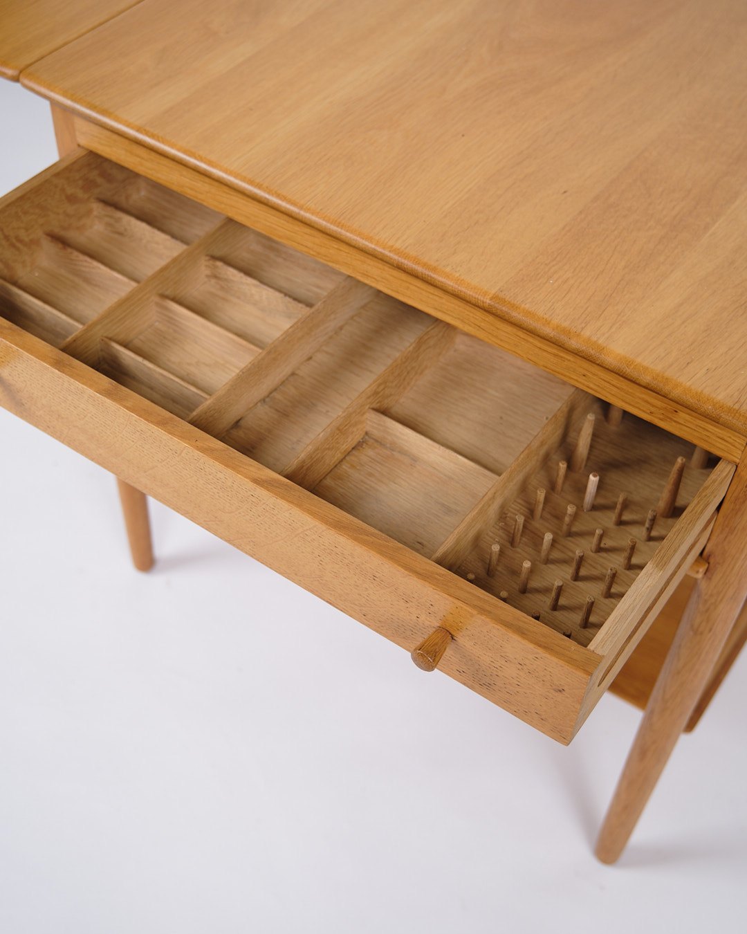 Sewing table, model AT-33, designed by Hans J. Wegner and produced by Andreas Tuck in the 1950s. The table is made of soap-treated oak and equipped with a practical shelf. The tabletop can be extended from 64.5 cm to 118.5 cm, making it both flexible and functional.