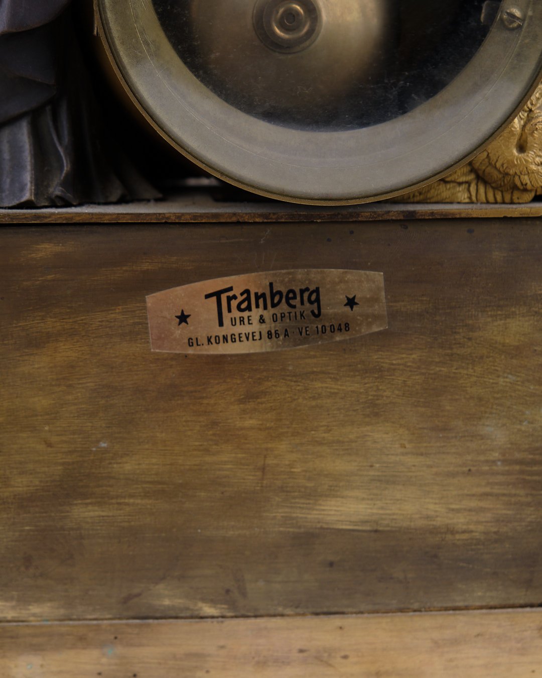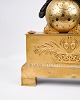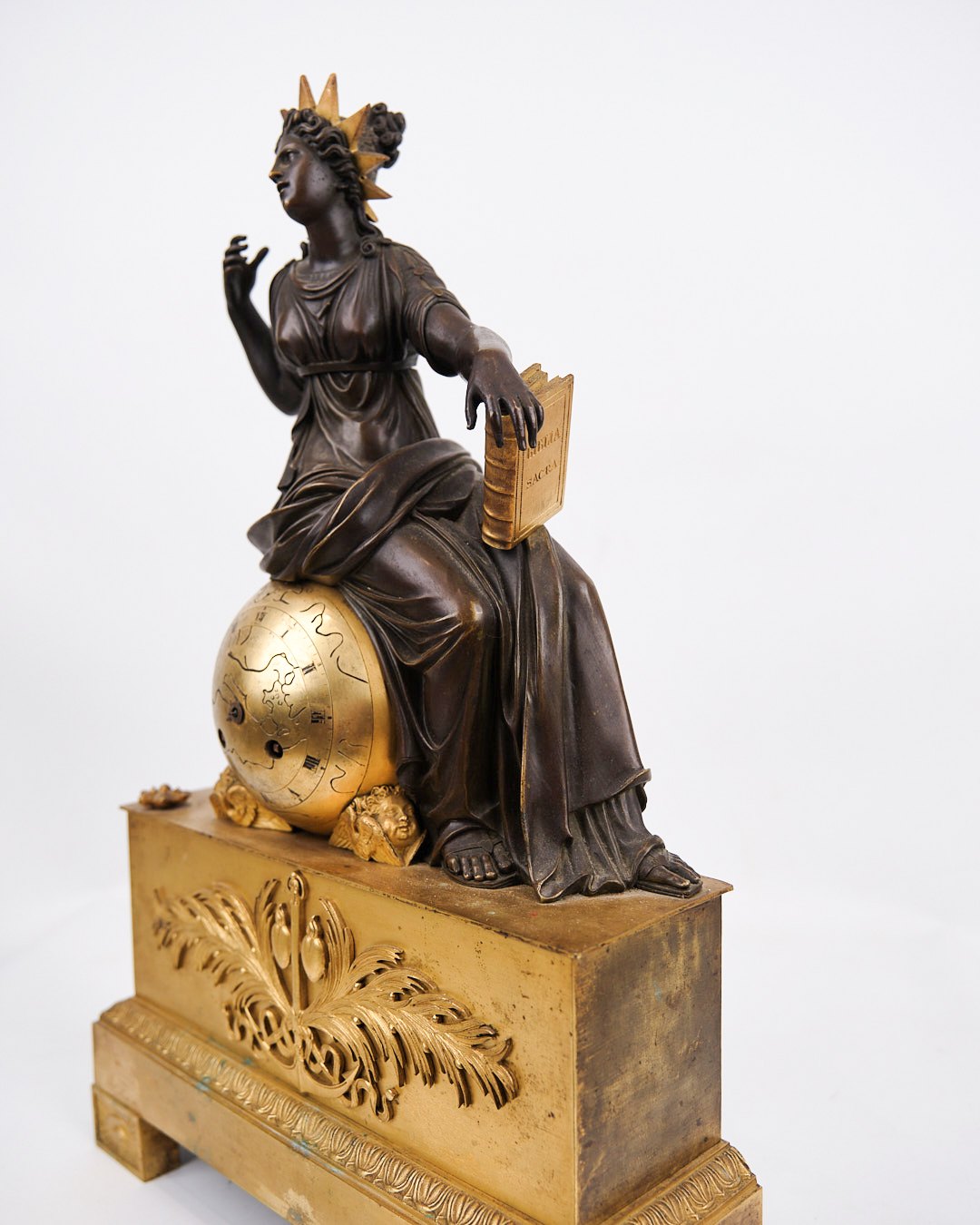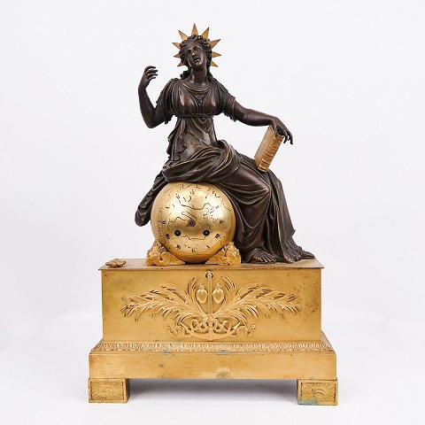 French bronze mantel clock from the 1820s. Empire style with female figure, radiant crown and book. Elegant and well-preserved clock from Paris.