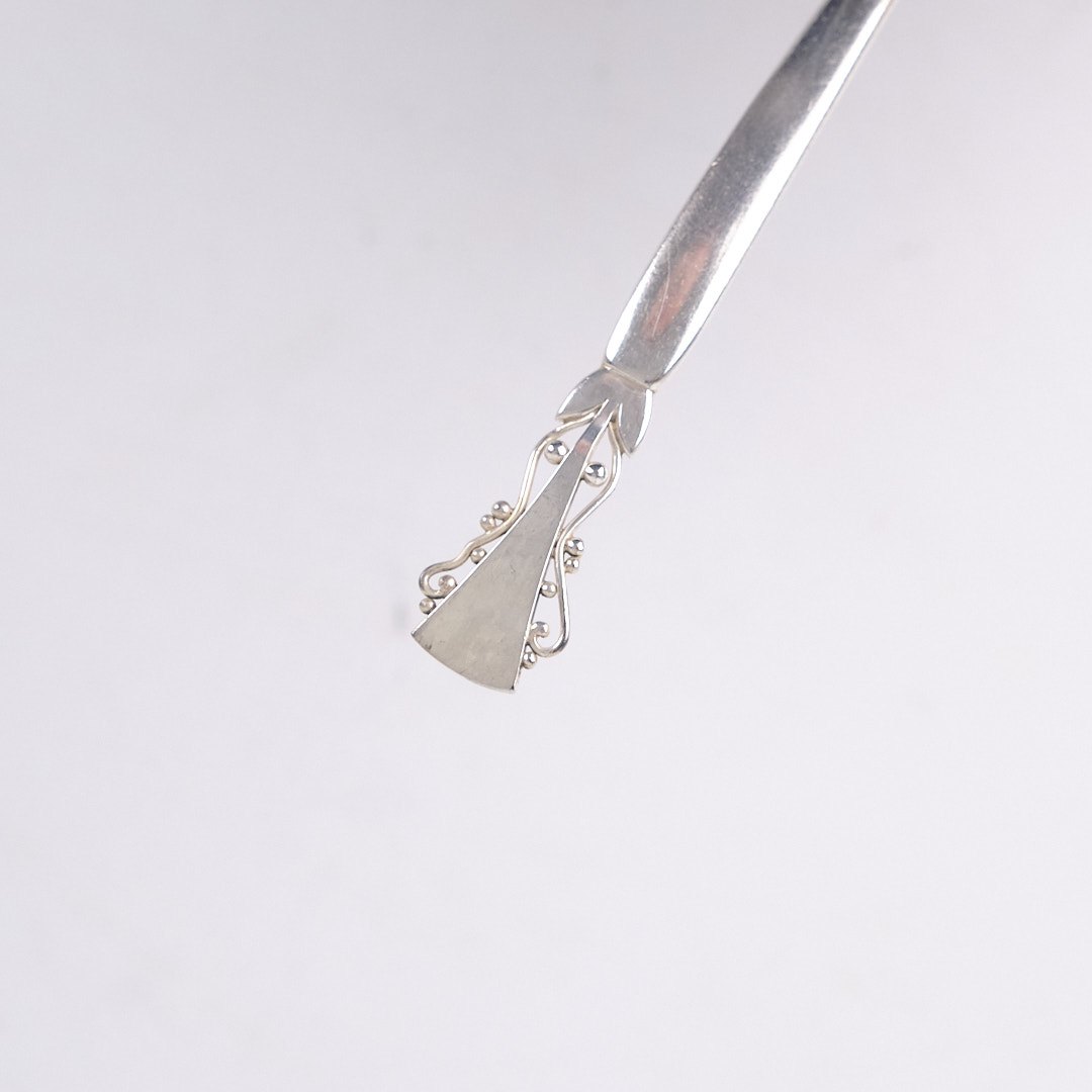 Flødeske udført i tretårnet sølv af sølvsmeden Evald Nielsen. Skeen er stemplet “EN 830s” og bærer Nielsens karakteristiske, enkle formsprog, som kombinerer funktionalitet med elegant håndværk.