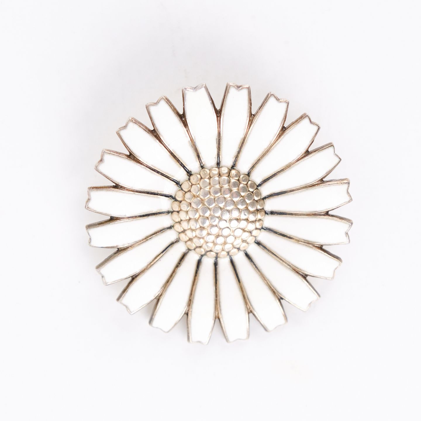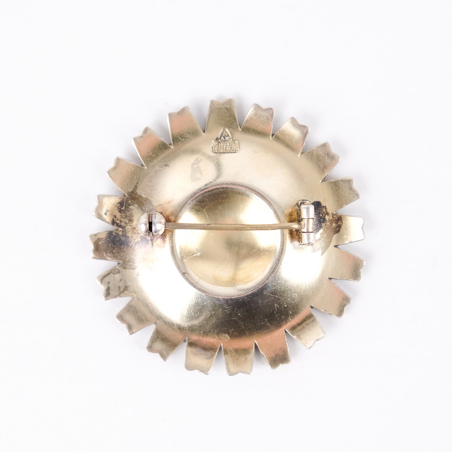 Broche dorée des années 1940 réalisée par Anton Michelsen, poinçonnée AM Sterling Denmark. L’émail est intact. Une pièce représentative du savoir-faire danois et un bijou décoratif bien conservé.