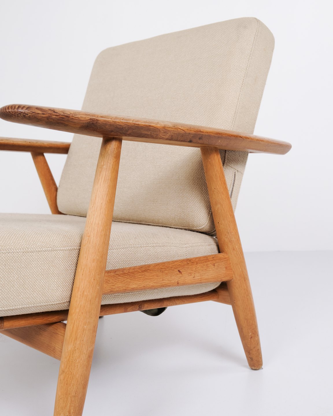 Sæt af to originale “Cigar” lænestole, model GE 240, designet af Hans J. Wegner og fremstillet af Getama i 1960’erne. Stolene er udført i massiv eg med polstring i lyst stof.