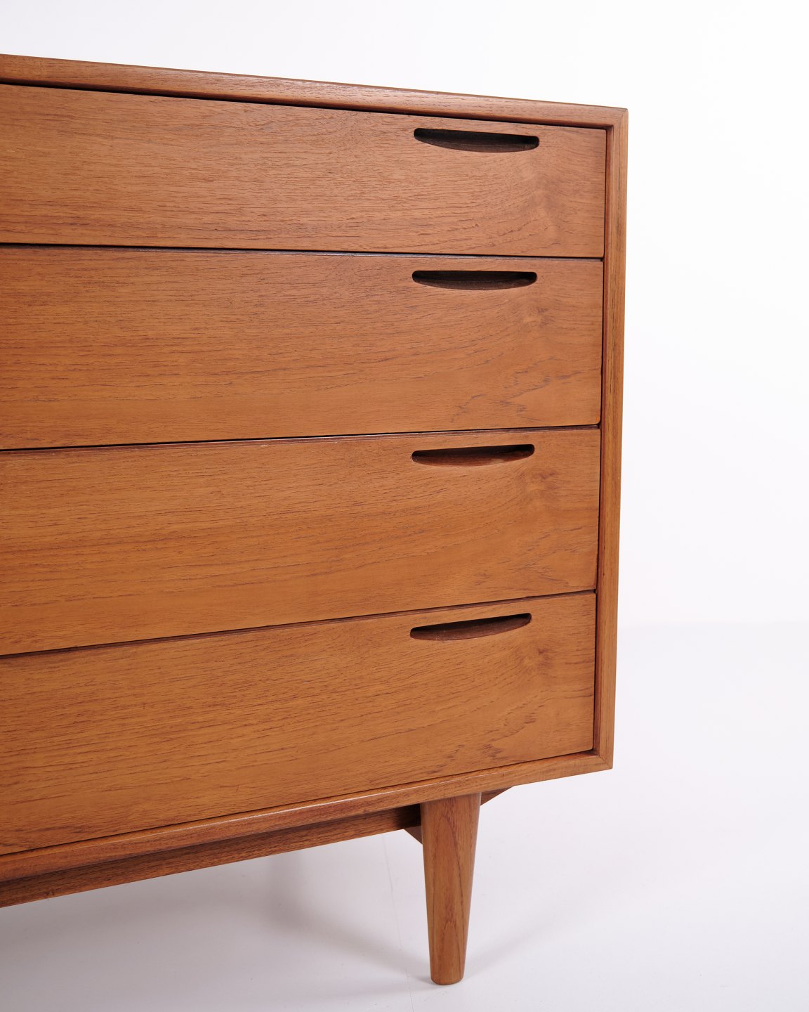 Kommode designet af Ib Kofod-Larsen og fremstillet af Brande Møbelfabrik i 1950’erne. Kommoden er udført i teaktræ med fire rummelige skuffer og karakteristiske, enkle greb, som understreger Kofod-Larsens rene og funktionelle formsprog.