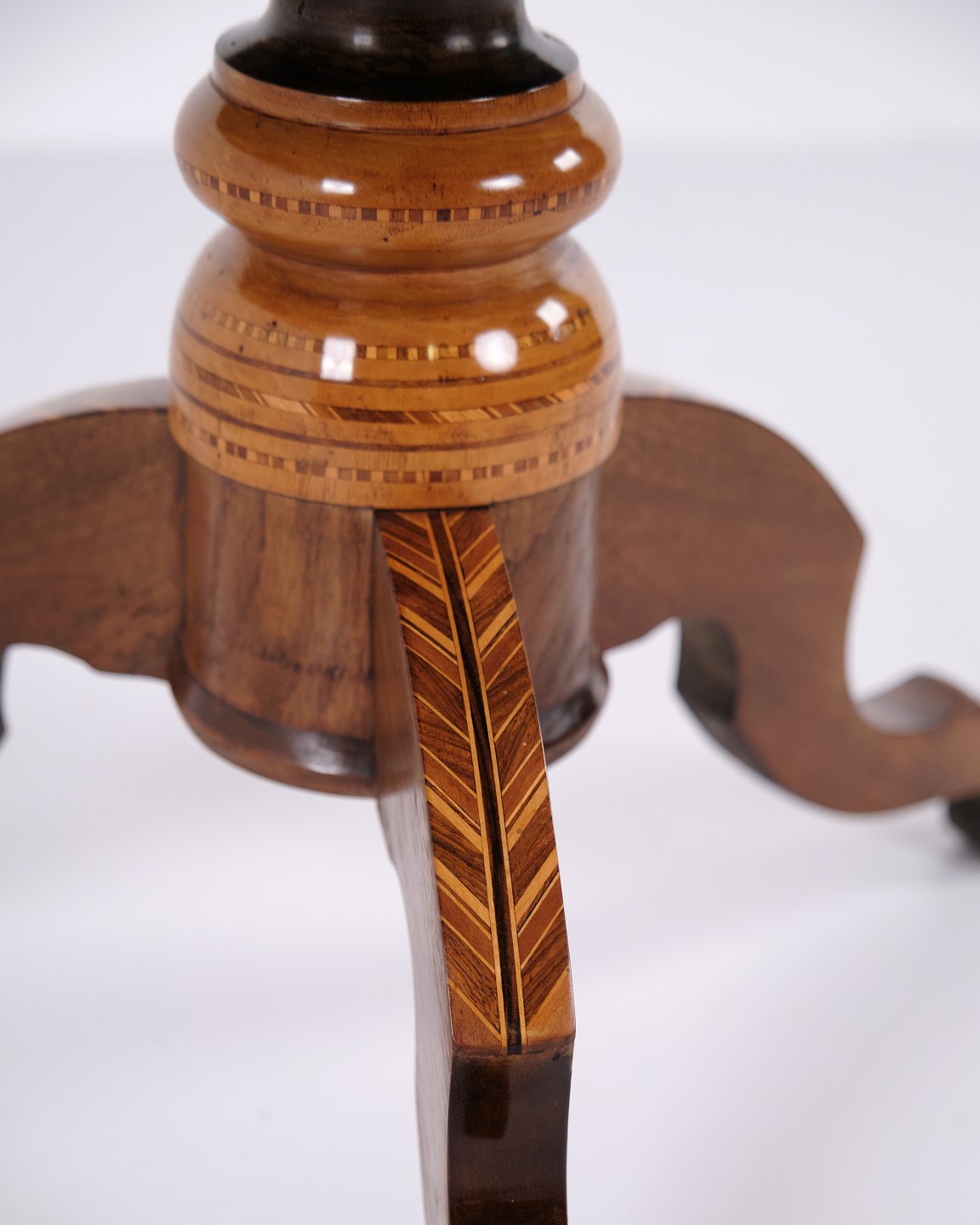 Octagonal column table from Italy, dated to the 1850s. The table is richly decorated with hand-laid intarsia, which emphasizes the geometric shapes and the overall decorative expression.