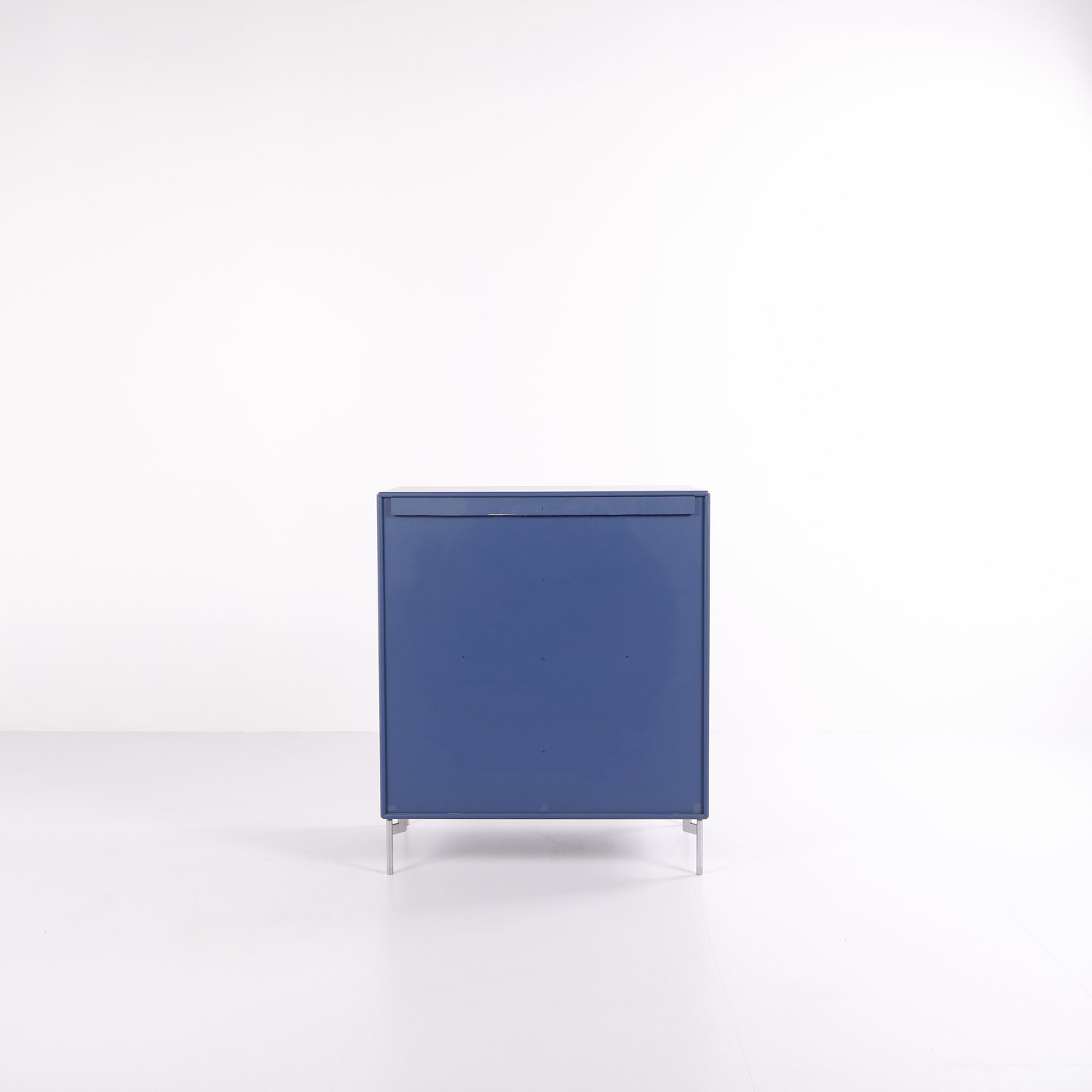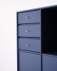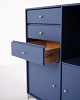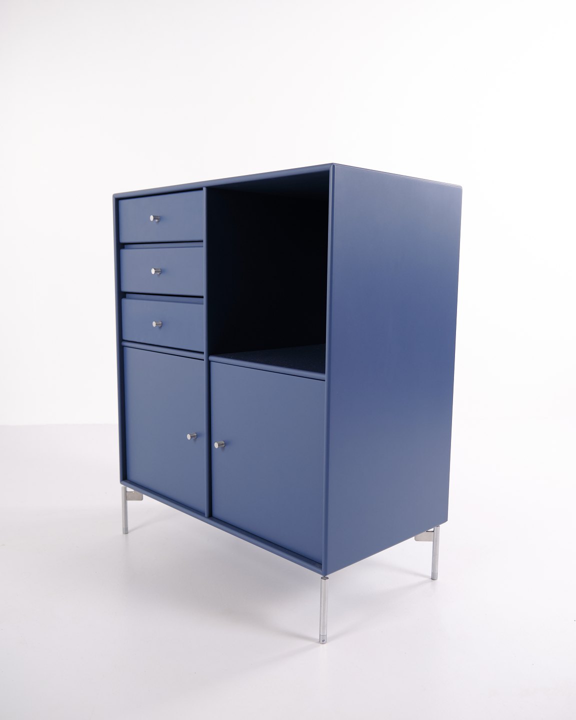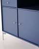 Montana chest of drawers in blue with chrome legs. Designed with three drawers and two doors, offering practical and flexible storage. Classic Montana design with clean lines and high functionality.