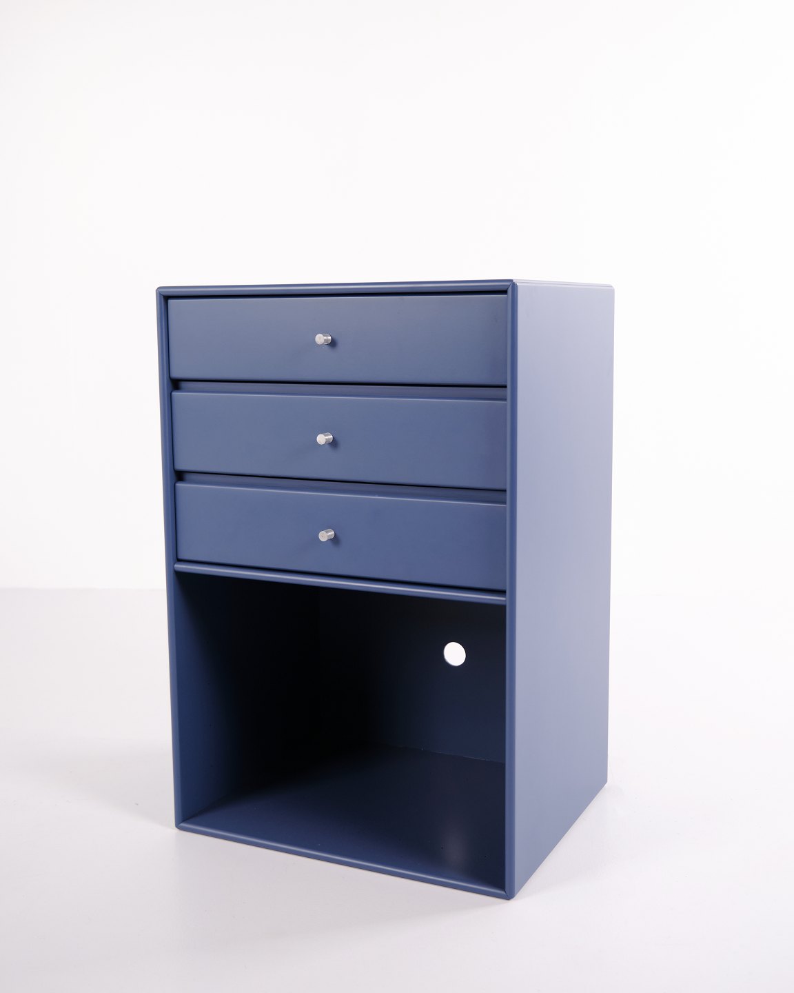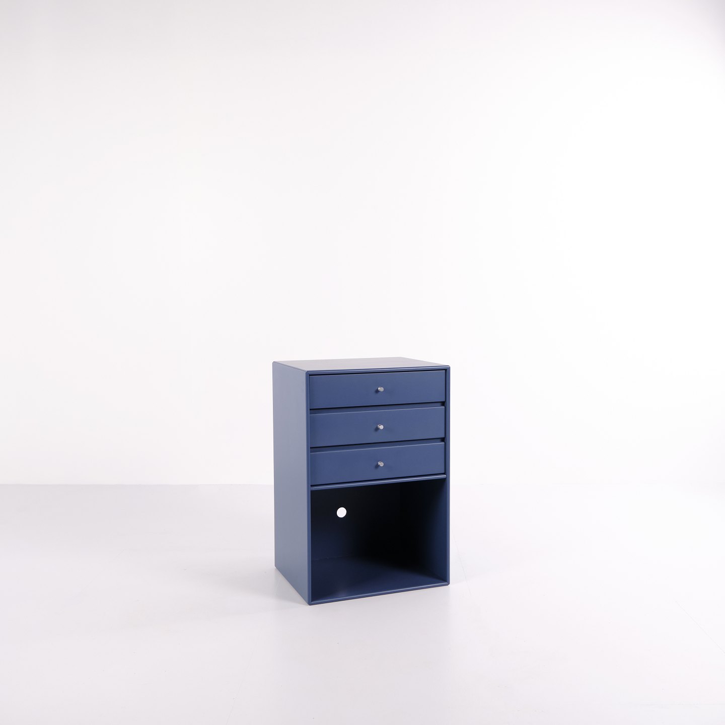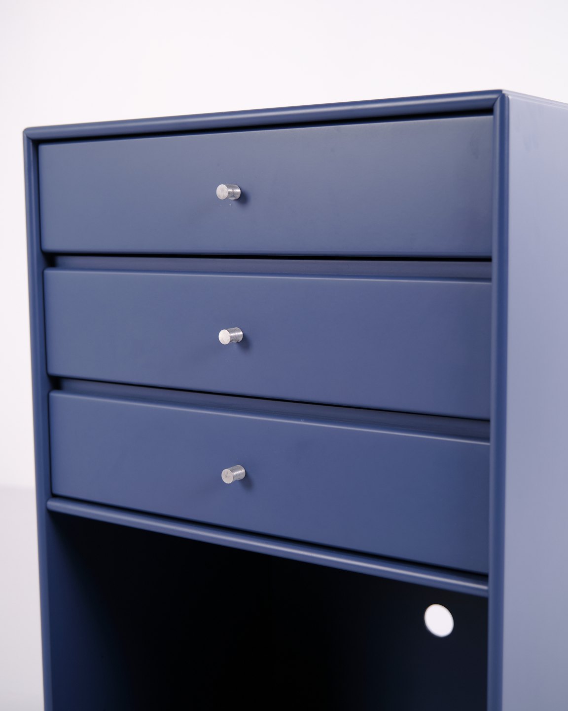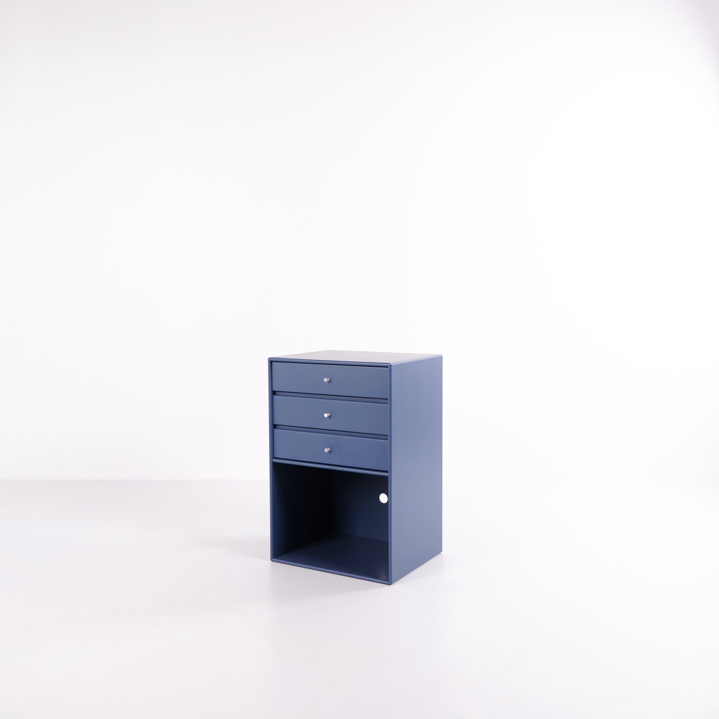 Montana bookcase in blue. Furnished with three drawers and one open shelf, suitable for both storage and display. A classic Montana module that combines functionality and simple design.