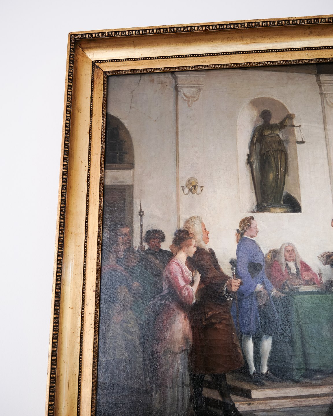 Maleriet viser den afsluttende retsscene, hvor alle er samlet for at høre dommen over Rosiflengius. Han dømmes til at bære den såkaldte “spanske kappe” – en straf, hvor en tønde med hul til hovedet sættes over den skyldige, som derefter føres gennem byen til offentlig spot. I Holbergs komedie straffes Rosiflengius for at uddele overdreven og ukritisk ros; hans navn betyder direkte “ros-på-må-og-få”.
