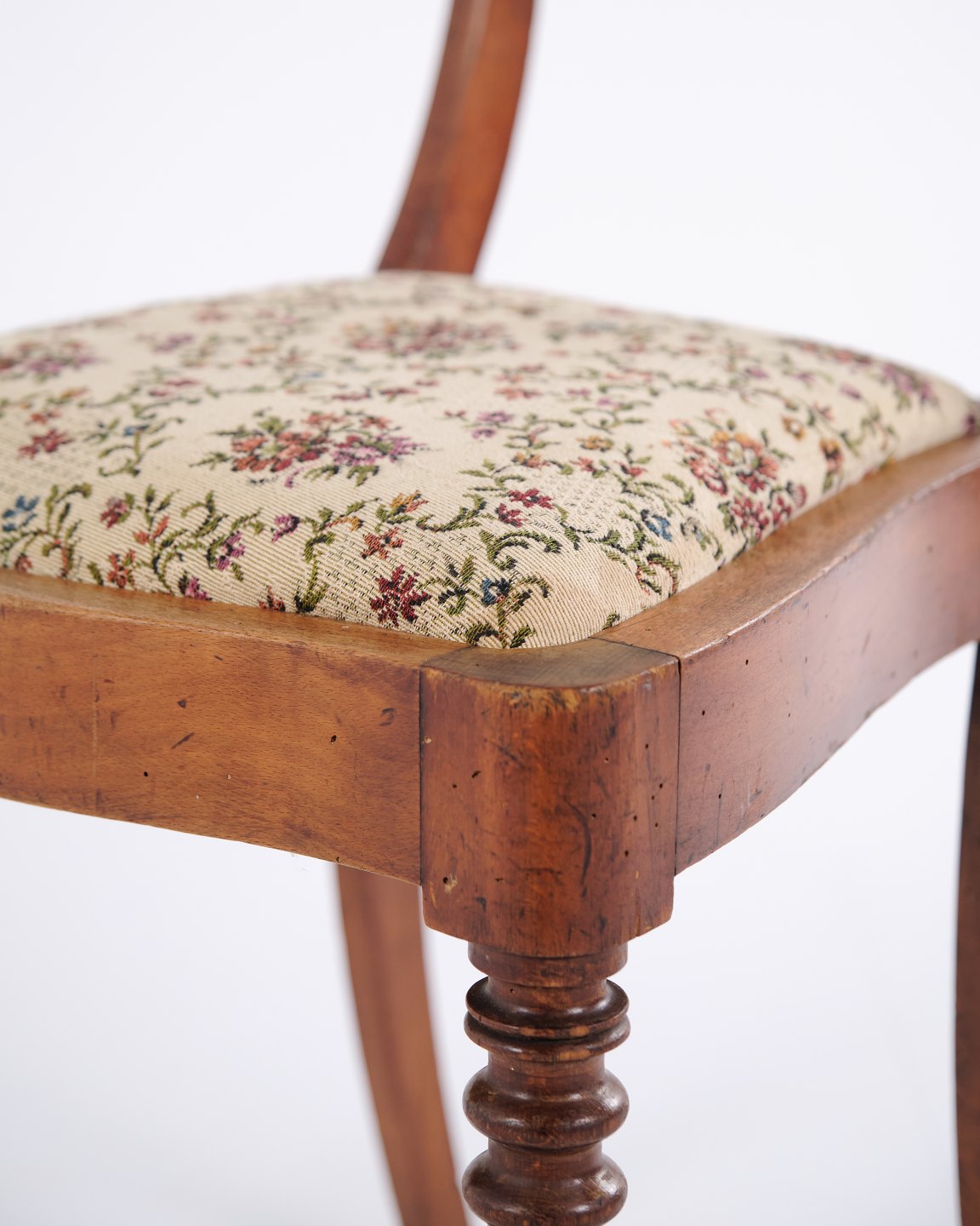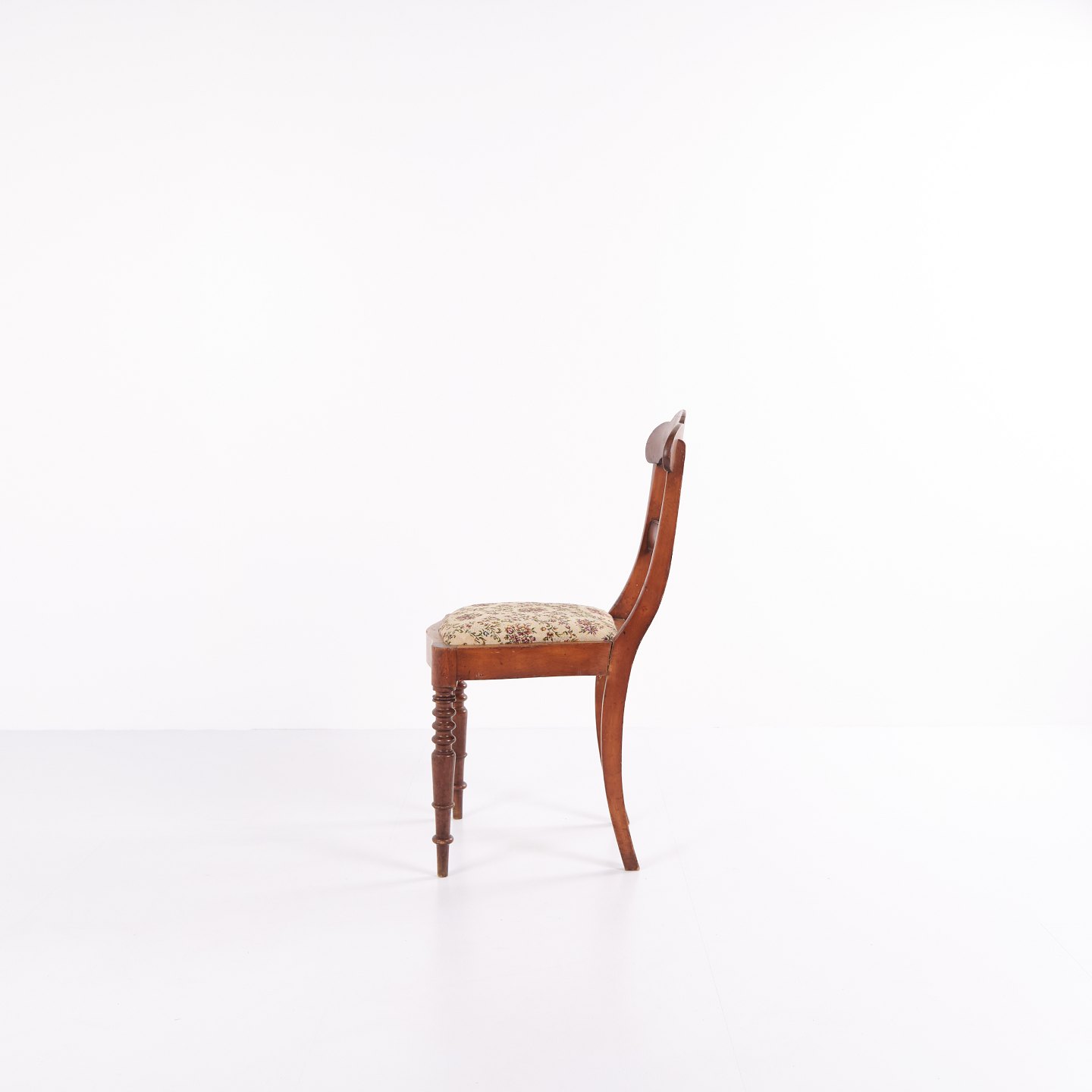 Spisebords- eller entréstol i sen Empire stil, udført i mahogni og polstret med blomstret stof. Klassisk design med tidstypiske linjer og let buet ryg. En dekorativ stol, der egner sig til både spiseområde og entré.