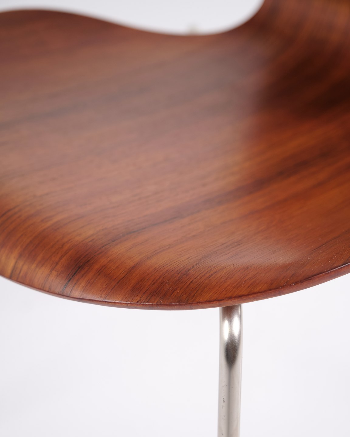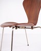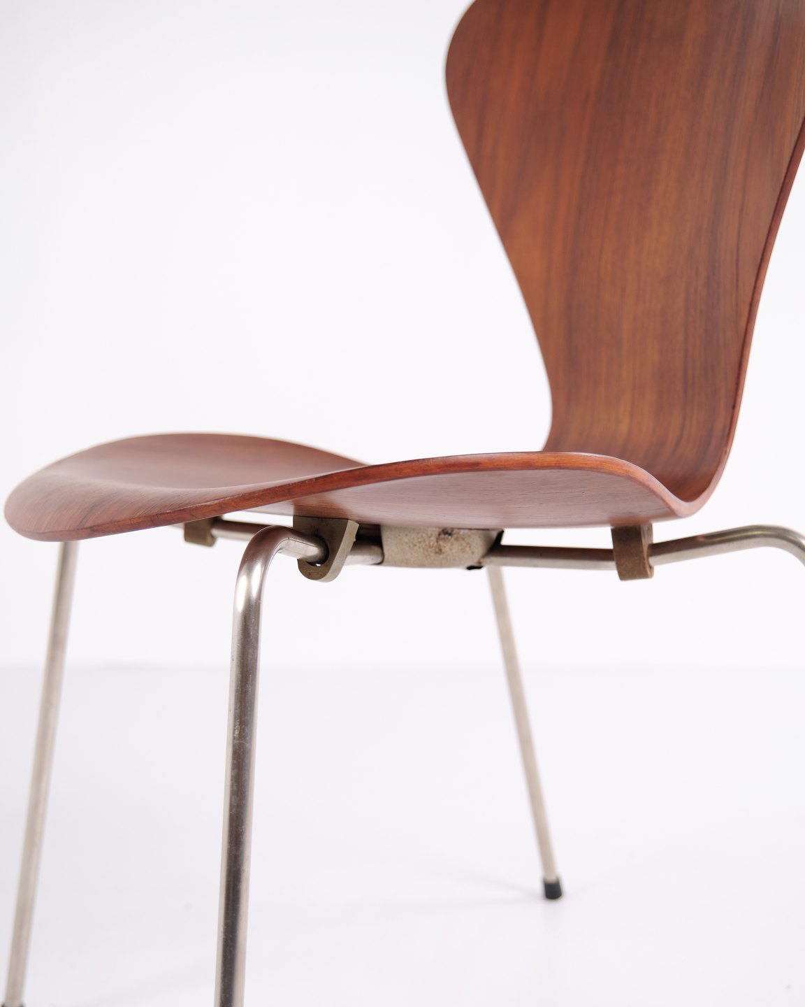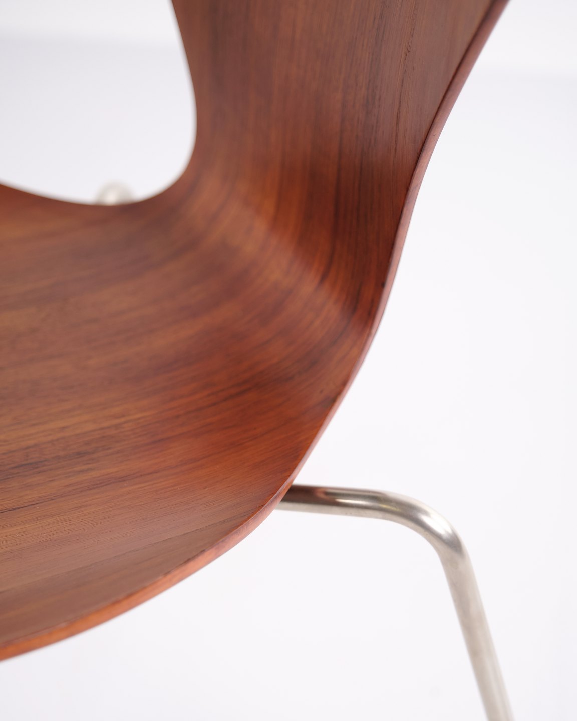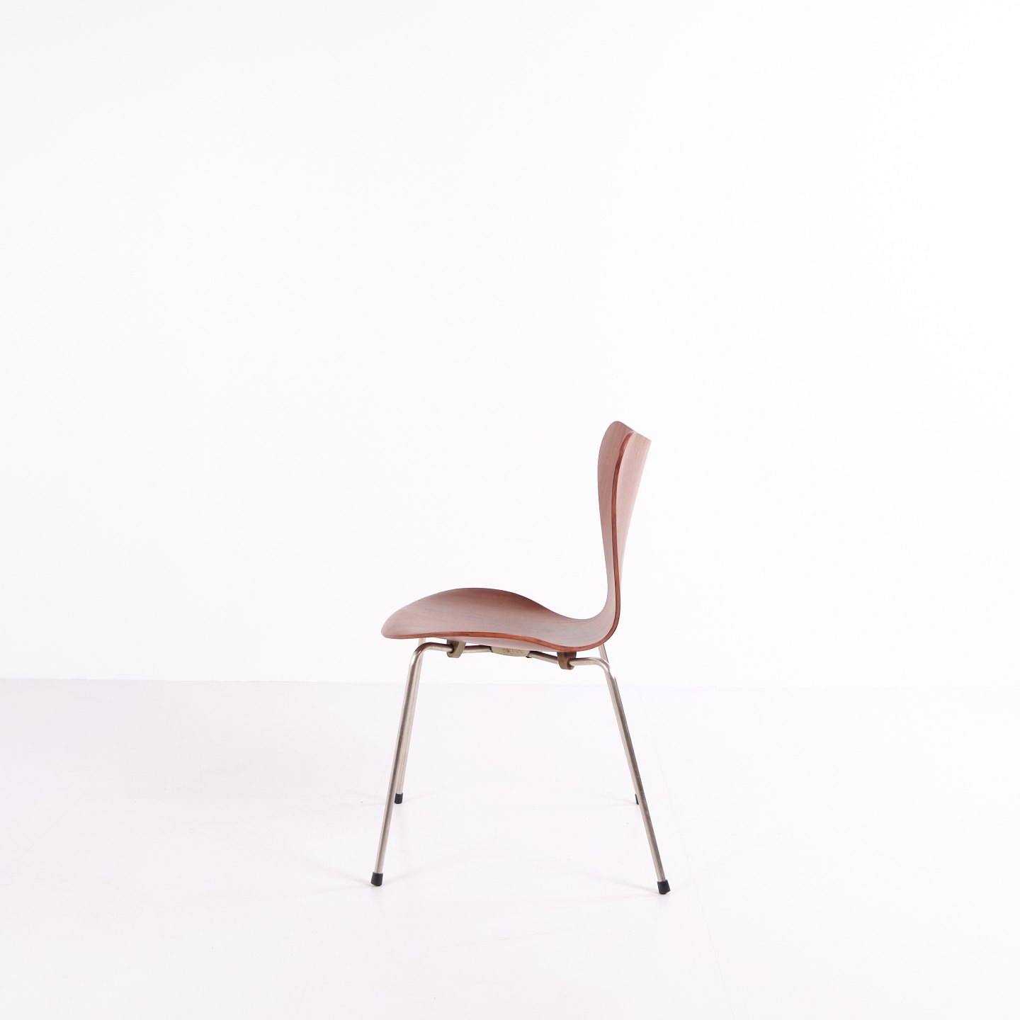 Set of six Series 7 chairs, model 3107, designed by Arne Jacobsen and produced by Fritz Hansen. Made in teak veneer with the characteristic moulded shell that makes the chair light, durable and comfortable. Model 3107 was introduced in 1955 and is today one of the most iconic dining chairs in Danish design.