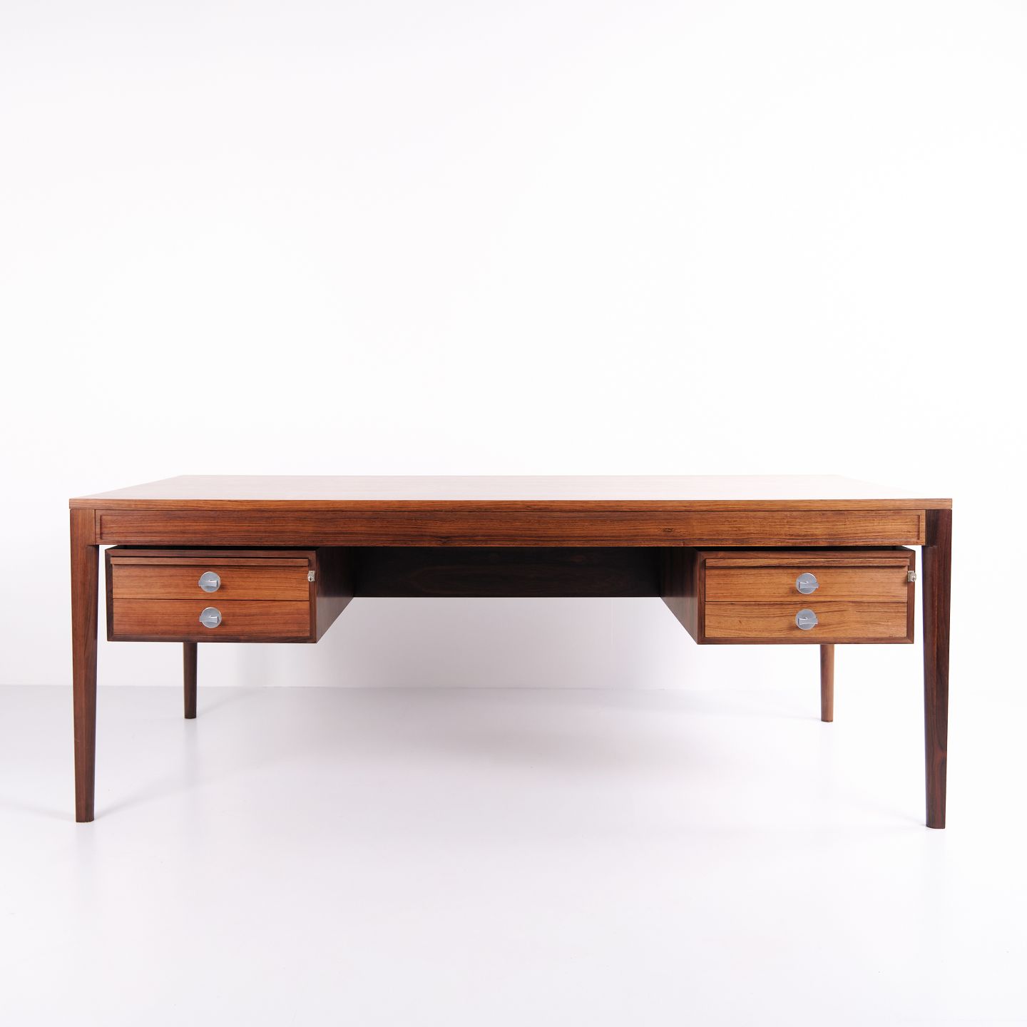 Diplomat skrivebord designet af Finn Juhl for France & Søn omkring 1961. Udført i palisander med rektangulær bordplade og to svævende skuffemoduler. Hvert modul rummer en udtræksskriveplade og to skuffer, alle med børstet stålgreb. Et eftertragtet Finn Juhl design med markant formsprog og eksklusive materialer.