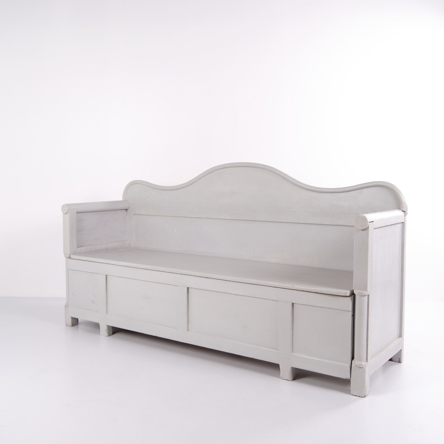 Antique Swedish bench from the 20th century, made in pine and painted grey. Classic Scandinavian design with storage space under the seat and characteristic period details. A solid piece suitable for hallway, kitchen or living room.
