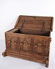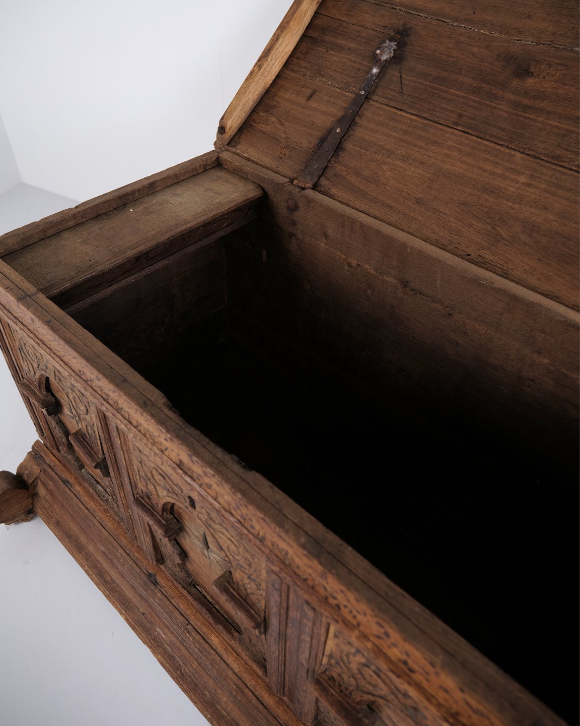 Chest from the 1860s, crafted in oak with hand-carved details and inlay work. A decorative and solid antique piece featuring characteristic craftsmanship from the period. Suitable for storage or as an interior accent.