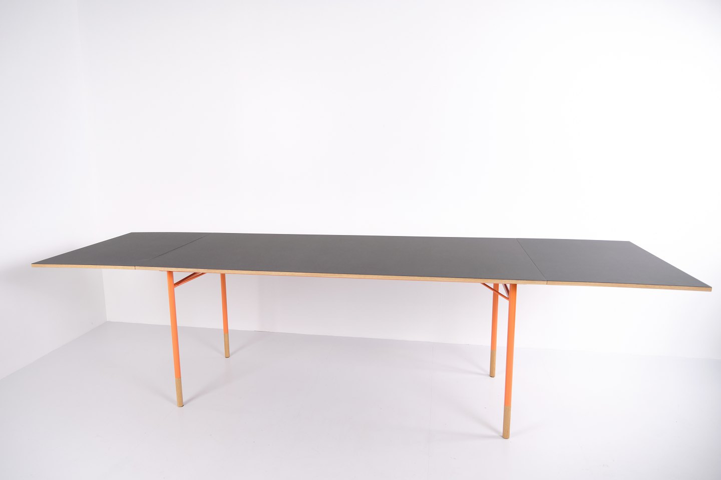 Nyhavn Dining table designed by Finn Juhl in 1953 and produced by House of Finn Juhl in 2015. The tabletop is finished in grey linoleum with oregon pine edges, supported by orange-lacquered steel legs with wooden feet. Includes two extension leaves of 54 cm each. A classic Finn Juhl design with characteristic materials and a light, elegant expression.